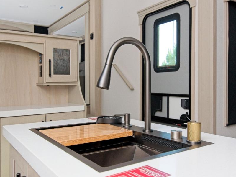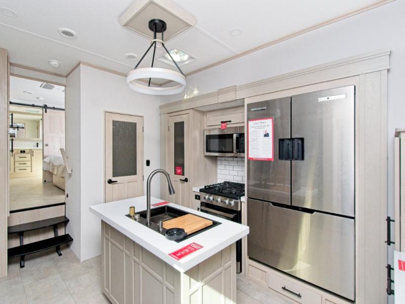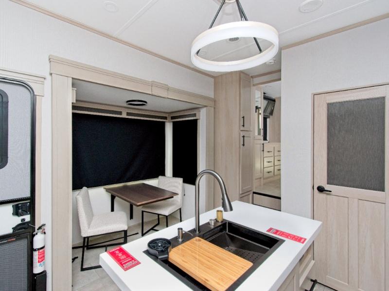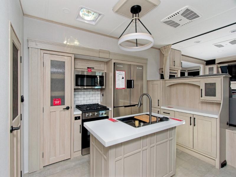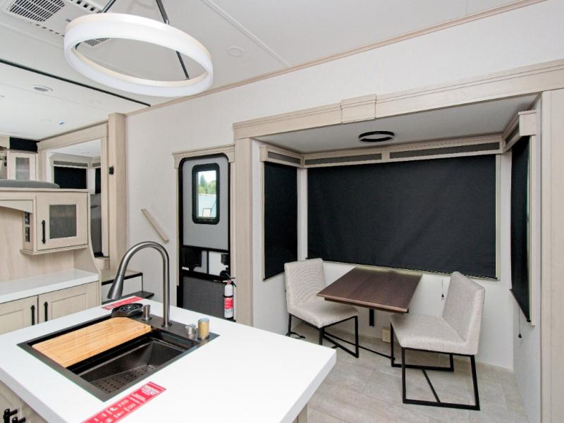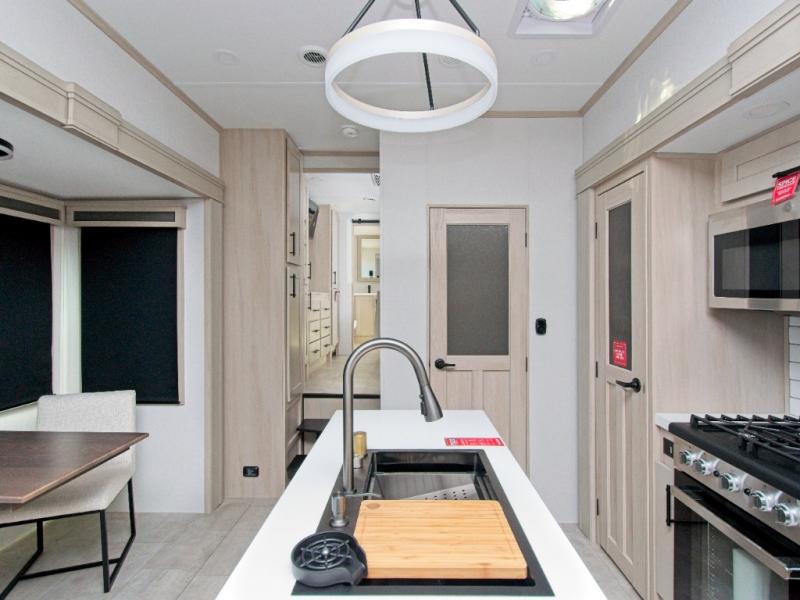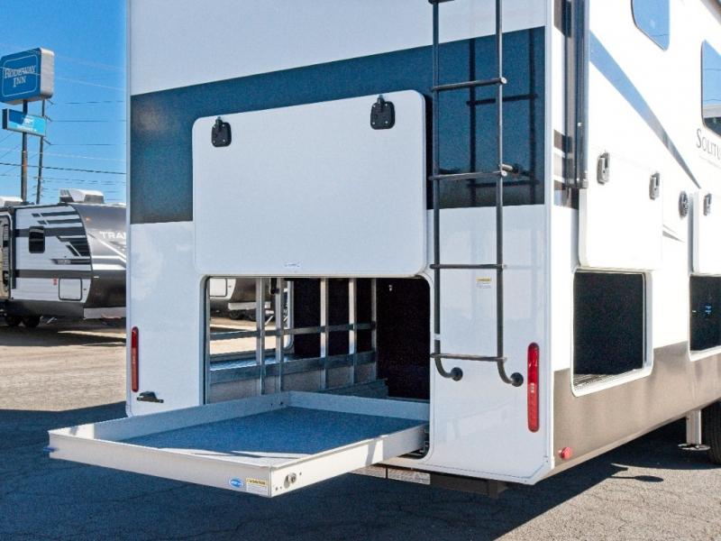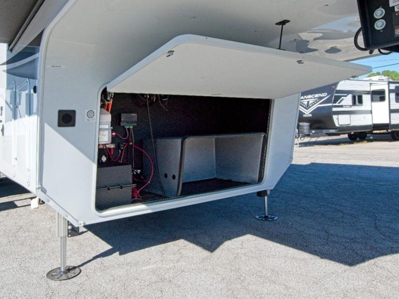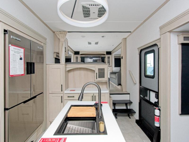Experience residential-style comfort and spacious living with the Grand Design Solitude 380FL, a luxury fifth wheel designed for extended stays and full-time RV living. With five slide-outs, this model offers expansive interior space, including a private front living area perfect for entertaining or relaxing.