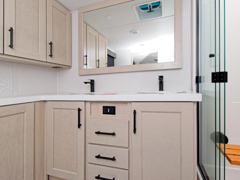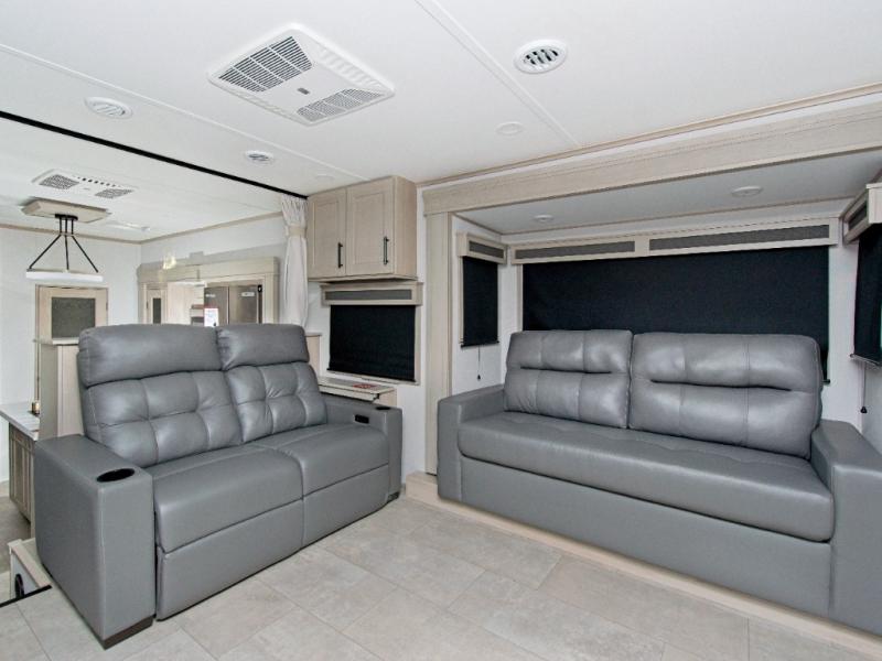 Enjoy spacious luxury with the Grand Design Solitude 380FL, featuring a private front living room and a rear full bath with dual-sink vanity for ultimate comfort on the road.