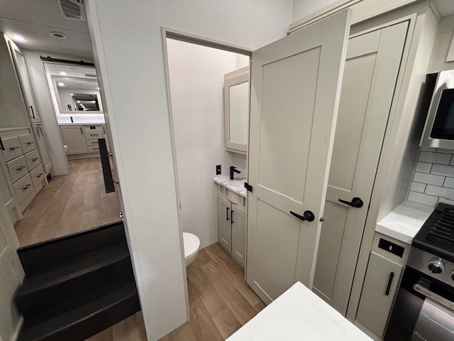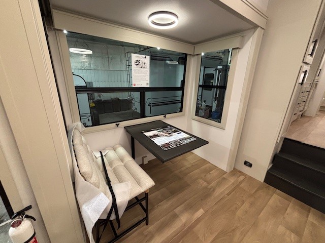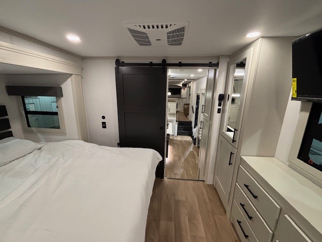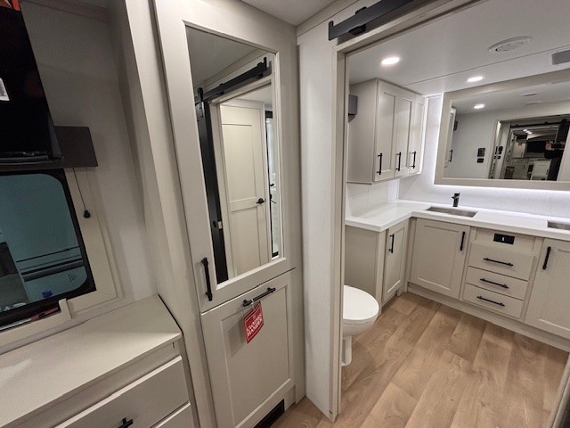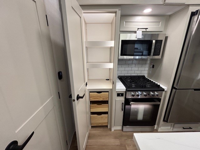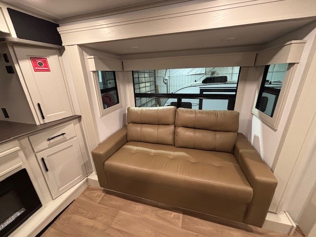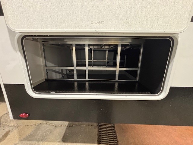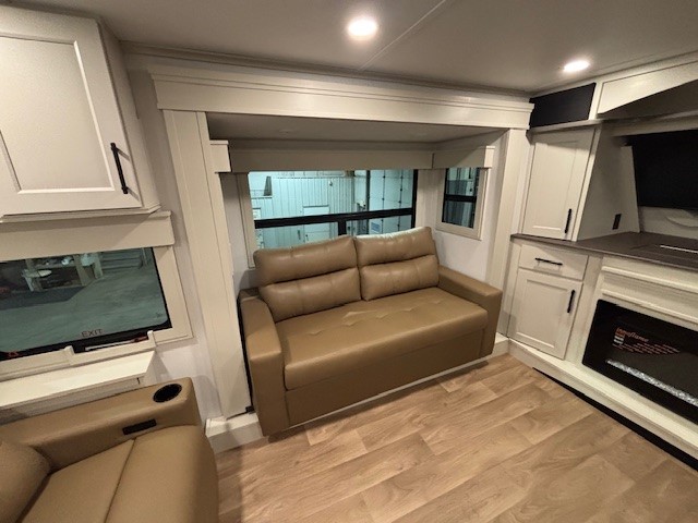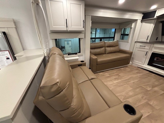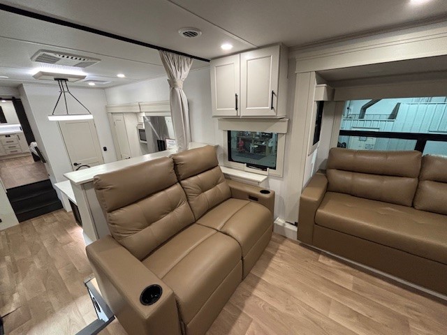Five slide outs, a full bathroom with dual sinks, a half bath off of the kitchen, and a separate front living room and entertainment area are a few reasons you will enjoy your time spent in this fifth wheel! The separate kitchen is a dream with stainless steel appliances including a built-in oven, a pantry and hutch with counter space, a kitchen island plus a free-standing dinette slide with windows for great views. The entertainment center offers an LED Smart TV with a fireplace below and storage, and the dual opposing tri-fold sofas provide added sleeping space at night. The master bedroom includes a queen bed plus space savings sliding doors that lead you to the rear full bathroom with dual sinks, linen storage, and washer/dryer prep. The exterior has several storage choices as well including a pass-through compartment for fishing poles and such, plus the unique sliding tray in the rear allows you to bring along larger items such as camping tables, portable grills, golf clubs, totes and more.