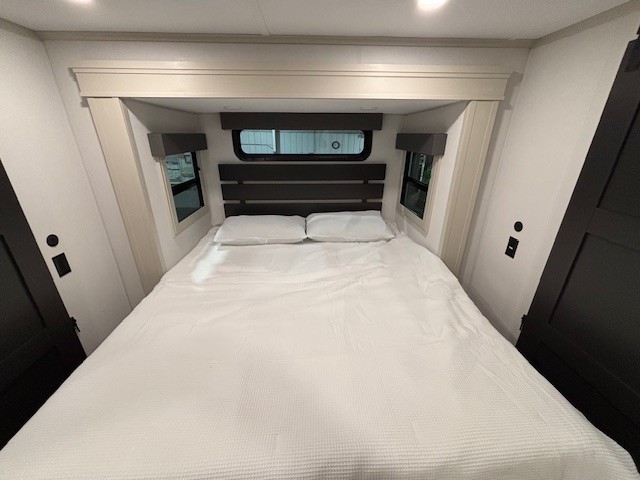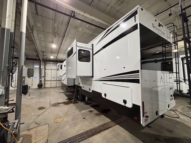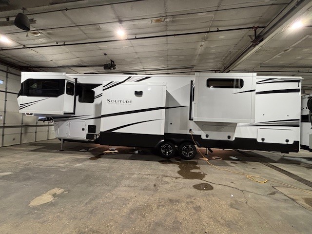 Each Solitude fifth wheel by Grand Design features a 101" wide-body construction, heavy duty 8,000 lb. axles, frameless tinted windows, and high-gloss gel coat sidewalls. You can camp year around thanks to the Weather-Tek Package that includes a 35K BTU high-capacity furnace, an all-in-one enclosed and heated utility center, and a fully enclosed underbelly with heated tanks and storage. Inside, you'll love the premium roller shades, hardwood cabinet doors, solid surface countertops, plus residential finishes throughout to make you truly feel at home. Each model also includes a MORryde CRE3000 suspension system, self adjusting brakes, and a MORryde pin box that will provide smooth towing from home to campground. Affordable luxury is possible with the Solitude fifth wheels; choose yours today!
