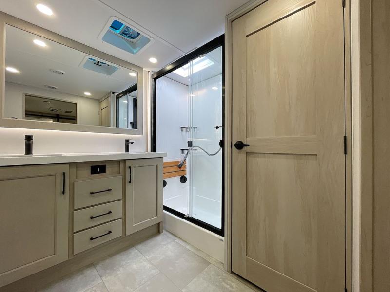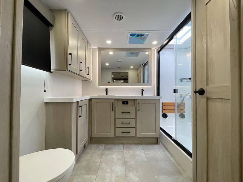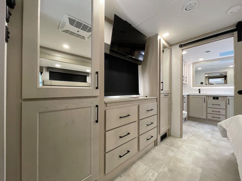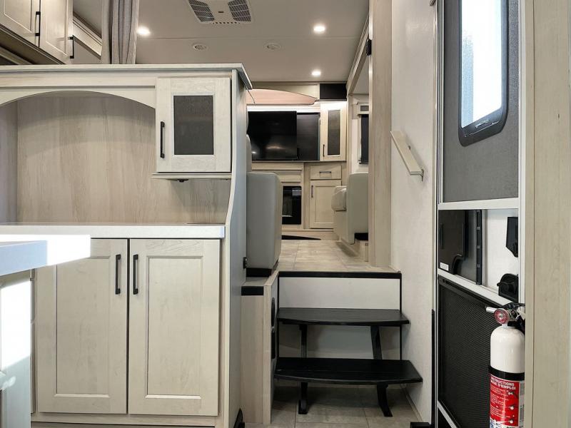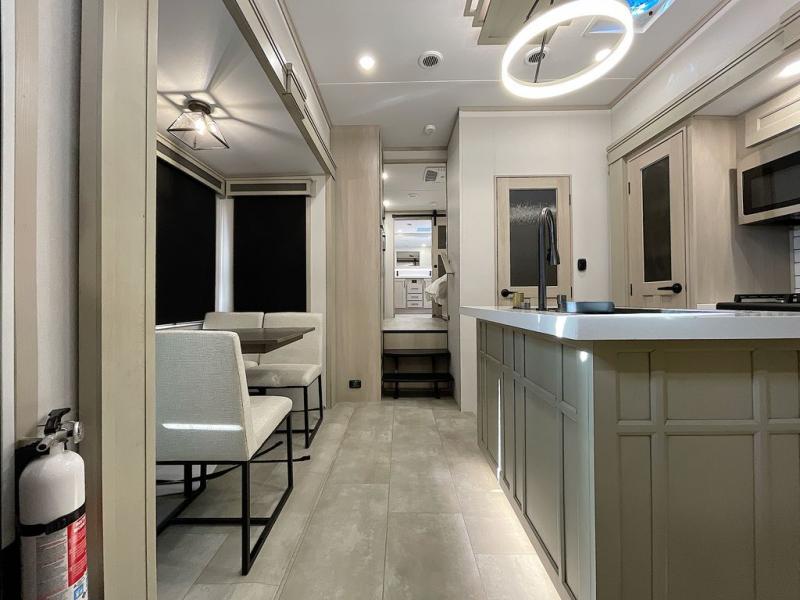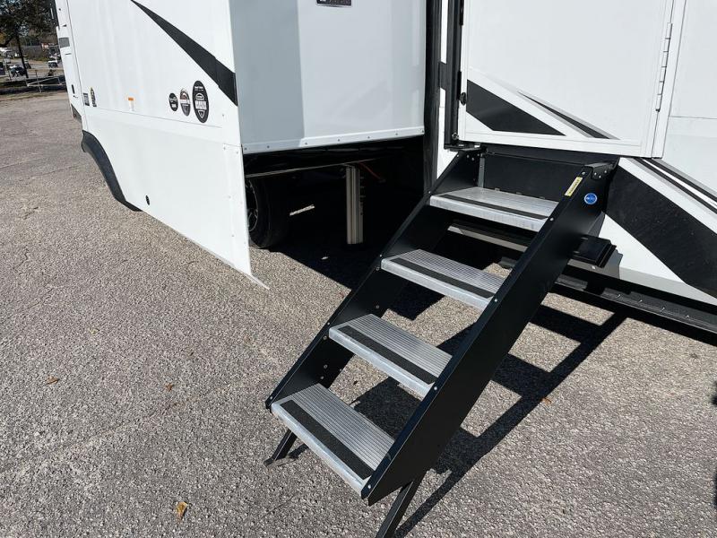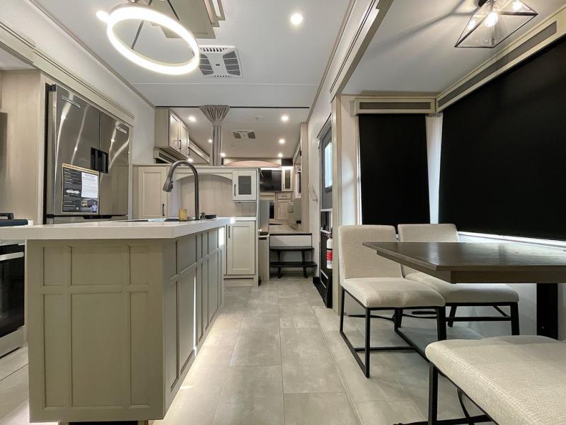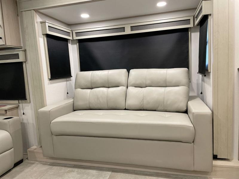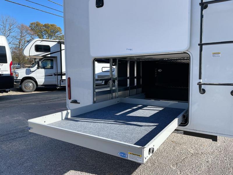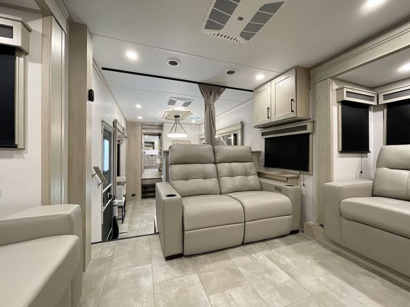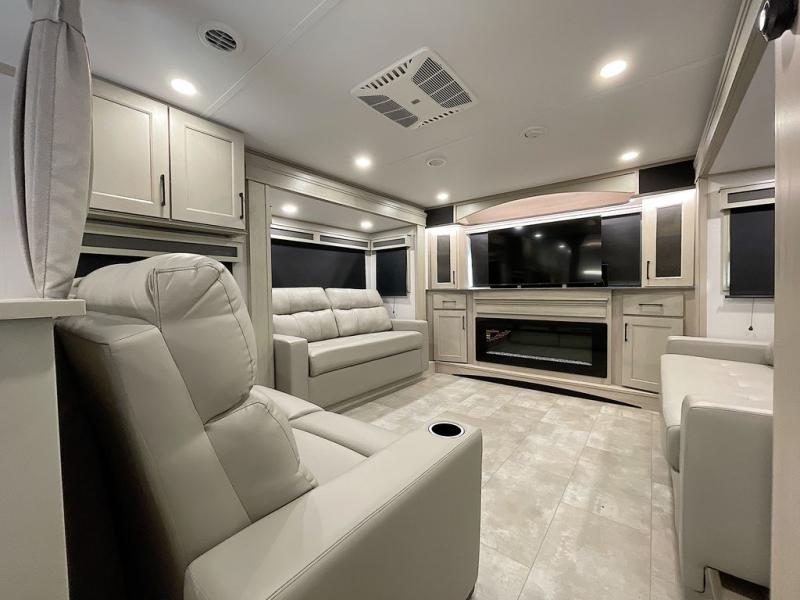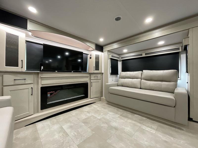 Five slide outs, a full bathroom with dual sinks, a half bath off of the kitchen, and a separate front living room and entertainment area are a few reasons you will enjoy your time spent in this fifth wheel! The separate kitchen is a dream with stainless steel appliances including a built-in oven, a pantry and hutch with counter space, a kitchen island plus a free-standing dinette slide with windows for great views. The entertainment center offers an LED Smart TV with a fireplace below and storage, and the dual opposing tri-fold sofas provide added sleeping space at night. The master bedroom includes a queen bed plus space savings sliding doors that lead you to the rear full bathroom with dual sinks, linen storage, and washer/dryer prep. The exterior has several storage choices as well including a pass-through compartment for fishing poles and such, plus the unique sliding tray in the rear allows you to bring along larger items such as camping tables, portable grills, golf clubs, totes and more.