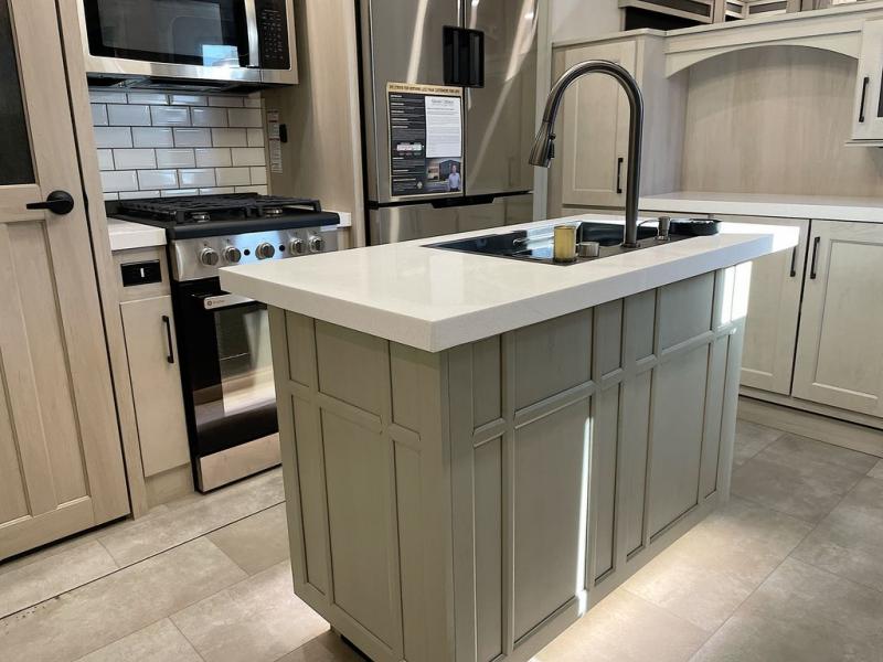 Each Solitude fifth wheel by Grand Design features a 101" wide-body construction, heavy duty 8,000 lb. axles, frameless tinted windows, and high-gloss gel coat sidewalls. You can camp year around thanks to the Weather-Tek Package that includes a 35K BTU high-capacity furnace, an all-in-one enclosed and heated utility center, and a fully enclosed underbelly with heated tanks and storage. Inside, you'll love the premium roller shades, hardwood cabinet doors, solid surface countertops, plus residential finishes throughout to make you truly feel at home. Each model also includes a MORryde CRE3000 suspension system, self adjusting brakes, and a MORryde pin box that will provide smooth towing from home to campground. Affordable luxury is possible with the Solitude fifth wheels; choose yours today!
