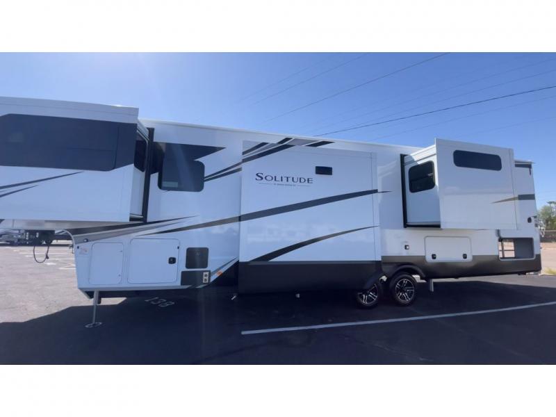 Each Solitude fifth wheel by Grand Design features a 101" wide-body construction, heavy duty 8,000 lb. axles, frameless tinted windows, and high-gloss gel coat sidewalls. You can camp year around thanks to the Weather-Tek Package that includes a 35K BTU high-capacity furnace, an all-in-one enclosed and heated utility center, and a fully enclosed underbelly with heated tanks and storage. Inside, you'll love the premium roller shades, hardwood cabinet doors, solid surface countertops, plus residential finishes throughout to make you truly feel at home. Each model also includes a MORryde CRE3000 suspension system, self adjusting brakes, and a MORryde pin box that will provide smooth towing from home to campground. Affordable luxury is possible with the Solitude fifth wheels; choose yours today!