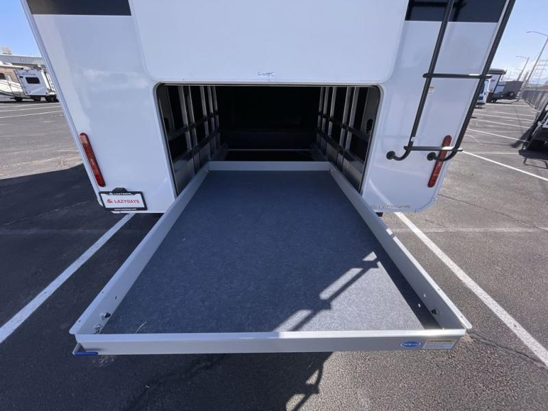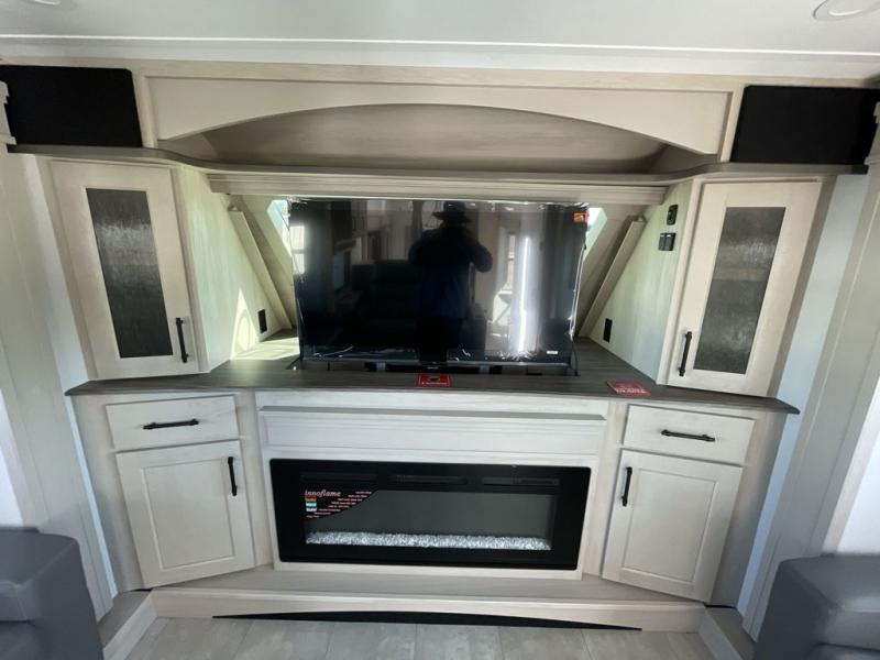 Five slide outs, a full bathroom with dual sinks, a half bath off of the kitchen, and a separate front living room and entertainment area are a few reasons you will enjoy your time spent in this fifth wheel! The separate kitchen is a dream with stainless steel appliances including a built-in oven, a pantry and hutch with counter space, a kitchen island plus a free-standing dinette slide with windows for great views. The entertainment center offers an LED Smart TV with a fireplace below and storage, and the dual opposing tri-fold sofas provide added sleeping space at night. The master bedroom includes a queen bed plus space savings sliding doors that lead you to the rear full bathroom with dual sinks, linen storage, and washer/dryer prep. The exterior has several storage choices as well including a pass-through compartment for fishing poles and such, plus the unique sliding tray in the rear allows you to bring along larger items such as camping tables, portable grills, golf clubs, totes and more.