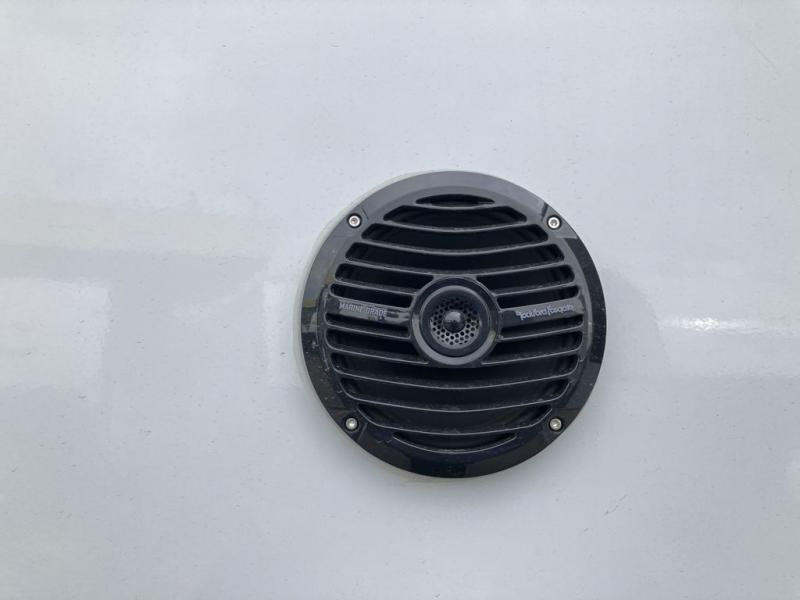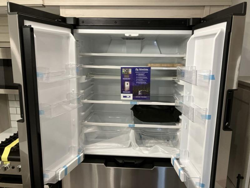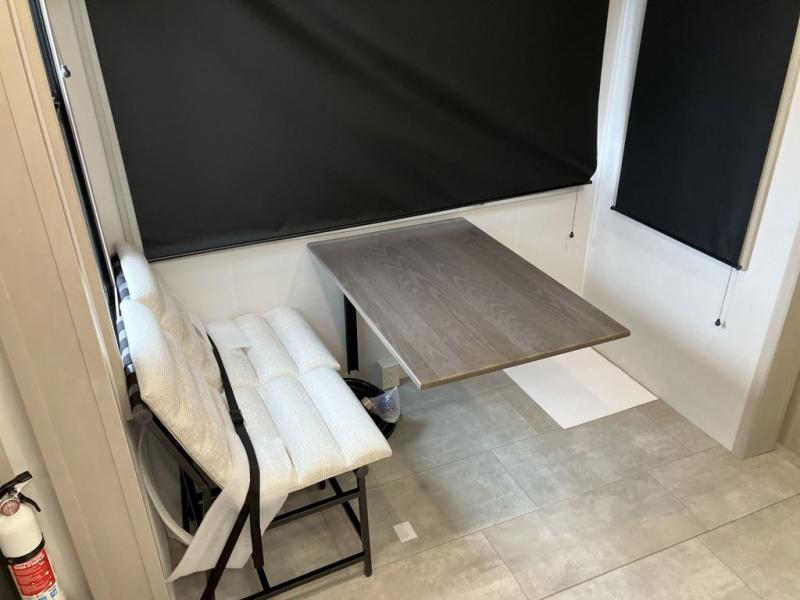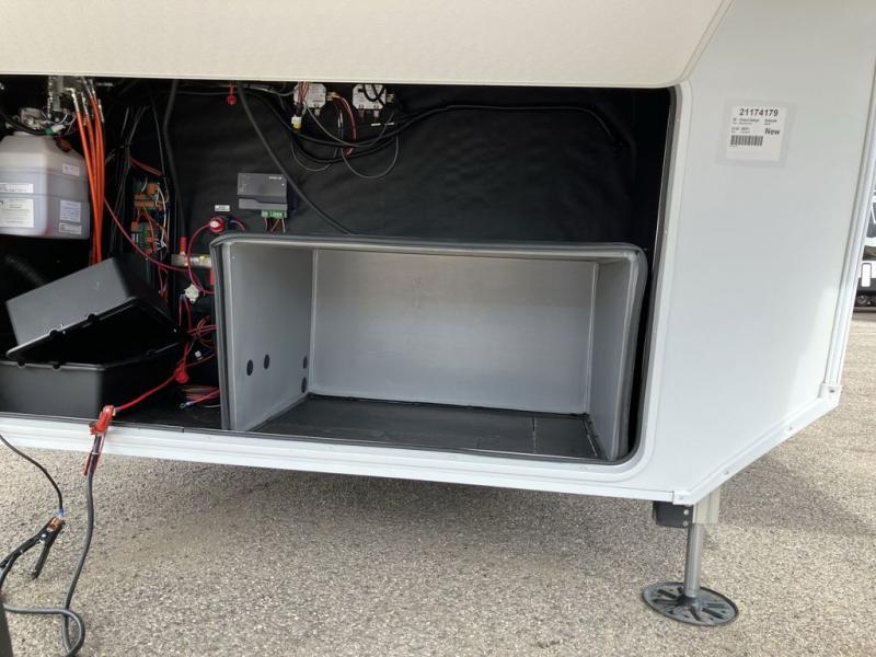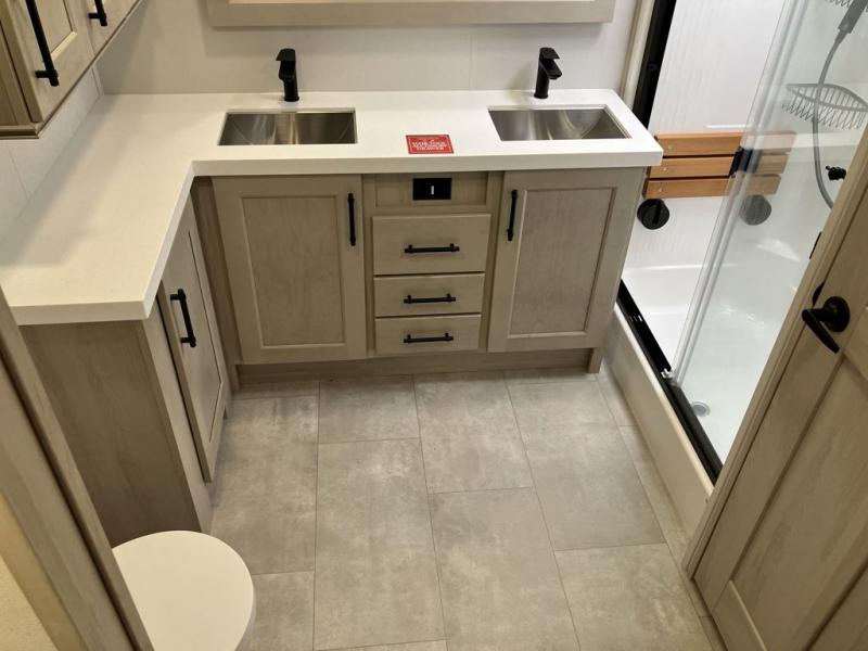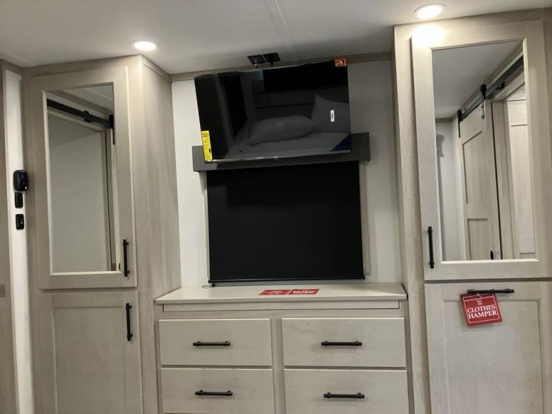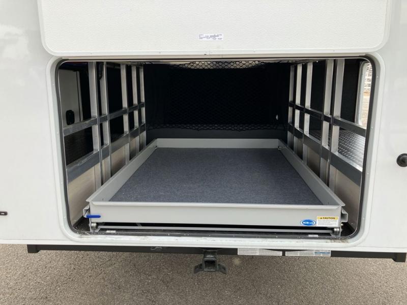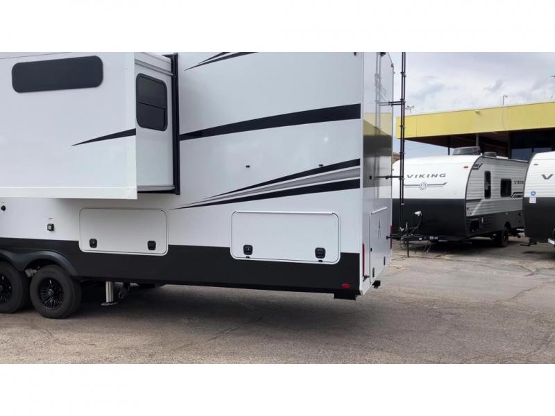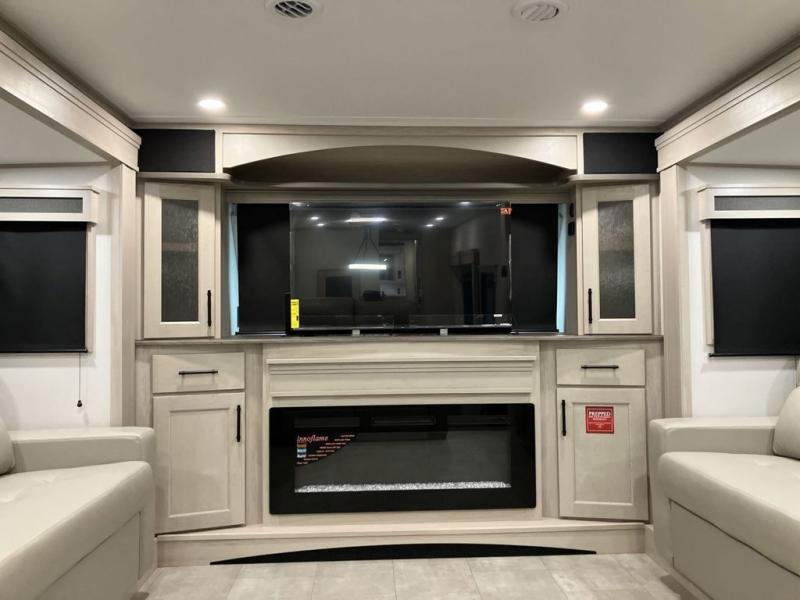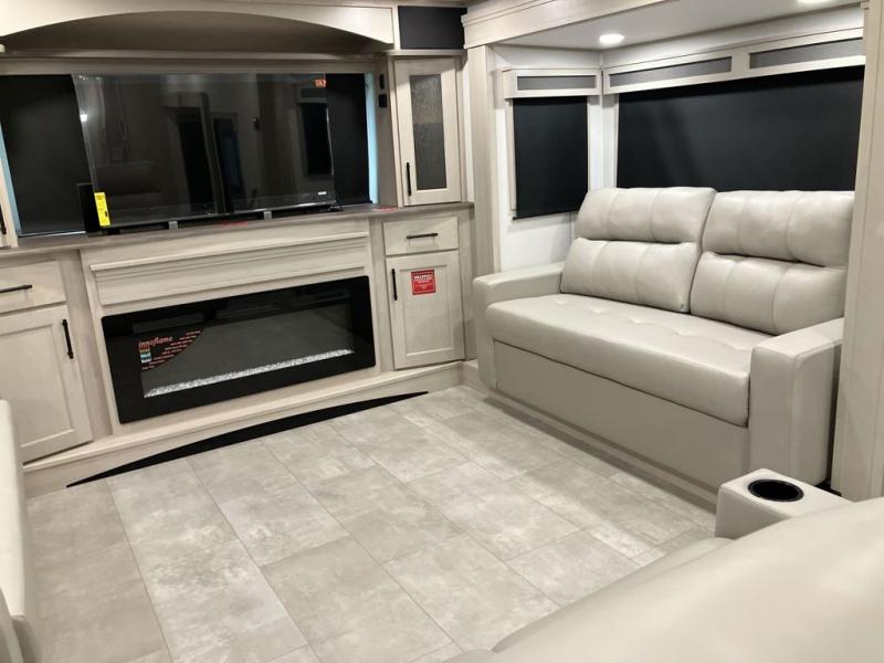Five slide outs, a full bathroom with dual sinks, a half bath off of the kitchen, and a separate front living room and entertainment area are a few reasons you will enjoy your time spent in this fifth wheel! The separate kitchen is a dream with stainless steel appliances including a built-in oven, a pantry and hutch with counter space, a kitchen island plus a free-standing dinette slide with windows for great views. The entertainment center offers an LED Smart TV with a fireplace below and storage, and the dual opposing tri-fold sofas provide added sleeping space at night. The master bedroom includes a queen bed plus space savings sliding doors that lead you to the rear full bathroom with dual sinks, linen storage, and washer/dryer prep. The exterior has several storage choices as well including a pass-through compartment for fishing poles and such, plus the unique sliding tray in the rear allows you to bring along larger items such as camping tables, portable grills, golf clubs, totes and more.