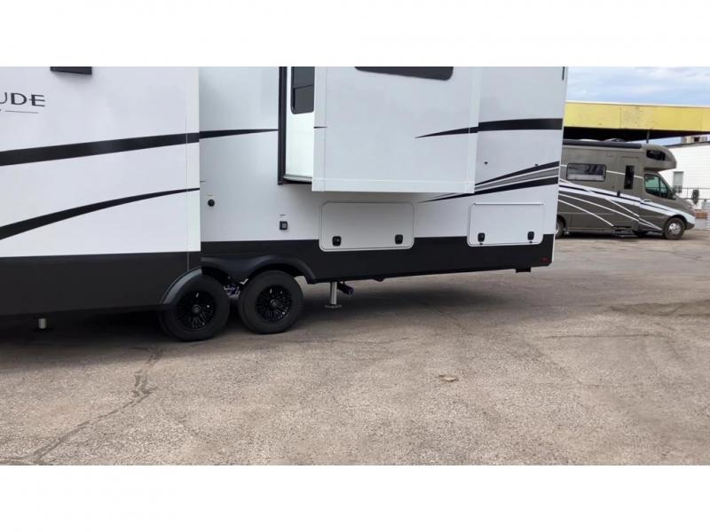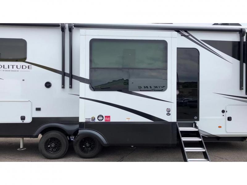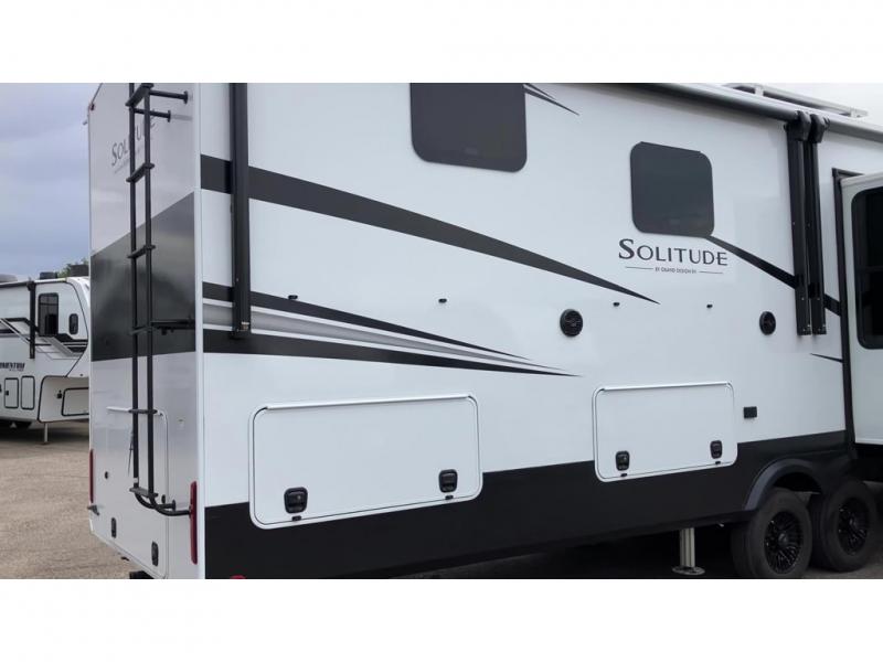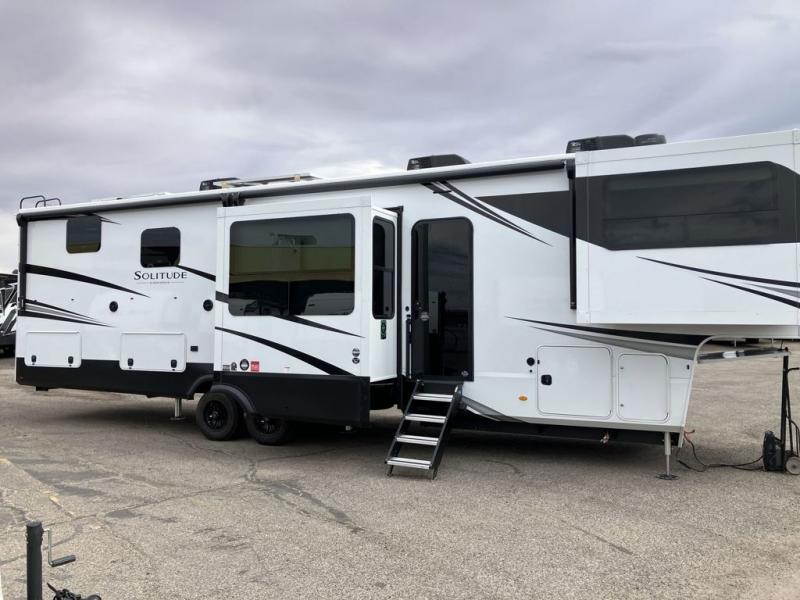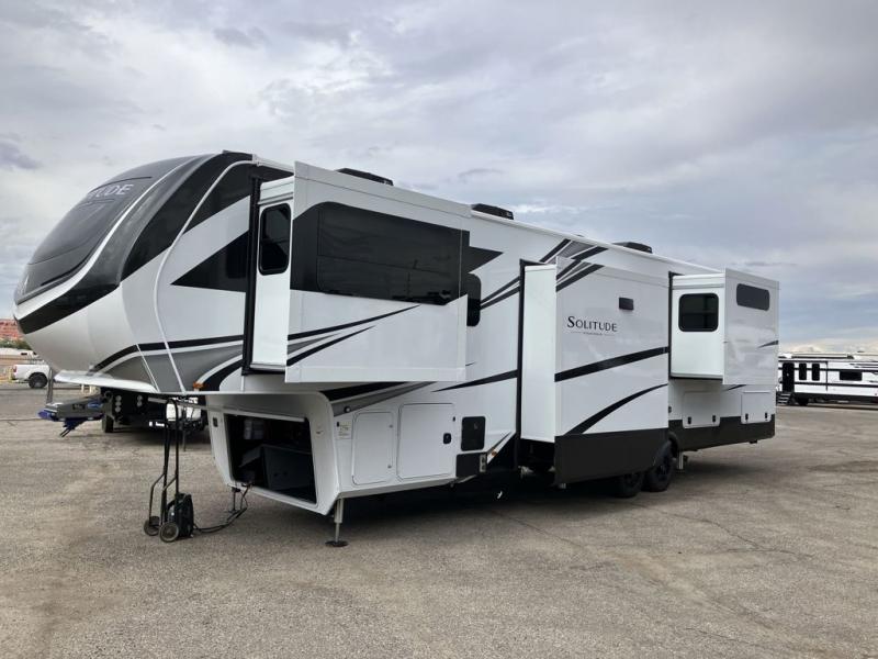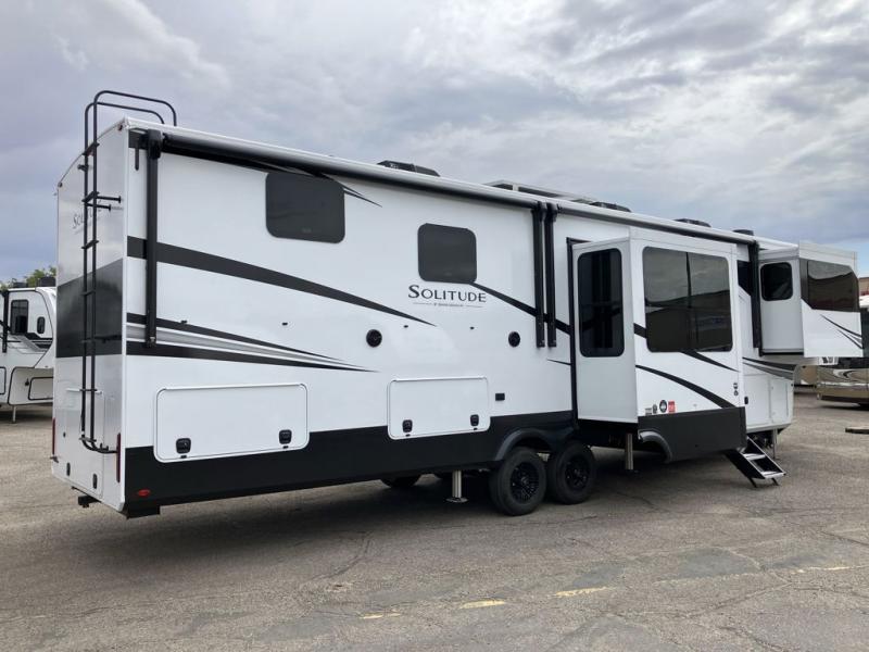 Each Solitude fifth wheel by Grand Design features a 101" wide-body construction, heavy duty 8,000 lb. axles, frameless tinted windows, and high-gloss gel coat sidewalls. You can camp year around thanks to the Weather-Tek Package that includes a 35K BTU high-capacity furnace, an all-in-one enclosed and heated utility center, and a fully enclosed underbelly with heated tanks and storage. Inside, you'll love the premium roller shades, hardwood cabinet doors, solid surface countertops, plus residential finishes throughout to make you truly feel at home. Each model also includes a MORryde CRE3000 suspension system, self adjusting brakes, and a MORryde pin box that will provide smooth towing from home to campground. Affordable luxury is possible with the Solitude fifth wheels; choose yours today!
