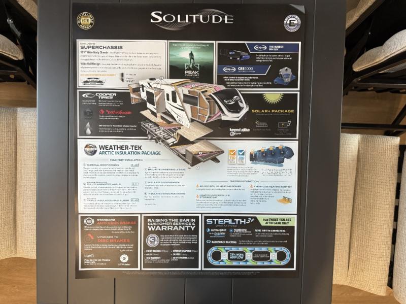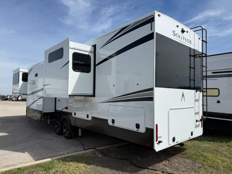 Each Solitude fifth wheel by Grand Design features a 101" wide-body construction, heavy duty 8,000 lb. axles, frameless tinted windows, and high-gloss gel coat sidewalls. You can camp during harsh weather thanks to the Weather-Tek Package that includes a 35K BTU high-capacity furnace, an all-in-one enclosed and heated utility center, and a fully enclosed underbelly with heated tanks and storage. Inside, you'll love the premium roller shades, hardwood cabinet doors, solid surface countertops, plus residential finishes throughout to make you truly feel at home. Each model also includes a MORryde CRE3000 suspension system, and a MORryde pin box that will provide smooth towing from home to campground. Affordable luxury is possible with the Solitude fifth wheels; choose yours today!