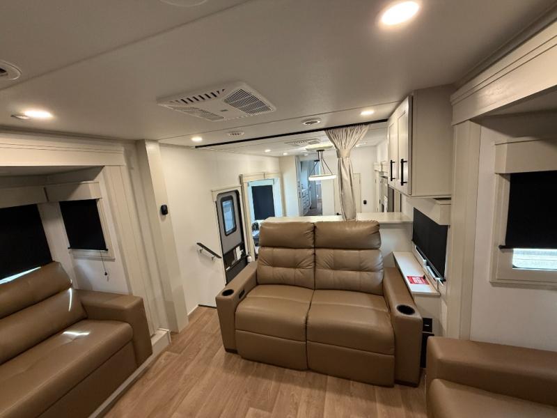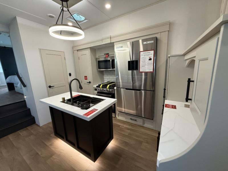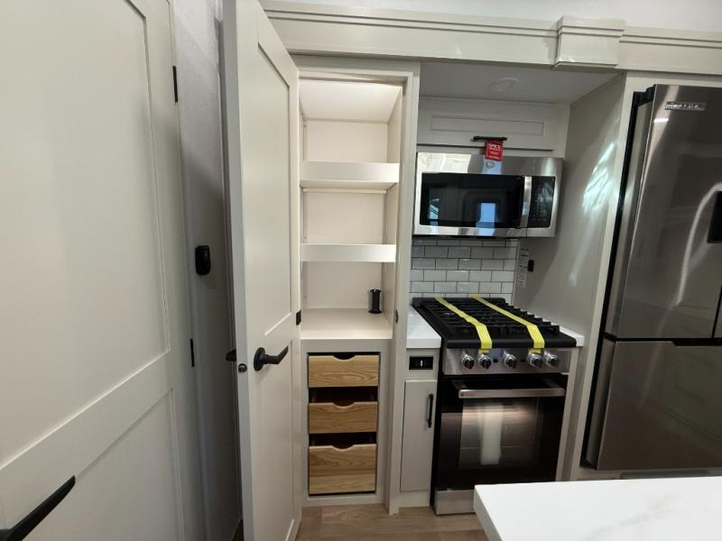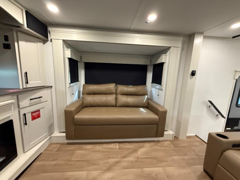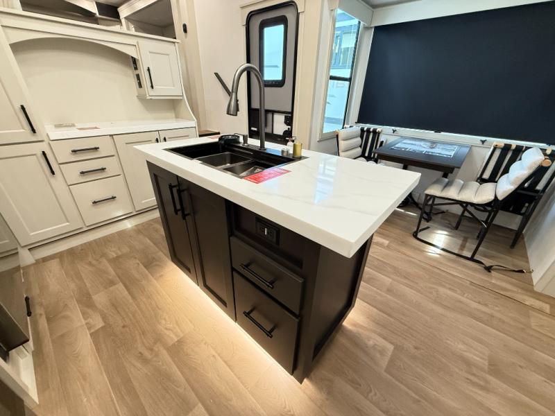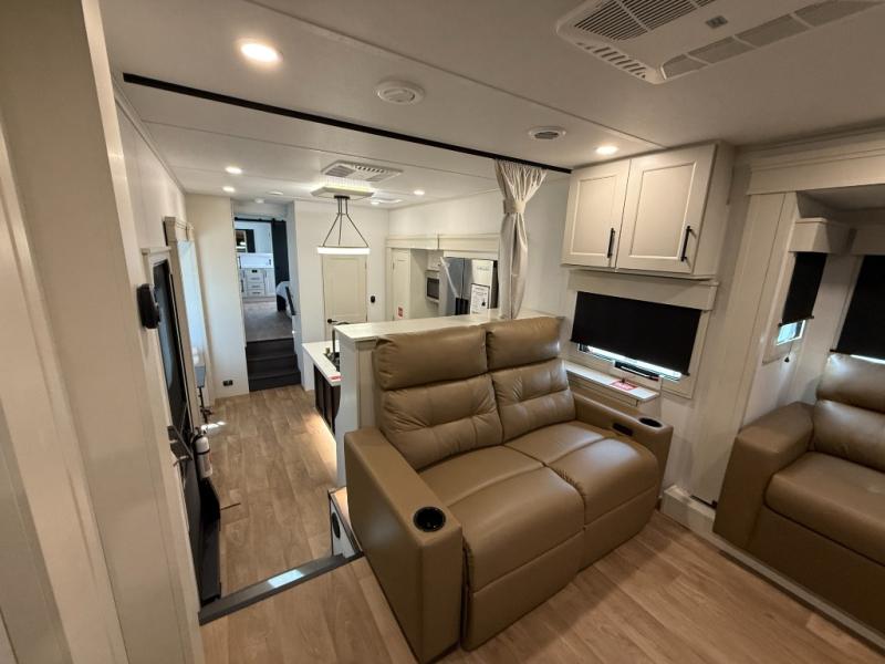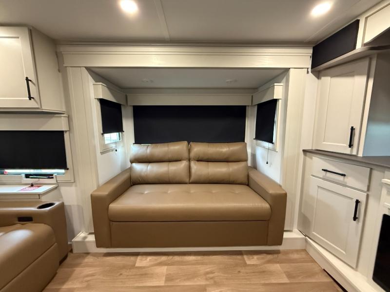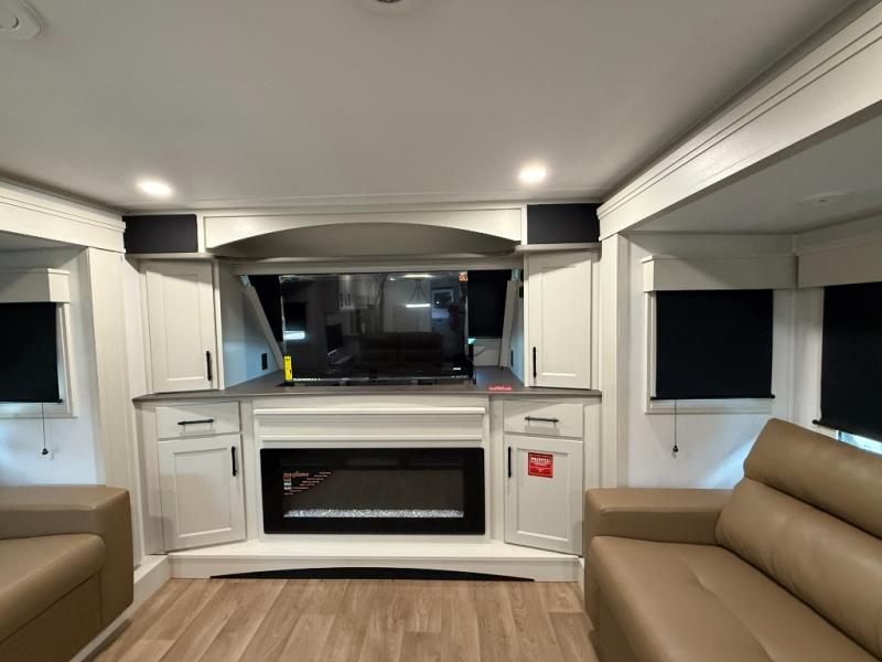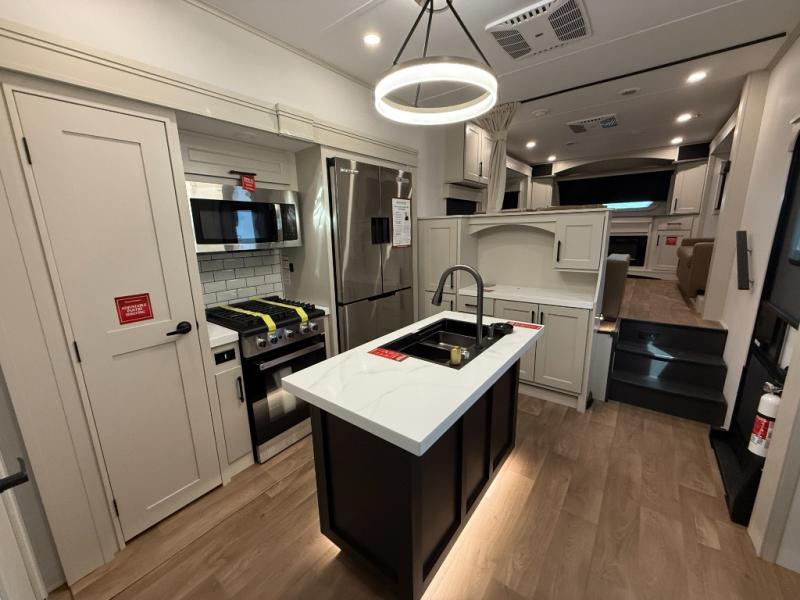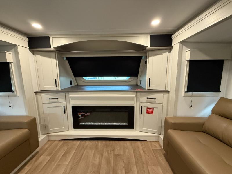 Five slide outs, a full bathroom with dual sinks, a half bath off of the kitchen, and a separate front living room and entertainment area are a few reasons you will enjoy your time spent in this fifth wheel! The separate kitchen is a dream with stainless steel appliances including a built-in oven, a pantry and hutch with counter space, a kitchen island plus a free-standing dinette slide with windows for great views. The entertainment center offers an LED Smart TV with a fireplace below and storage, and the dual opposing tri-fold sofas provide added sleeping space at night. The master bedroom includes a queen bed plus space savings sliding doors that lead you to the rear full bathroom with dual sinks, linen storage, and washer/dryer prep. The exterior has several storage choices as well including a pass-through storage compartment for fishing poles and such, plus the unique sliding tray in the rear allows you to bring along larger items such as camping tables, portable grills, golf clubs, totes and more.