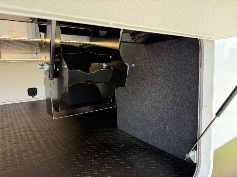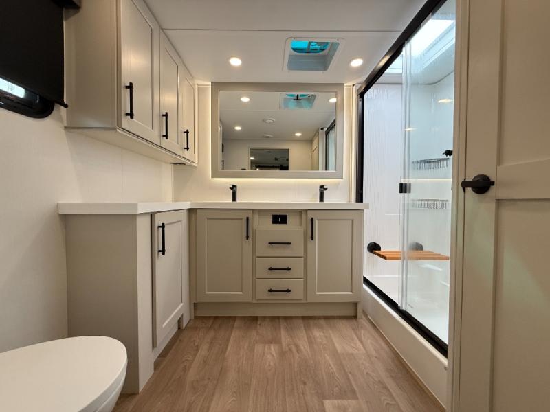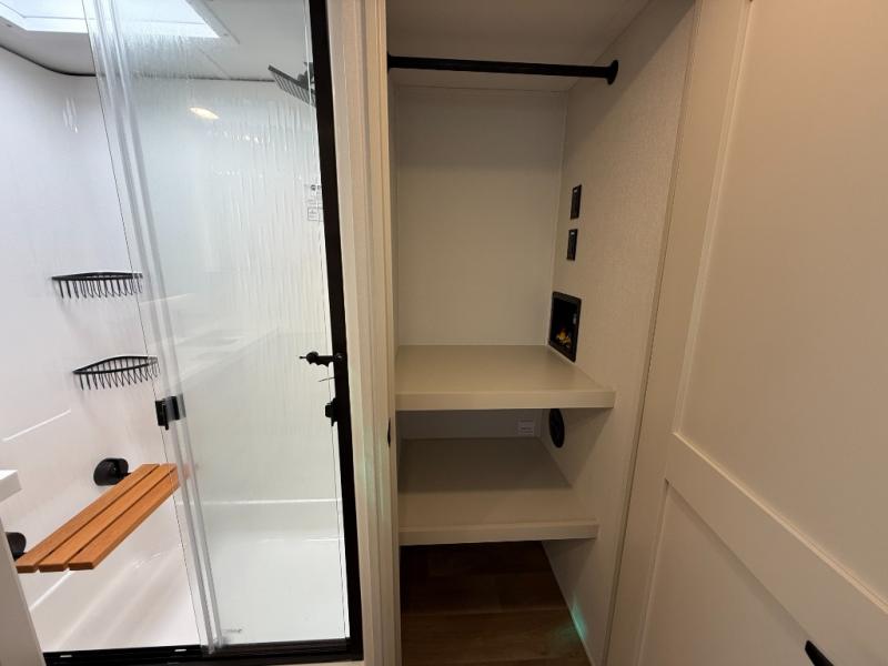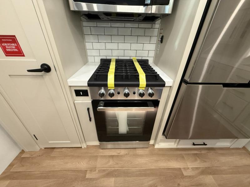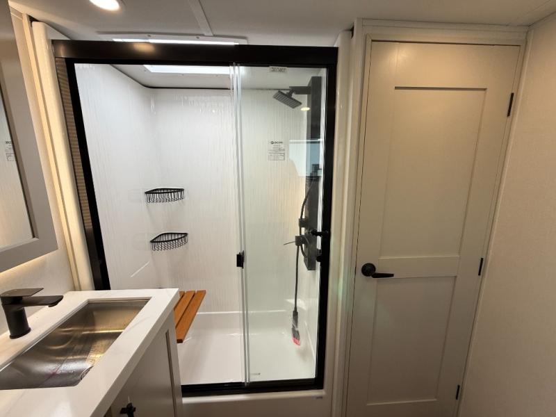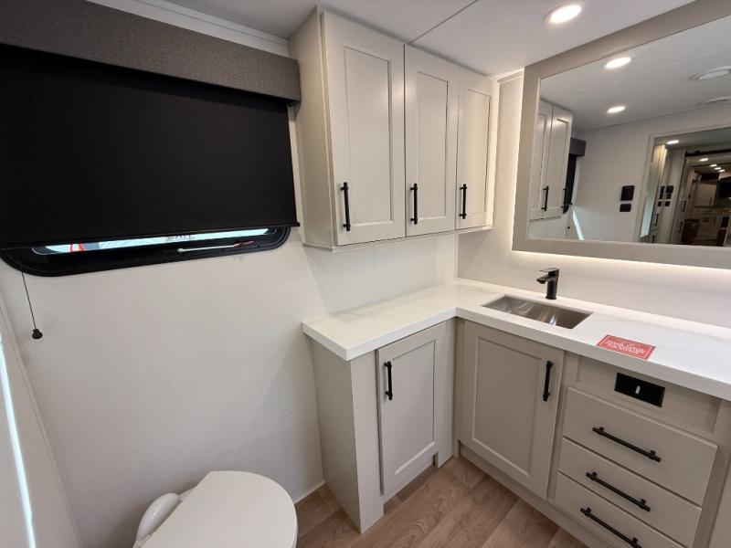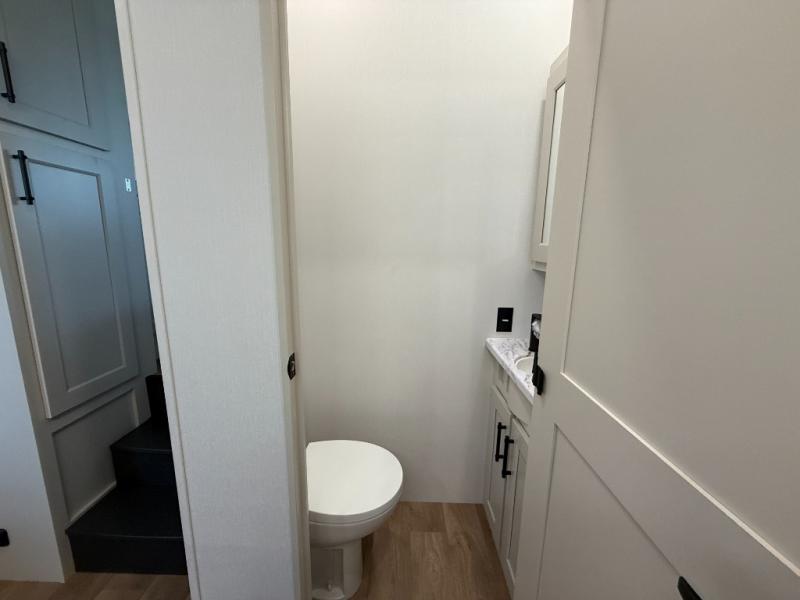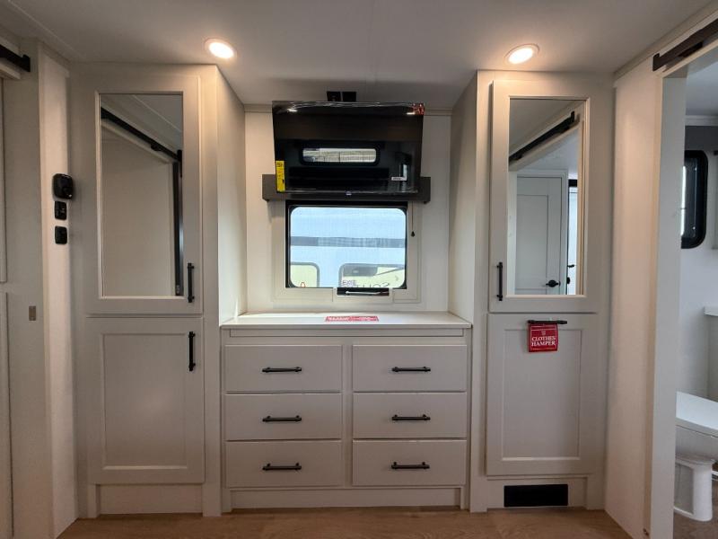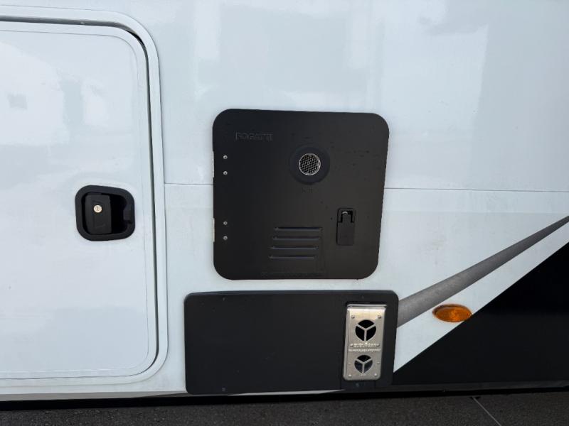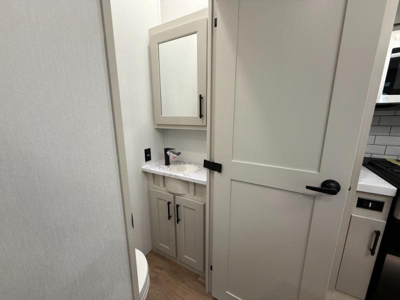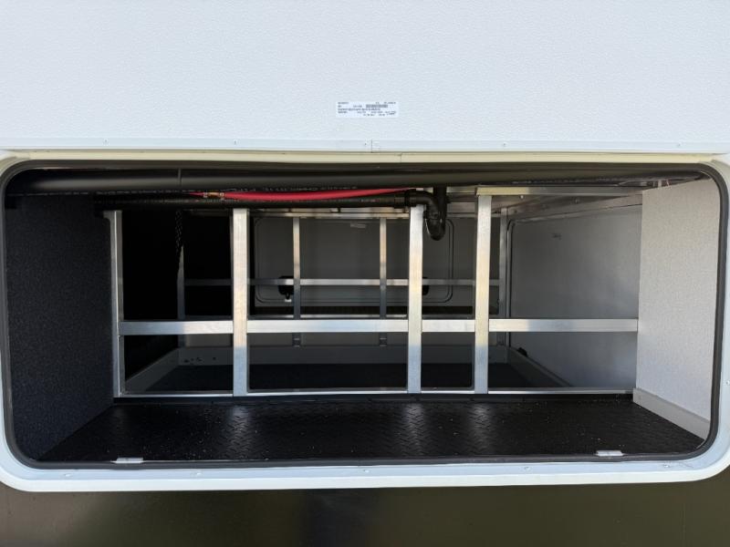 Five slide outs, a full bathroom with dual sinks, a half bath off of the kitchen, and a separate front living room and entertainment area are a few reasons you will enjoy your time spent in this fifth wheel! The separate kitchen is a dream with stainless steel appliances including a built-in oven, a pantry and hutch with counter space, a kitchen island plus a free-standing dinette slide with windows for great views. The entertainment center offers an LED Smart TV with a fireplace below and storage, and the dual opposing tri-fold sofas provide added sleeping space at night. The master bedroom includes a queen bed plus space savings sliding doors that lead you to the rear full bathroom with dual sinks, linen storage, and washer/dryer prep. The exterior has several storage choices as well including a pass-through storage compartment for fishing poles and such, plus the unique sliding tray in the rear allows you to bring along larger items such as camping tables, portable grills, golf clubs, totes and more.