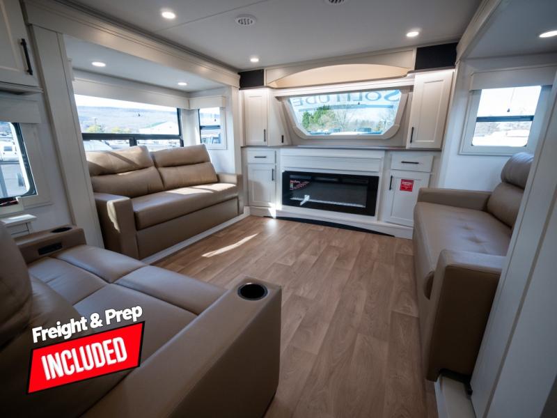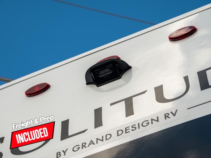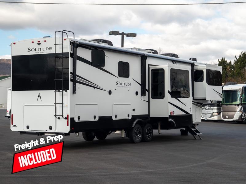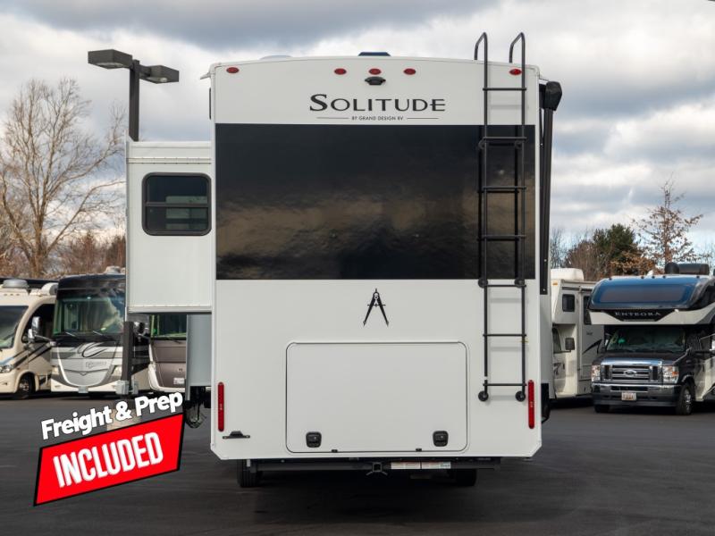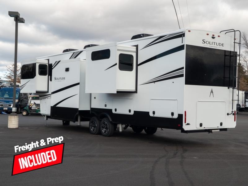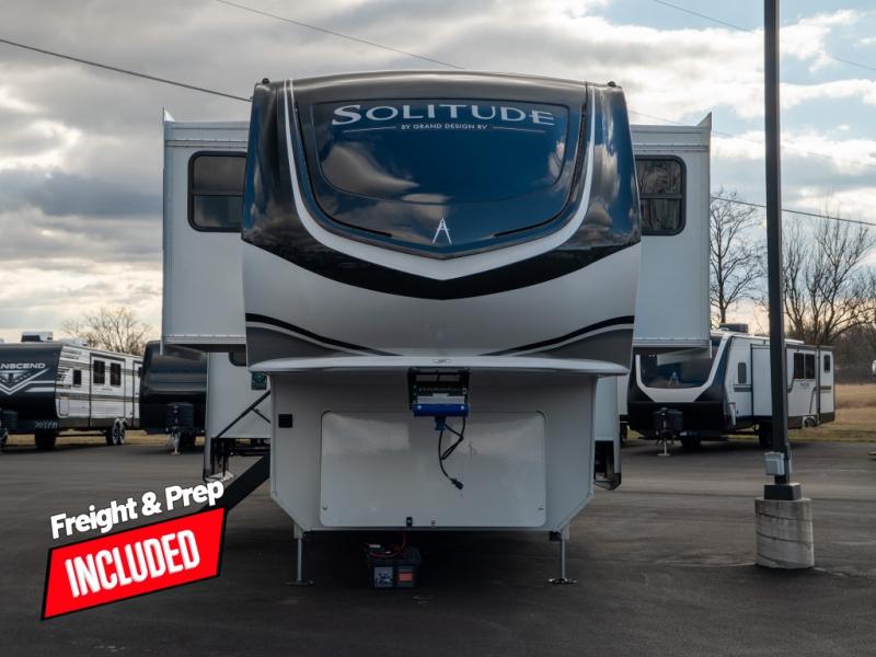 Each Solitude fifth wheel by Grand Design features a 101" wide-body construction, heavy duty 8,000 lb. axles, frameless tinted windows, and high-gloss gel coat sidewalls. You can camp year around thanks to the Weather-Tek Package that includes a 35K BTU high-capacity furnace, an all-in-one enclosed and heated utility center, and a fully enclosed underbelly with heated tanks and storage. Inside, you'll love the premium roller shades, hardwood cabinet doors, solid surface countertops, plus residential finishes throughout to make you truly feel at home. Each model also includes a MORryde CRE3000 suspension system, self adjusting brakes, and a MORryde pin box that will provide smooth towing from home to campground. Affordable luxury is possible with the Solitude fifth wheels; choose yours today!