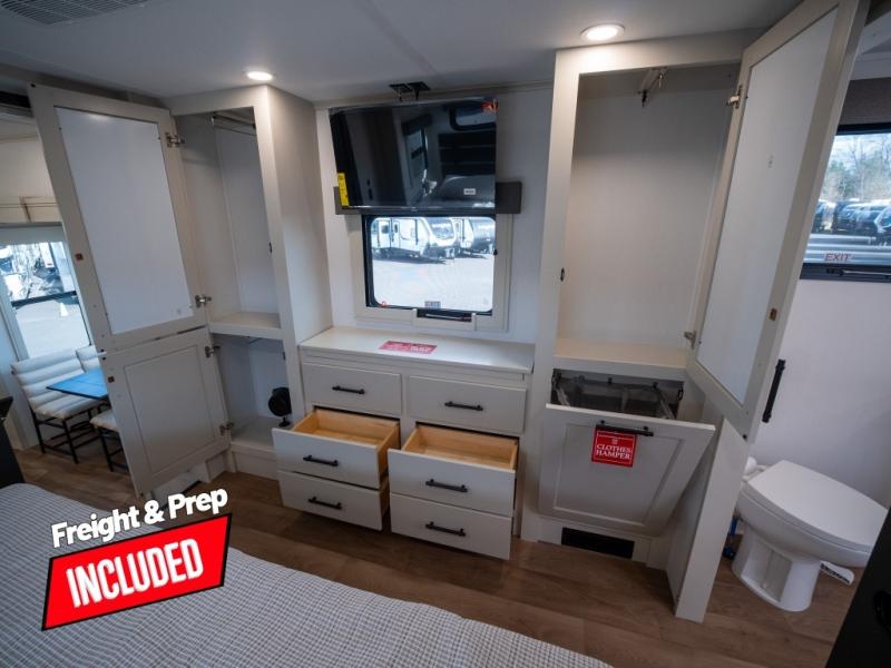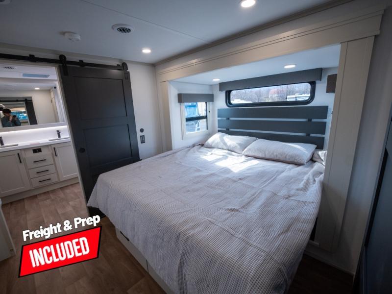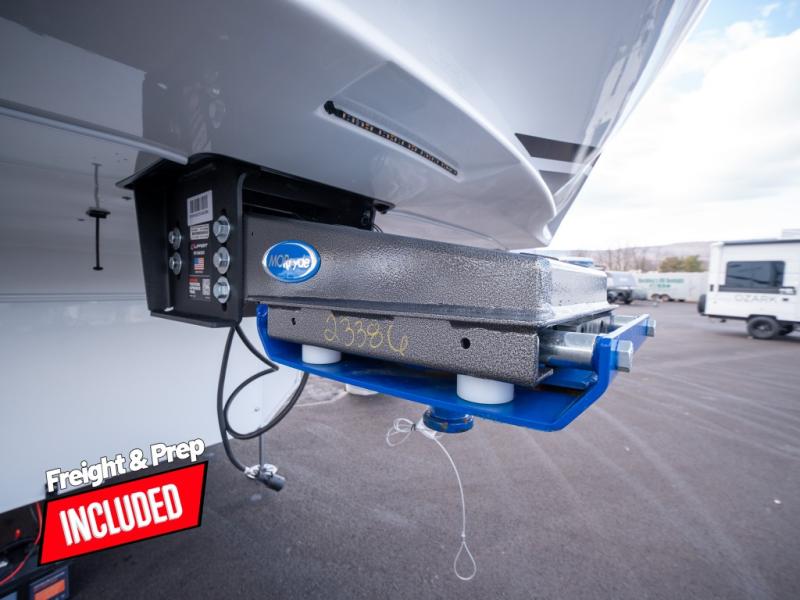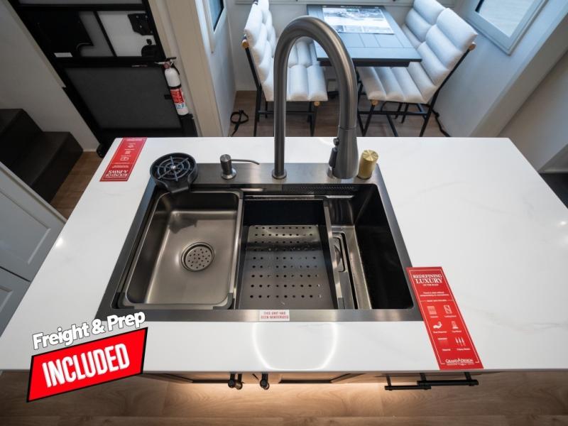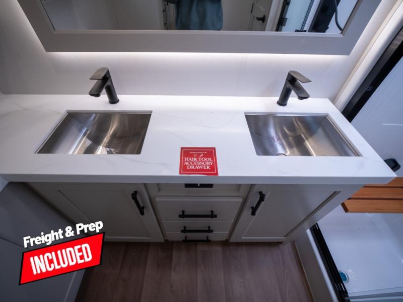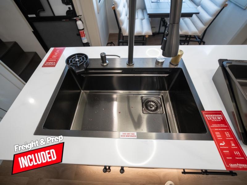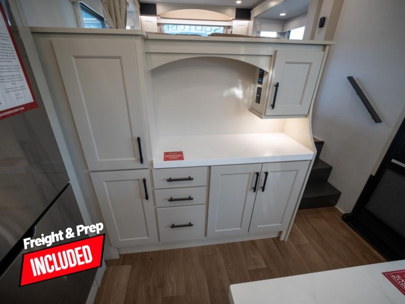 Each Solitude fifth wheel by Grand Design features a 101" wide-body construction, heavy duty 8,000 lb. axles, frameless tinted windows, and high-gloss gel coat sidewalls. You can camp year around thanks to the Weather-Tek Package that includes a 35K BTU high-capacity furnace, an all-in-one enclosed and heated utility center, and a fully enclosed underbelly with heated tanks and storage. Inside, you'll love the premium roller shades, hardwood cabinet doors, solid surface countertops, plus residential finishes throughout to make you truly feel at home. Each model also includes a MORryde CRE3000 suspension system, self adjusting brakes, and a MORryde pin box that will provide smooth towing from home to campground. Affordable luxury is possible with the Solitude fifth wheels; choose yours today!
