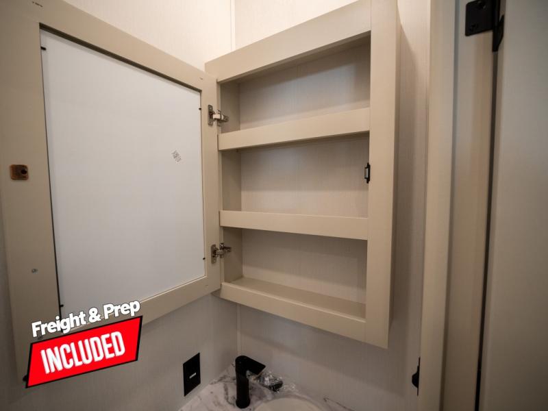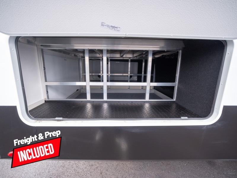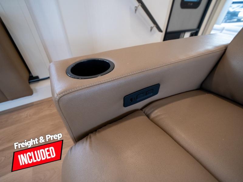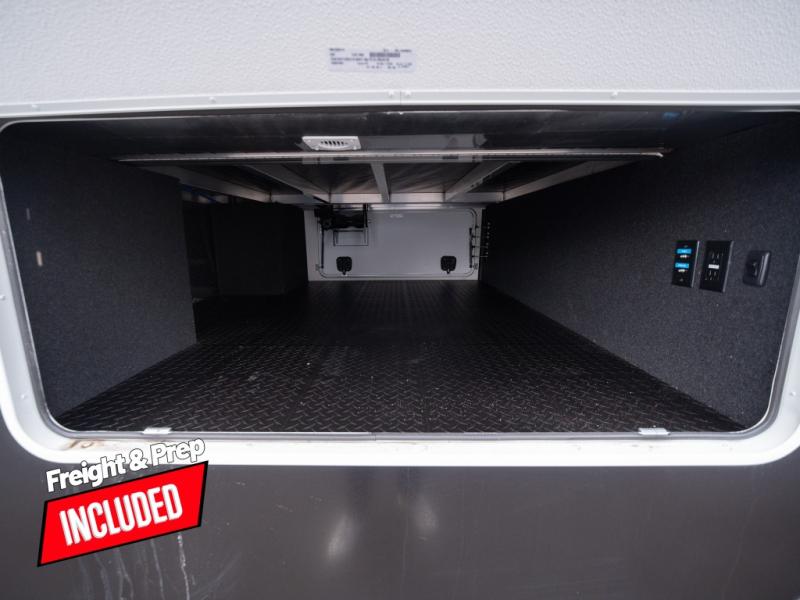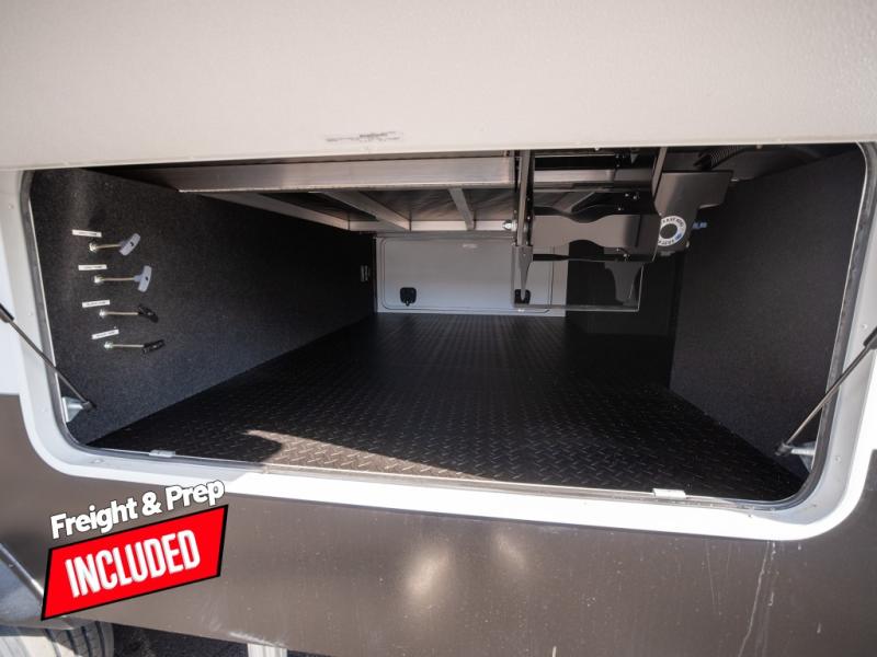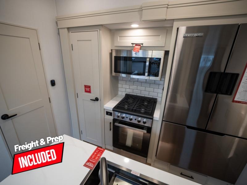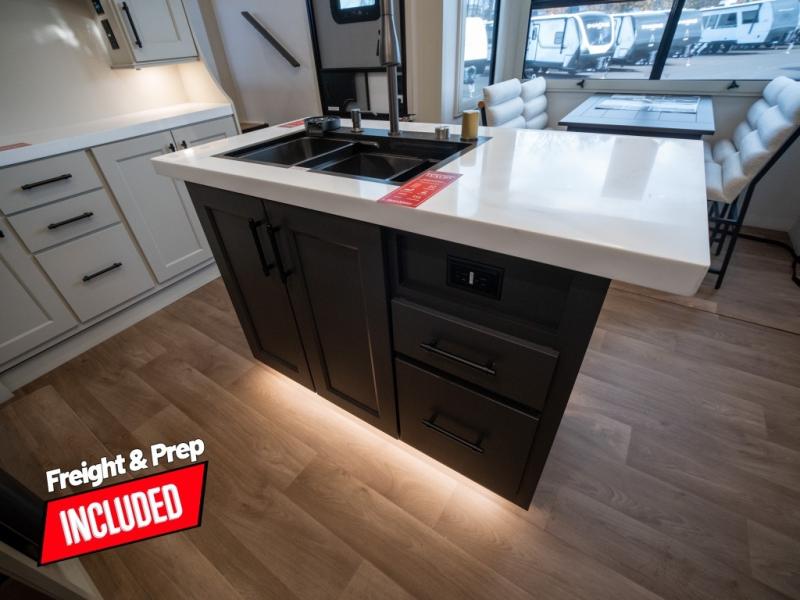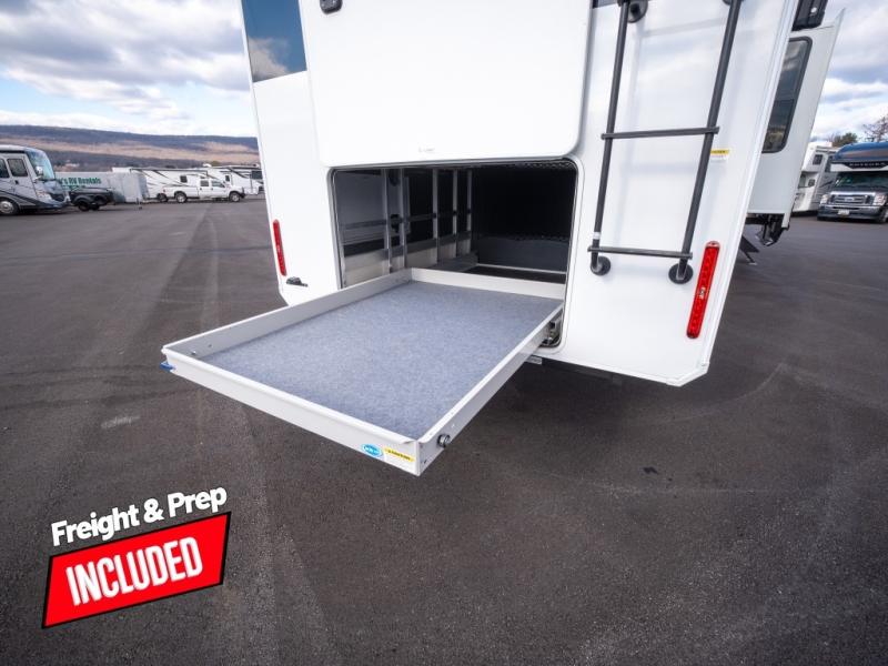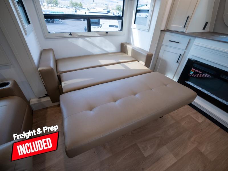 Five slide outs, a full bathroom with dual sinks, a half bath off of the kitchen, and a separate front living room and entertainment area are a few reasons you will enjoy your time spent in this fifth wheel! The separate kitchen is a dream with stainless steel appliances including a built-in oven, a pantry and hutch with counter space, a kitchen island plus a free-standing dinette slide with windows for great views. The entertainment center offers an LED Smart TV with a fireplace below and storage, and the dual opposing tri-fold sofas provide added sleeping space at night. The master bedroom includes a queen bed plus space savings sliding doors that lead you to the rear full bathroom with dual sinks, linen storage, and washer/dryer prep. The exterior has several storage choices as well including a pass-through compartment for fishing poles and such, plus the unique sliding tray in the rear allows you to bring along larger items such as camping tables, portable grills, golf clubs, totes and more.
