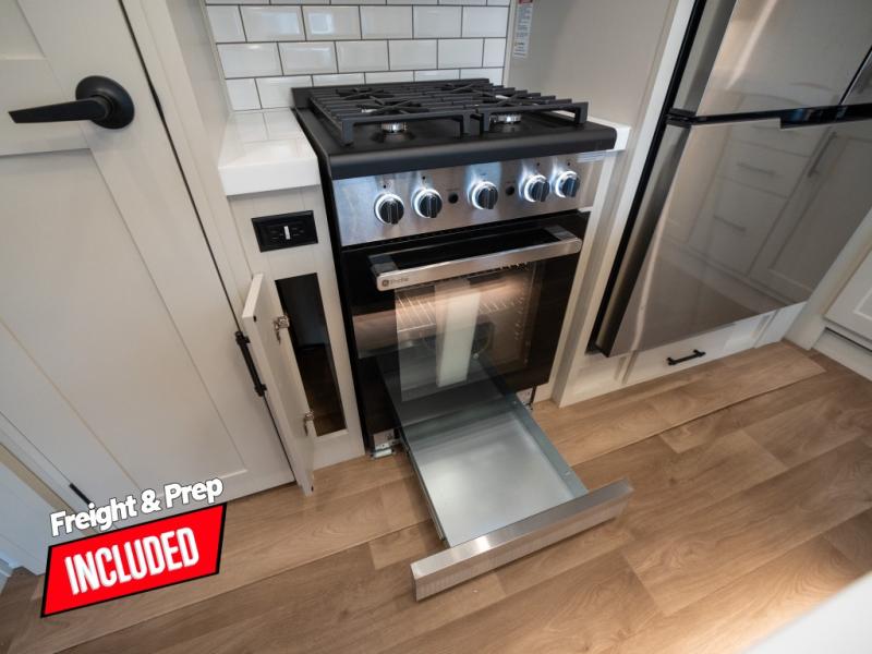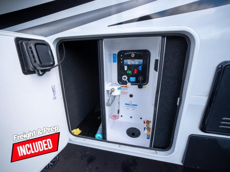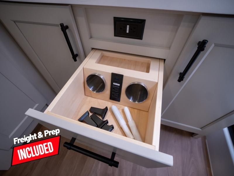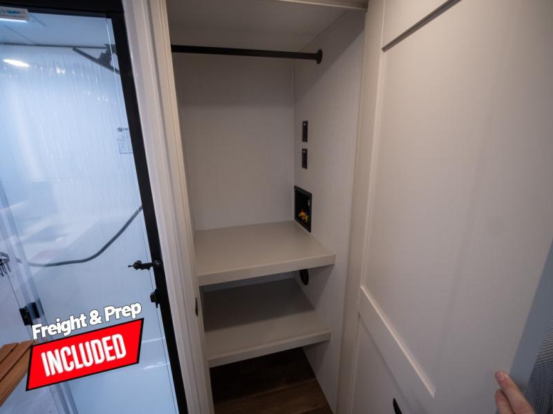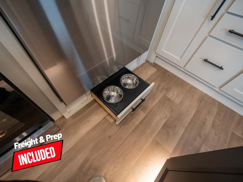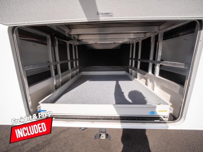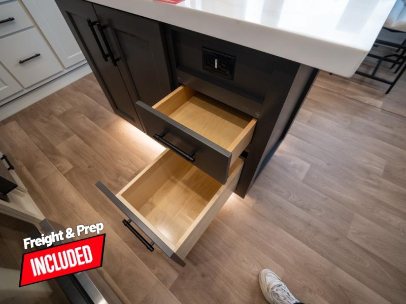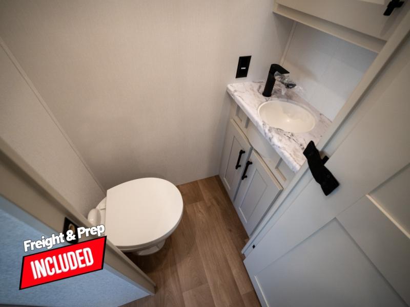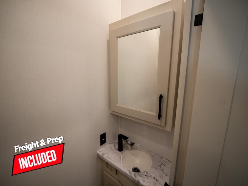 Five slide outs, a full bathroom with dual sinks, a half bath off of the kitchen, and a separate front living room and entertainment area are a few reasons you will enjoy your time spent in this fifth wheel! The separate kitchen is a dream with stainless steel appliances including a built-in oven, a pantry and hutch with counter space, a kitchen island plus a free-standing dinette slide with windows for great views. The entertainment center offers an LED Smart TV with a fireplace below and storage, and the dual opposing tri-fold sofas provide added sleeping space at night. The master bedroom includes a queen bed plus space savings sliding doors that lead you to the rear full bathroom with dual sinks, linen storage, and washer/dryer prep. The exterior has several storage choices as well including a pass-through compartment for fishing poles and such, plus the unique sliding tray in the rear allows you to bring along larger items such as camping tables, portable grills, golf clubs, totes and more.