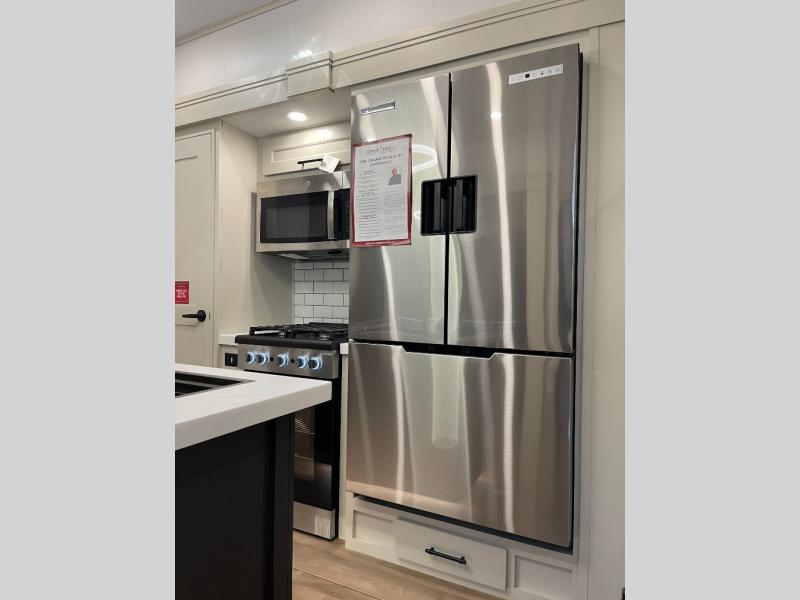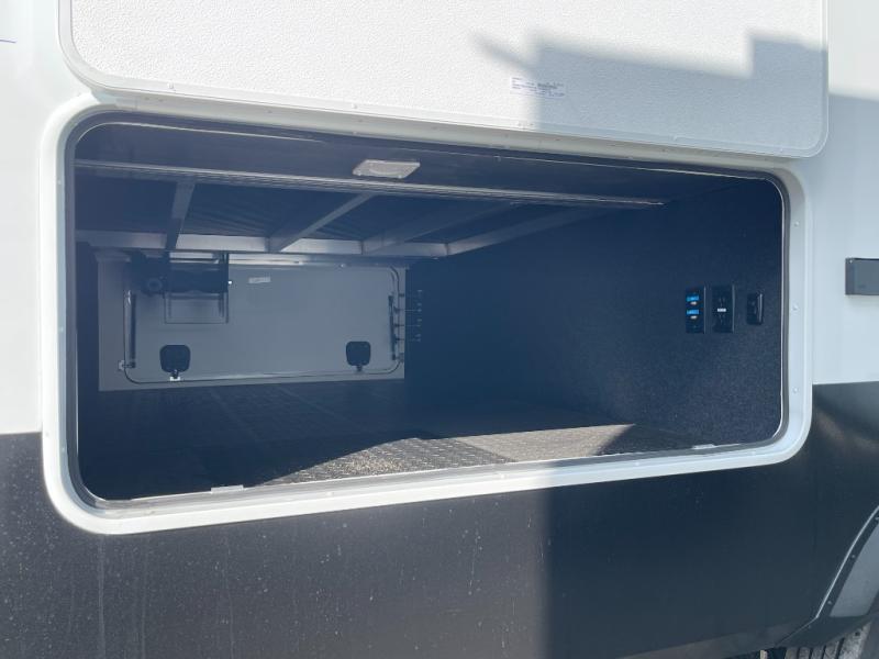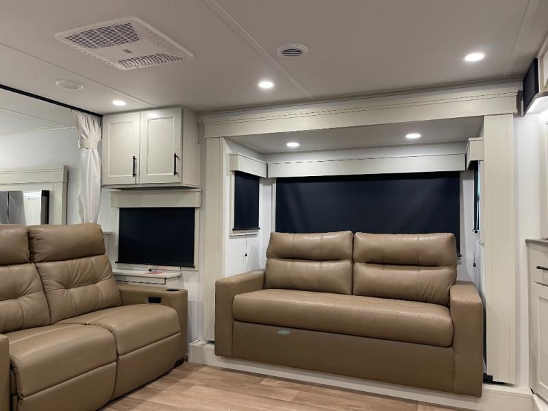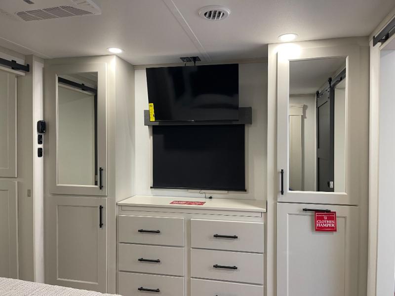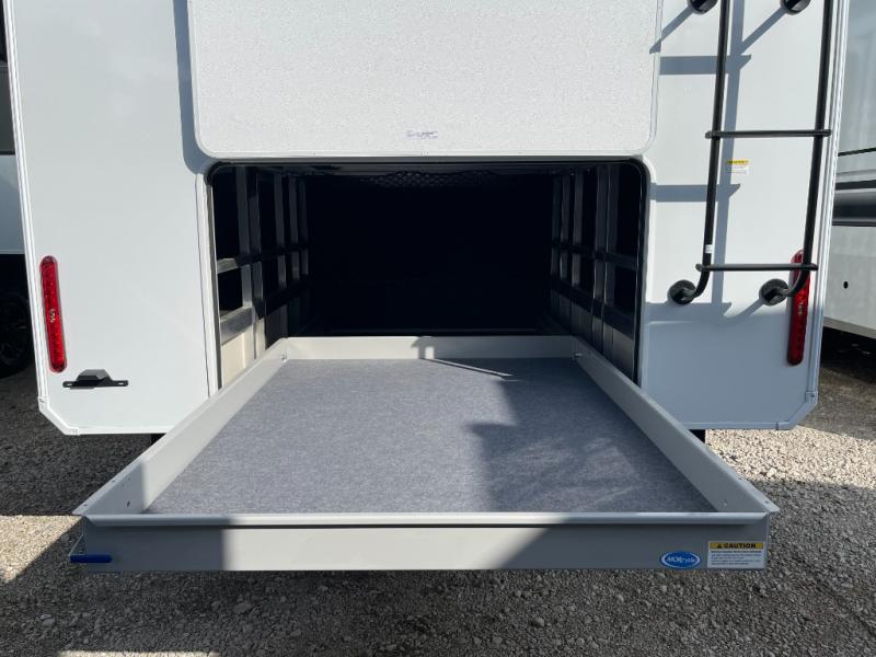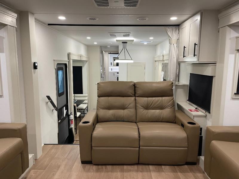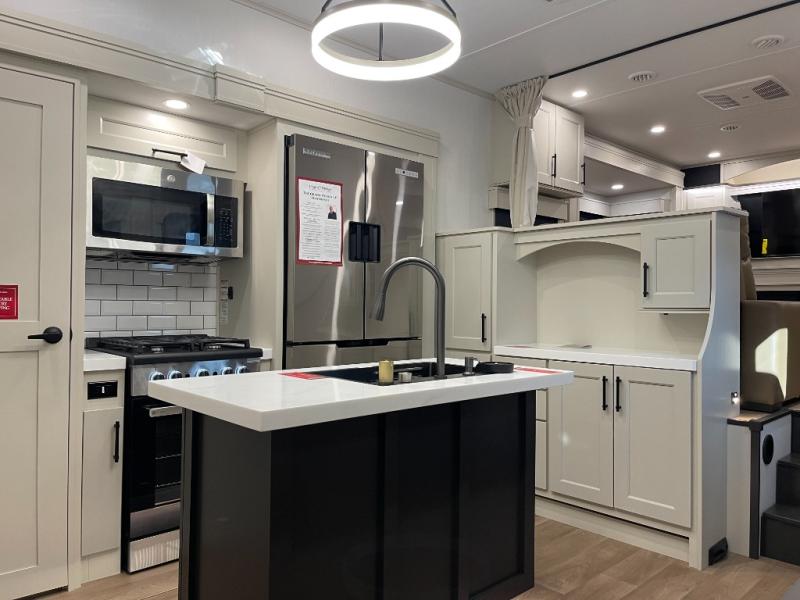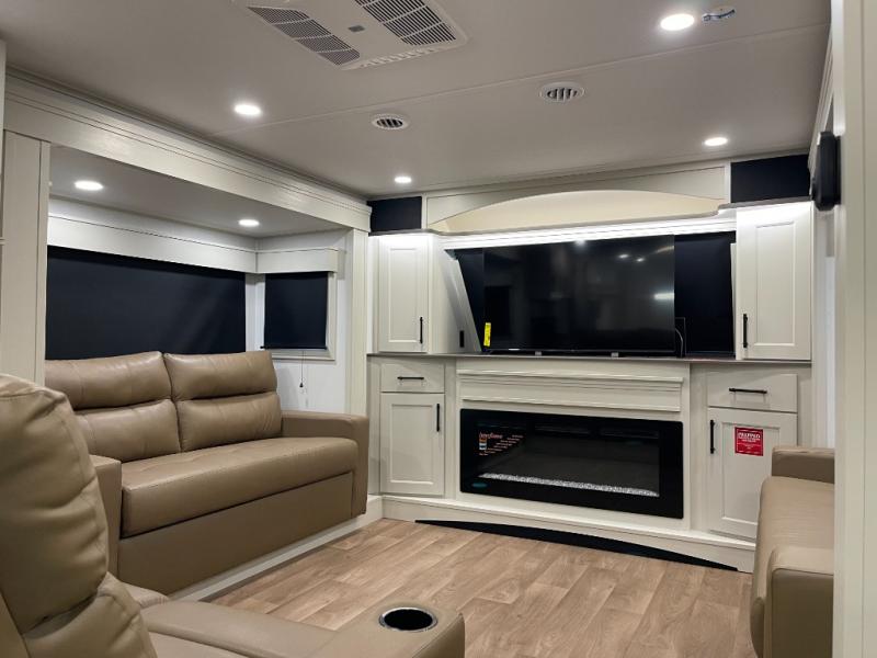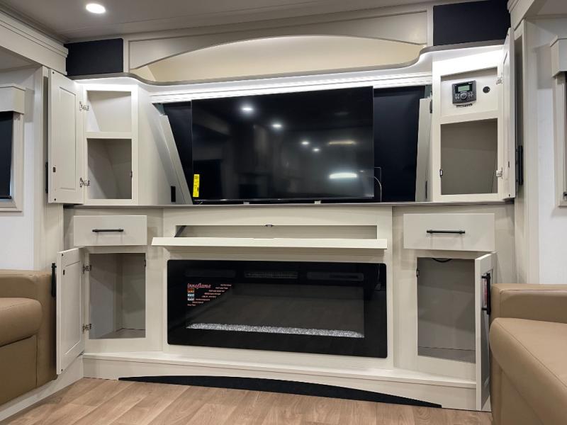 Five slide-outs, a full bathroom with dual sinks, a half bath off the kitchen, and a separate front living room and entertainment area are a few reasons you will enjoy your time spent in this fifth wheel! The separate kitchen is a dream with stainless steel appliances, including a built-in oven, a pantry and a hutch with counter space, a kitchen island plus a free-standing dinette slide with windows for great views. The entertainment center offers an LED Smart TV with a fireplace below and storage, and the dual opposing tri-fold sofas provide added sleeping space at night. The master bedroom includes a queen bed plus space savings sliding doors that lead you to the rear full bathroom with dual sinks, linen storage, and washer/dryer prep. The exterior has several storage choices as well including a pass-through storage compartment for fishing poles and such, plus the unique sliding tray in the rear allows you to bring along larger items such as camping tables, portable grills, golf clubs, totes and more.