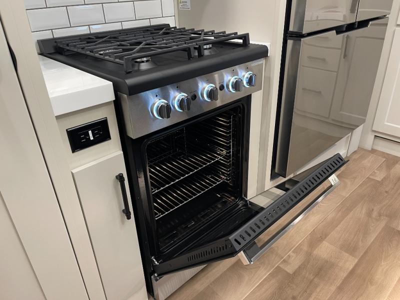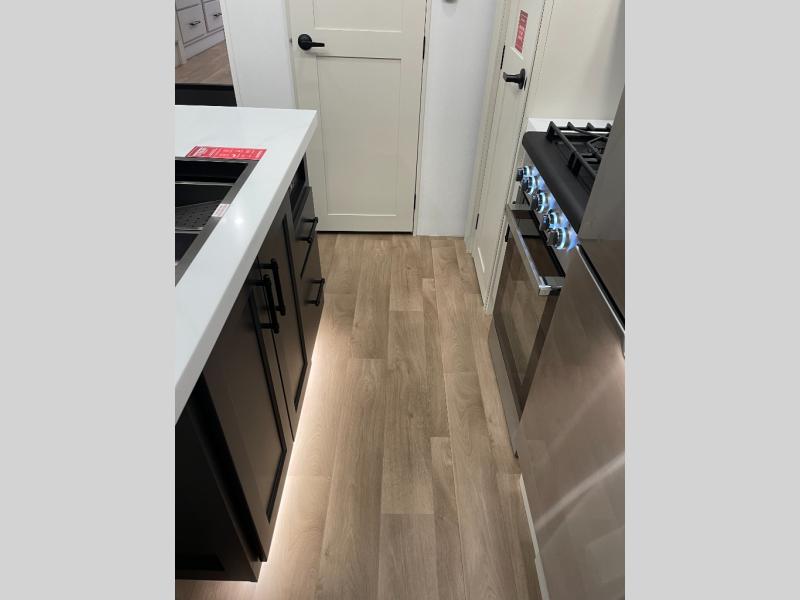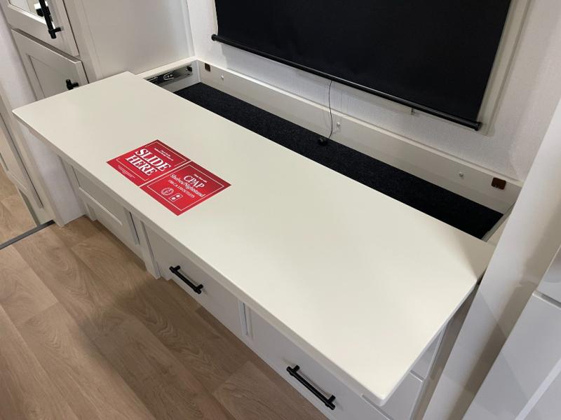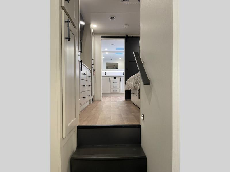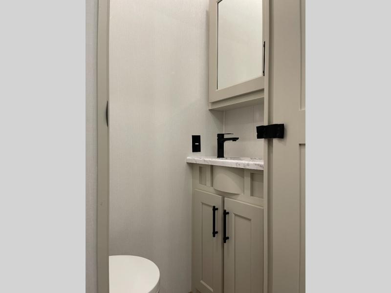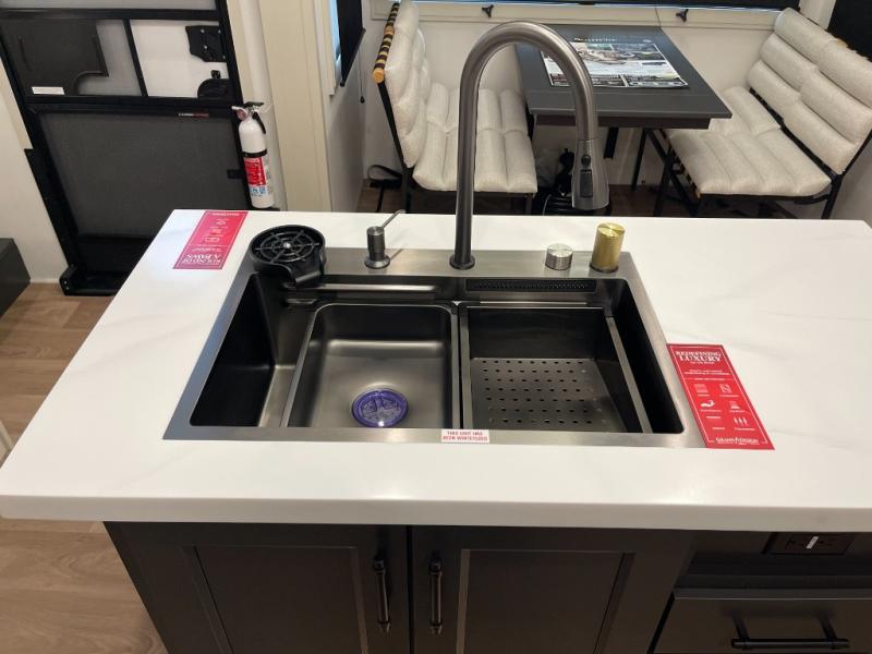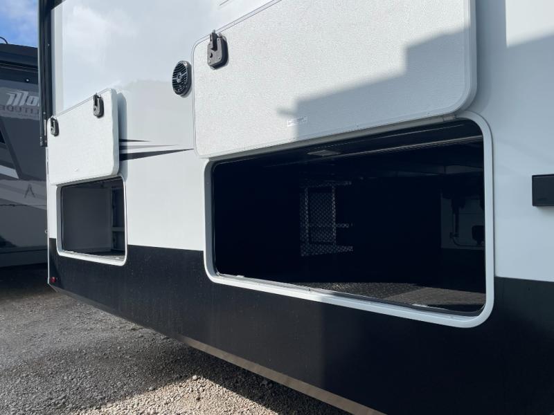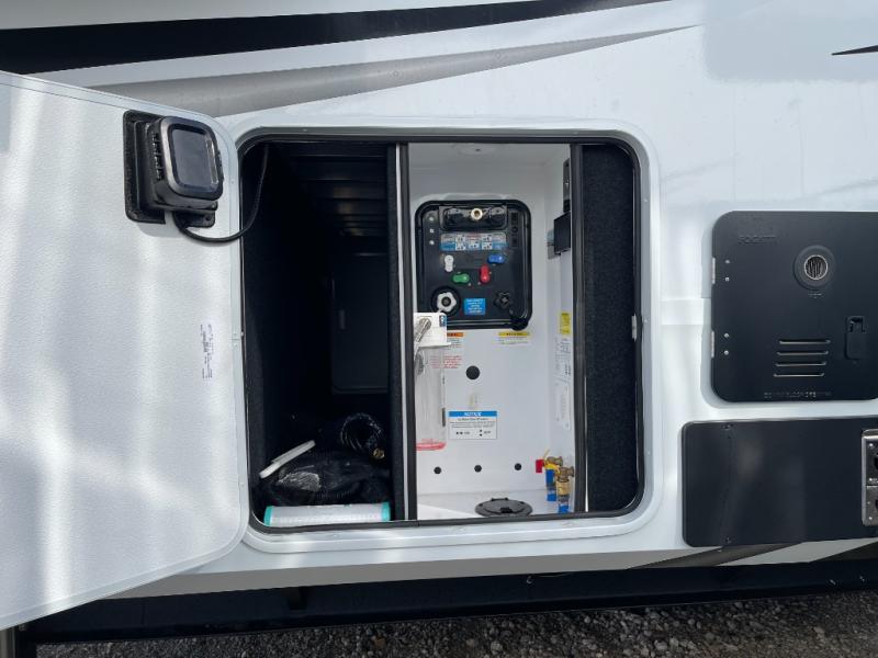 Five slide-outs, a full bathroom with dual sinks, a half bath off the kitchen, and a separate front living room and entertainment area are a few reasons you will enjoy your time spent in this fifth wheel! The separate kitchen is a dream with stainless steel appliances, including a built-in oven, a pantry and a hutch with counter space, a kitchen island plus a free-standing dinette slide with windows for great views. The entertainment center offers an LED Smart TV with a fireplace below and storage, and the dual opposing tri-fold sofas provide added sleeping space at night. The master bedroom includes a queen bed plus space savings sliding doors that lead you to the rear full bathroom with dual sinks, linen storage, and washer/dryer prep. The exterior has several storage choices as well including a pass-through storage compartment for fishing poles and such, plus the unique sliding tray in the rear allows you to bring along larger items such as camping tables, portable grills, golf clubs, totes and more.