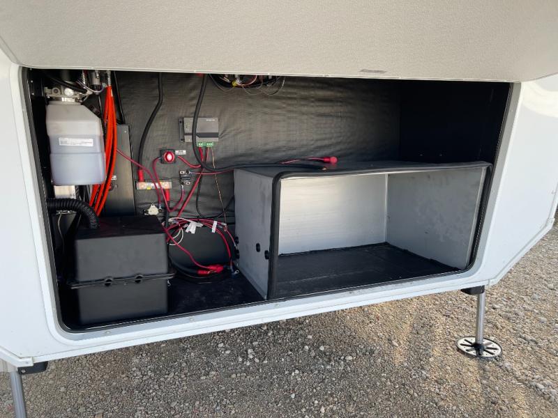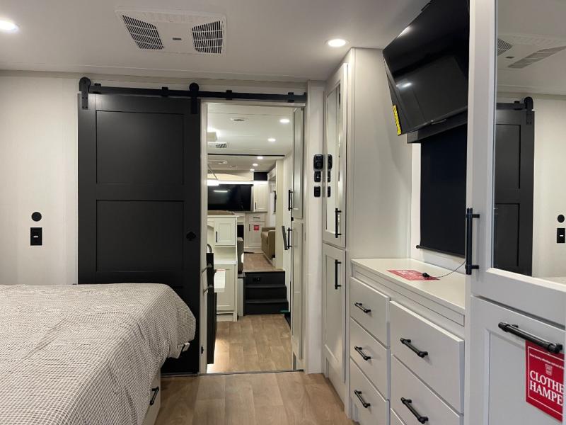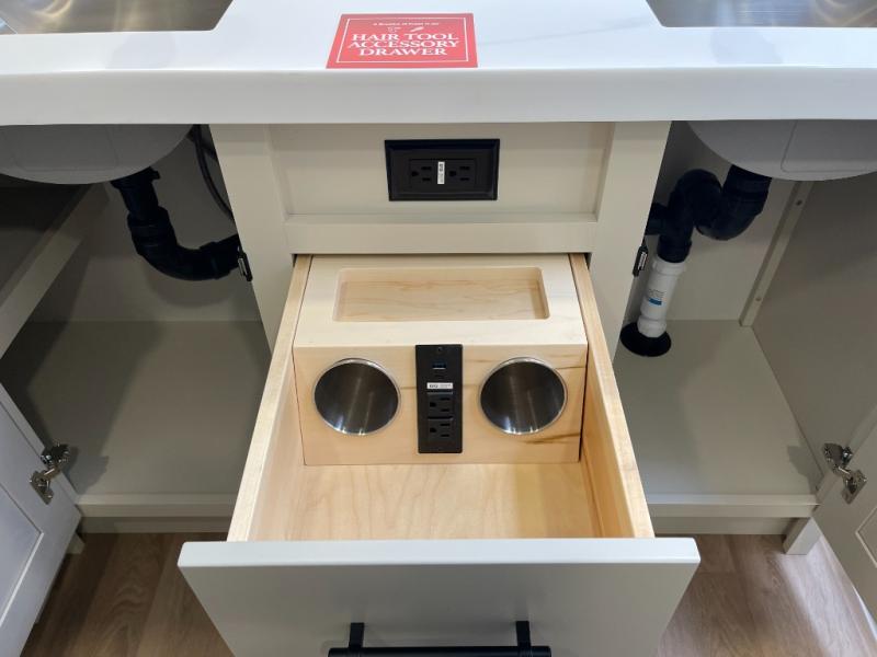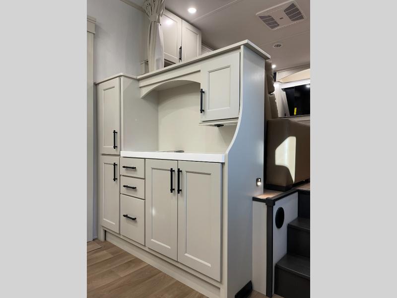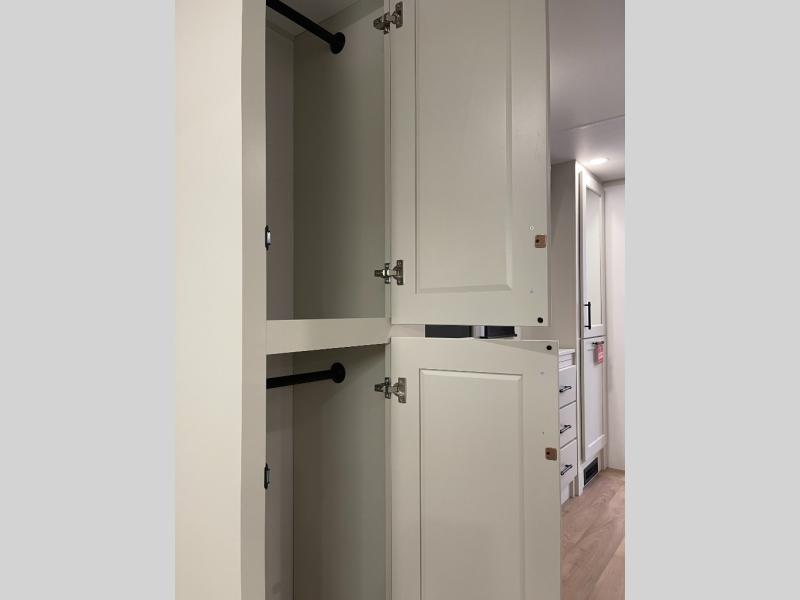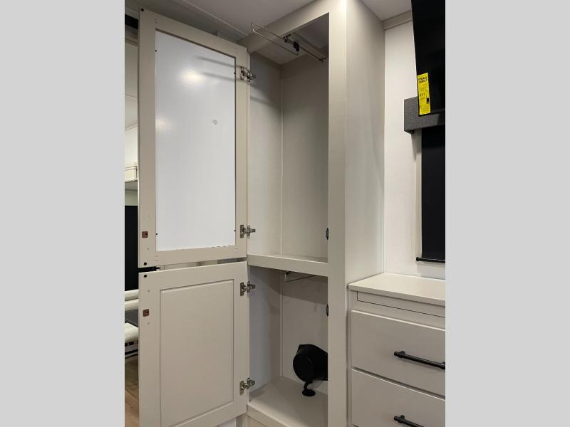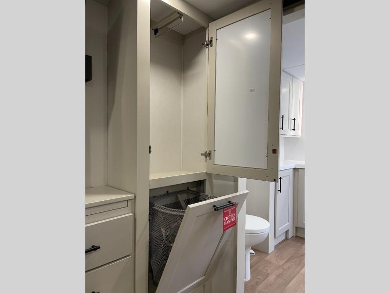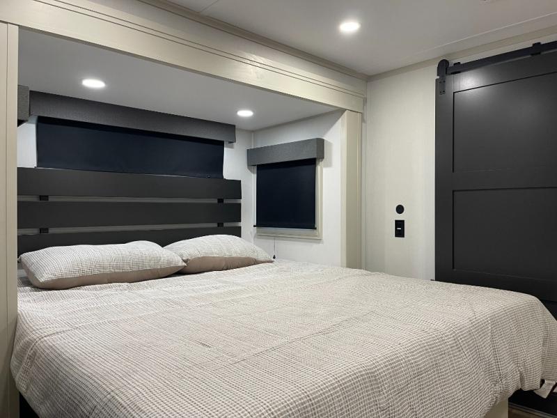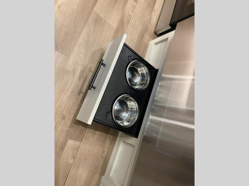 Five slide-outs, a full bathroom with dual sinks, a half bath off the kitchen, and a separate front living room and entertainment area are a few reasons you will enjoy your time spent in this fifth wheel! The separate kitchen is a dream with stainless steel appliances, including a built-in oven, a pantry and a hutch with counter space, a kitchen island plus a free-standing dinette slide with windows for great views. The entertainment center offers an LED Smart TV with a fireplace below and storage, and the dual opposing tri-fold sofas provide added sleeping space at night. The master bedroom includes a queen bed plus space savings sliding doors that lead you to the rear full bathroom with dual sinks, linen storage, and washer/dryer prep. The exterior has several storage choices as well including a pass-through storage compartment for fishing poles and such, plus the unique sliding tray in the rear allows you to bring along larger items such as camping tables, portable grills, golf clubs, totes and more.