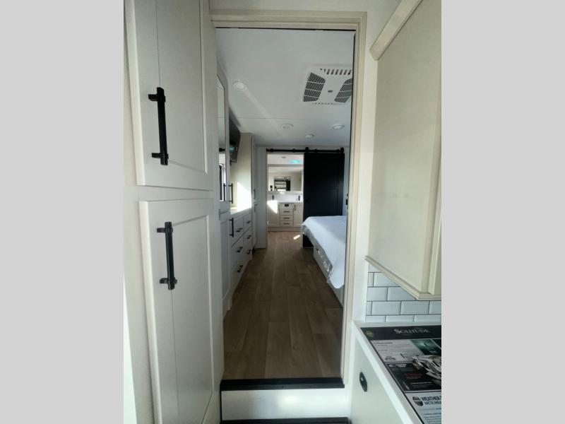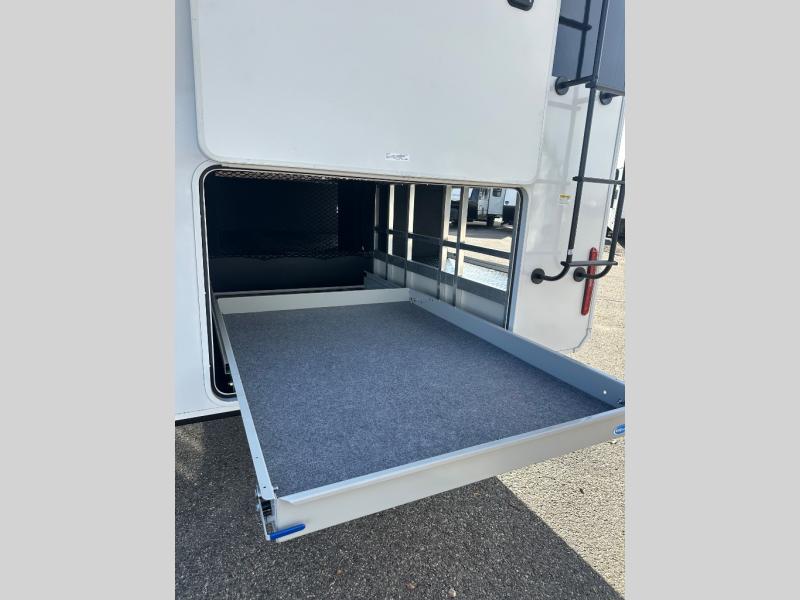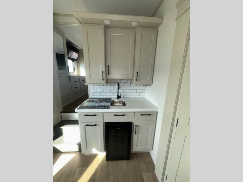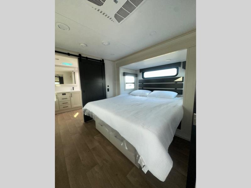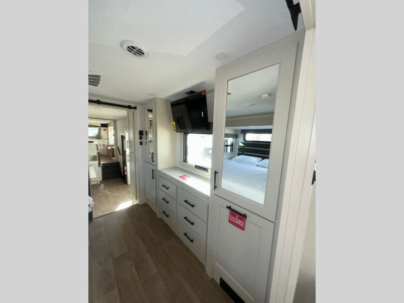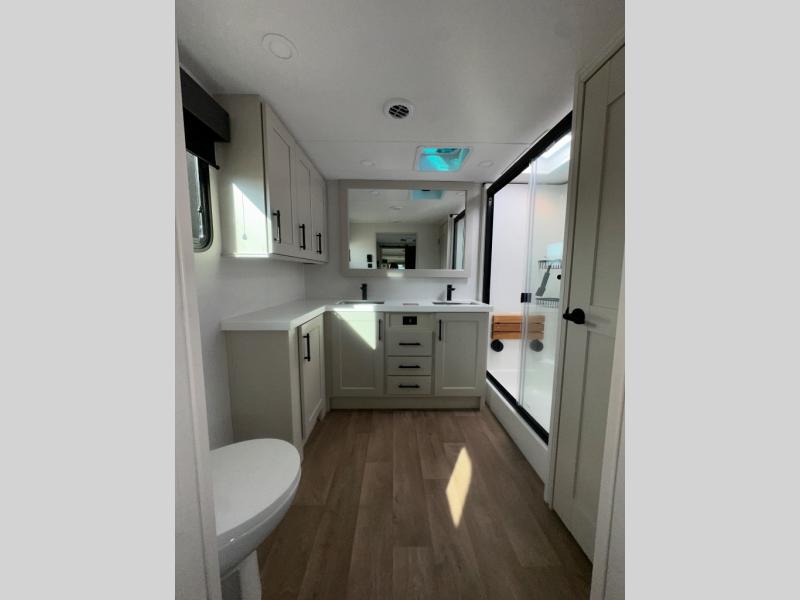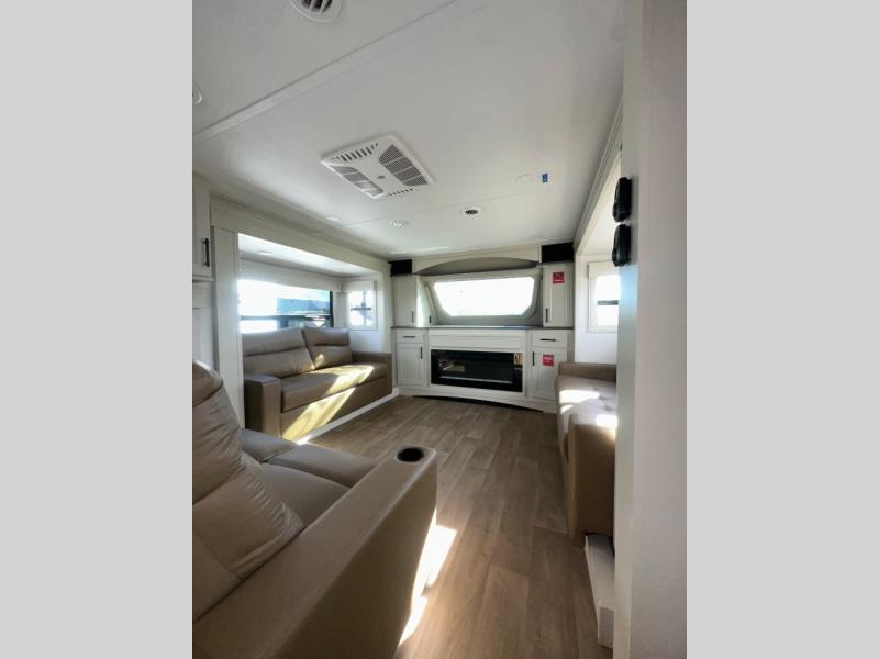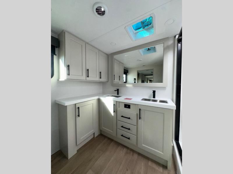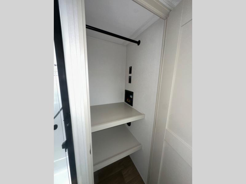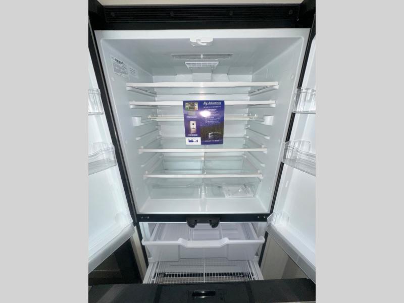 If you enjoy entertaining while camping, you will love this setup with a wet bar including a beverage cooler, a kitchen island to set snacks on, and a hutch for storing dishes. And, the gourmet kitchen appliances with a built-in oven along with a 20 cu. ft. refrigerator allow you to cook any meal for your family and friends. The separate front living room is spacious with dual opposing tri-fold sofa slides and theater seating, and a front wall with an LED telescoping TV and fireplace below plus storage for entertaining. You will have your own master bedroom with a queen bed slide, wardrobes, plus sliding doors that lead into the private master bath. Here you will find dual sinks, a shower with a seat, plus washer/dryer prep which is great for when you plan to stay awhile.