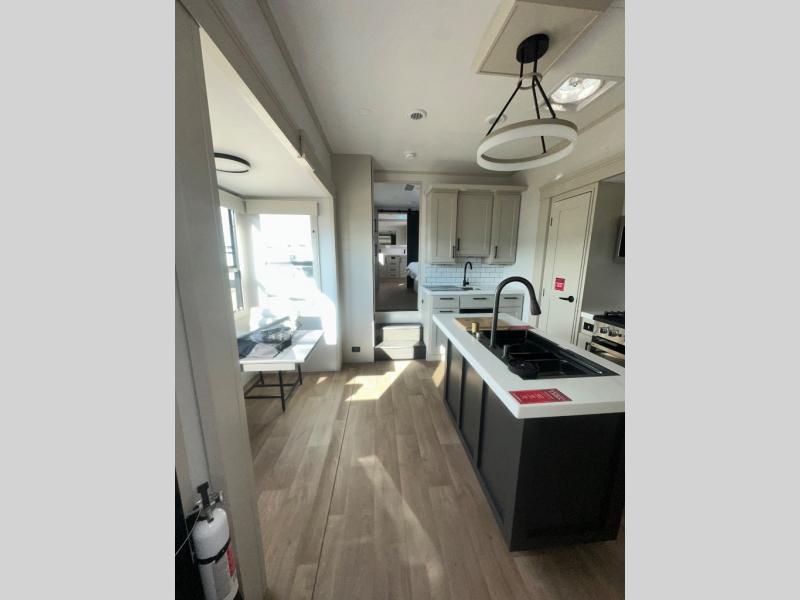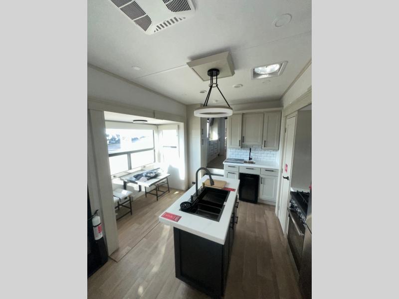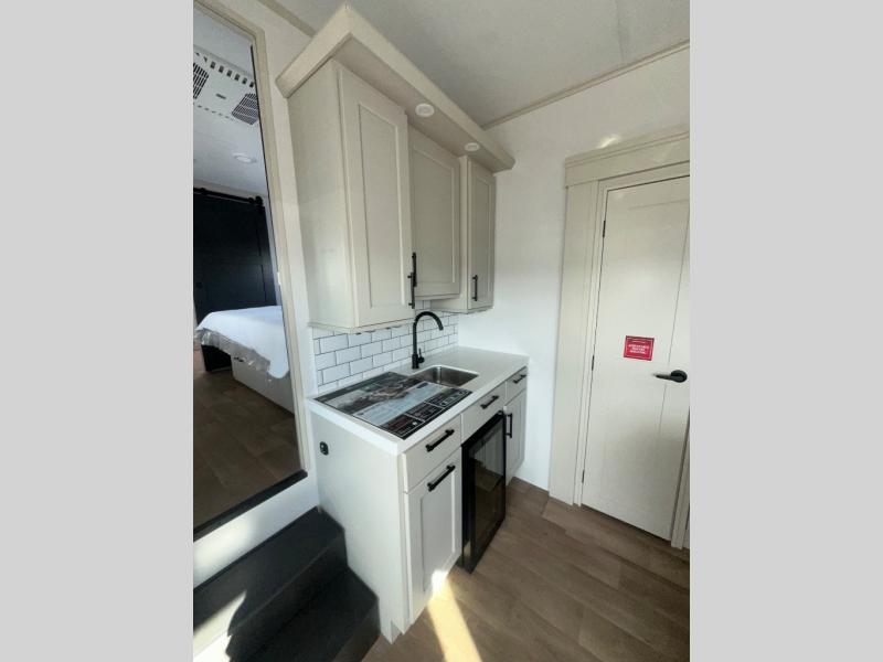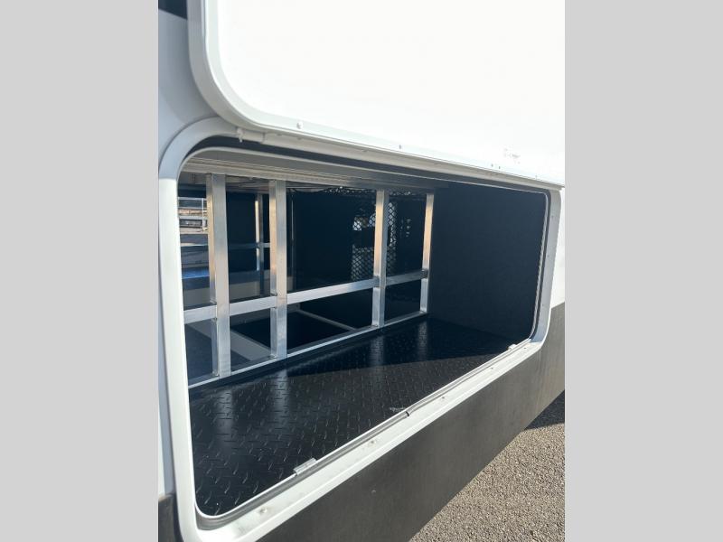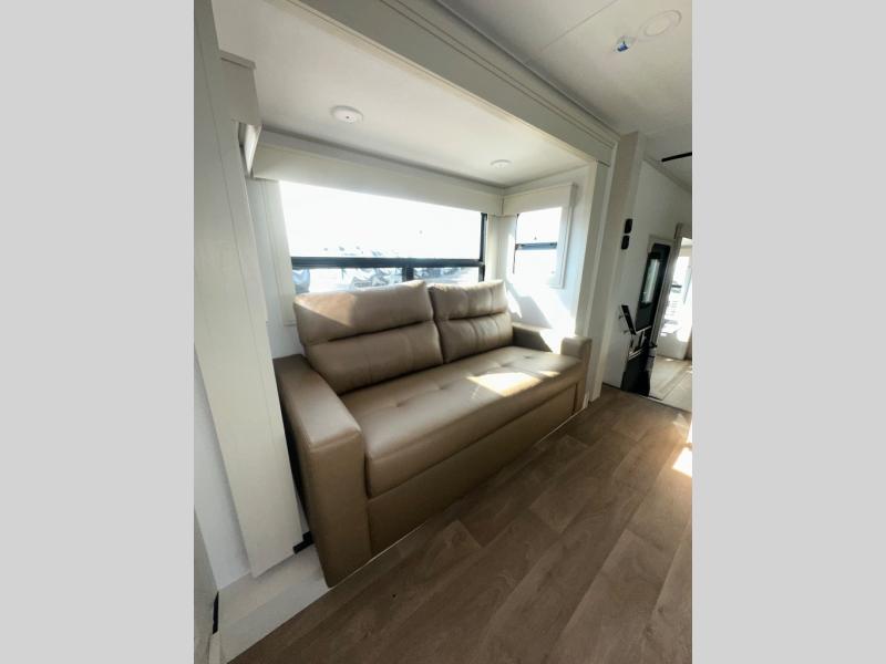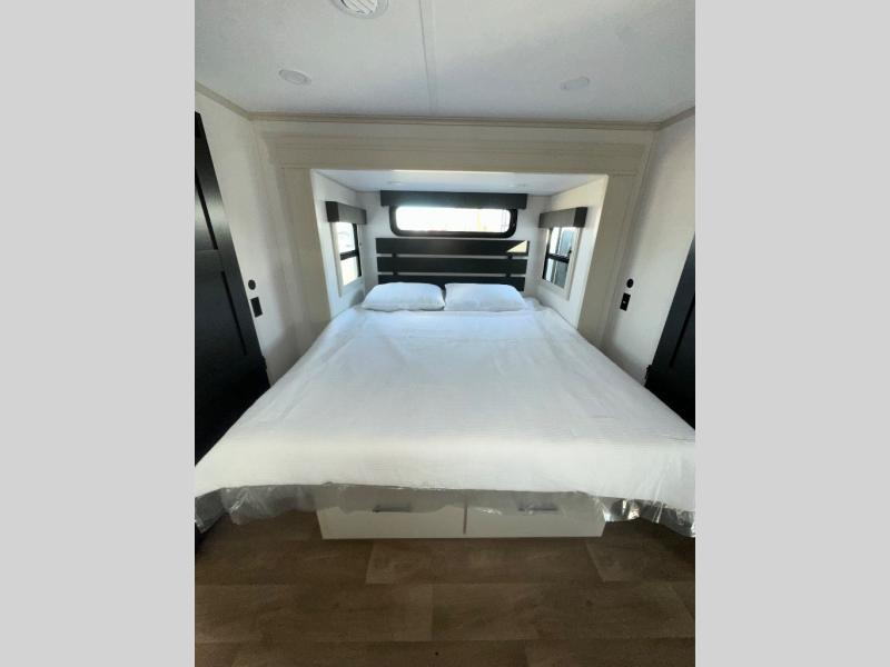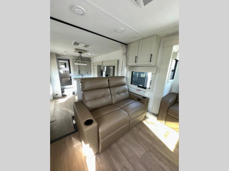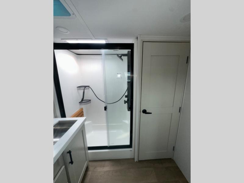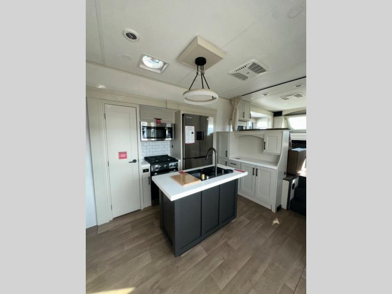 If you enjoy entertaining while camping, you will love this setup with a wet bar including a beverage cooler, a kitchen island to set snacks on, and a hutch for storing dishes. And, the gourmet kitchen appliances with a built-in oven along with a 20 cu. ft. refrigerator allow you to cook any meal for your family and friends. The separate front living room is spacious with dual opposing tri-fold sofa slides and theater seating, and a front wall with an LED telescoping TV and fireplace below plus storage for entertaining. You will have your own master bedroom with a queen bed slide, wardrobes, plus sliding doors that lead into the private master bath. Here you will find dual sinks, a shower with a seat, plus washer/dryer prep which is great for when you plan to stay awhile.