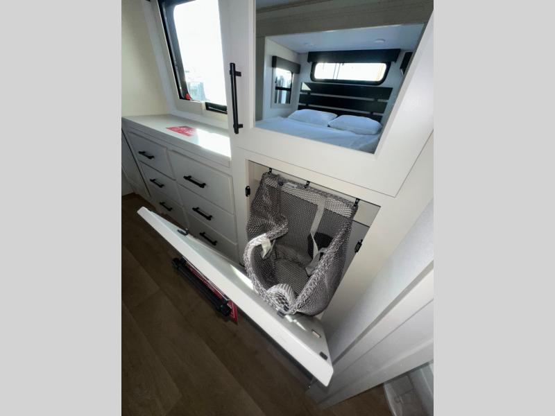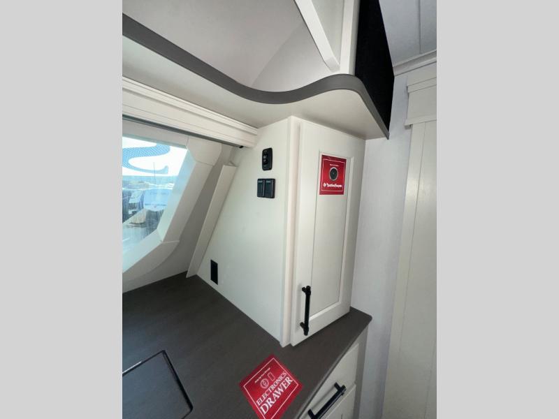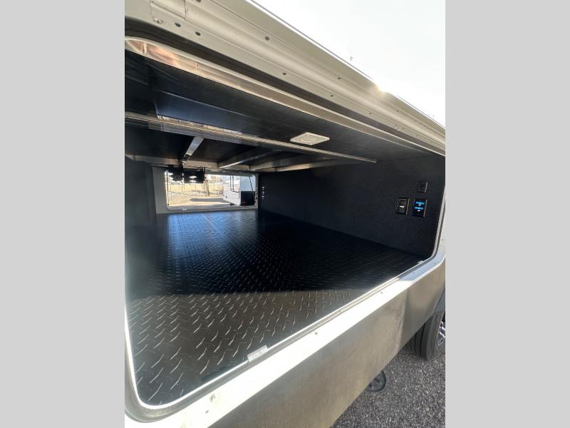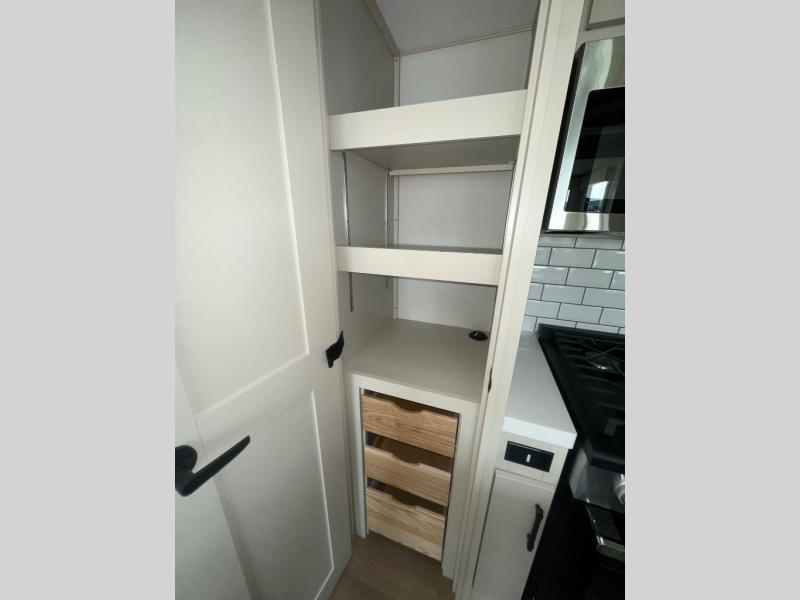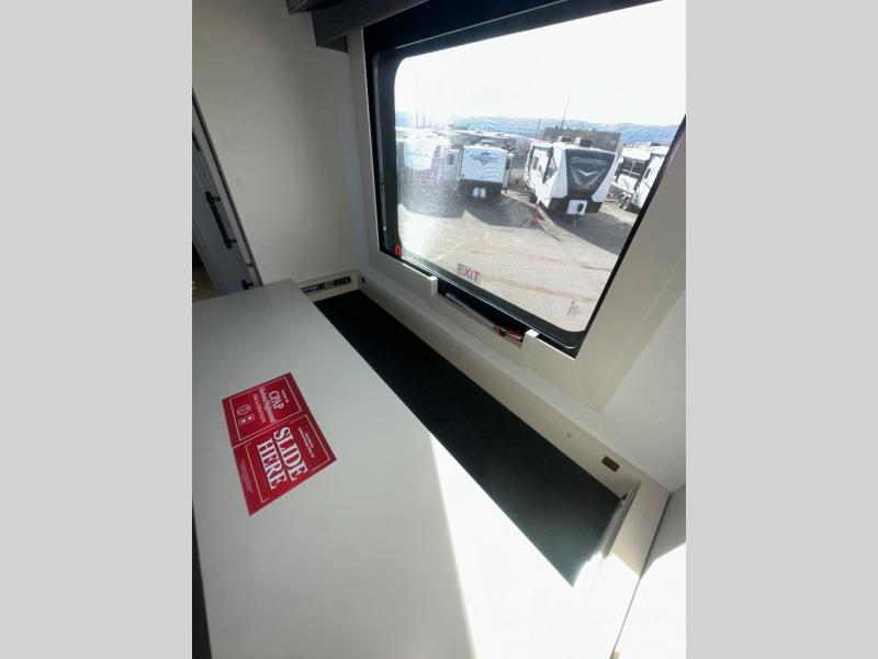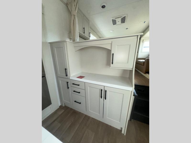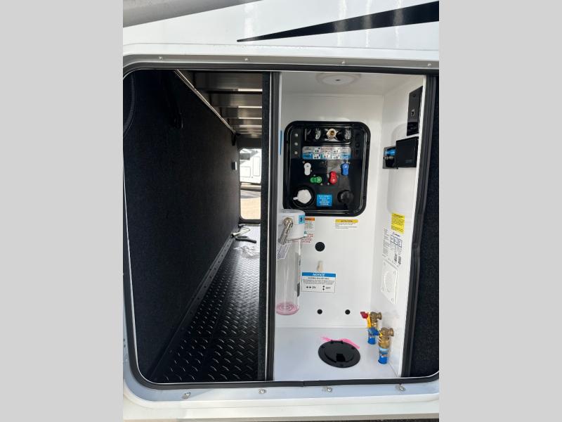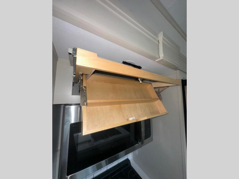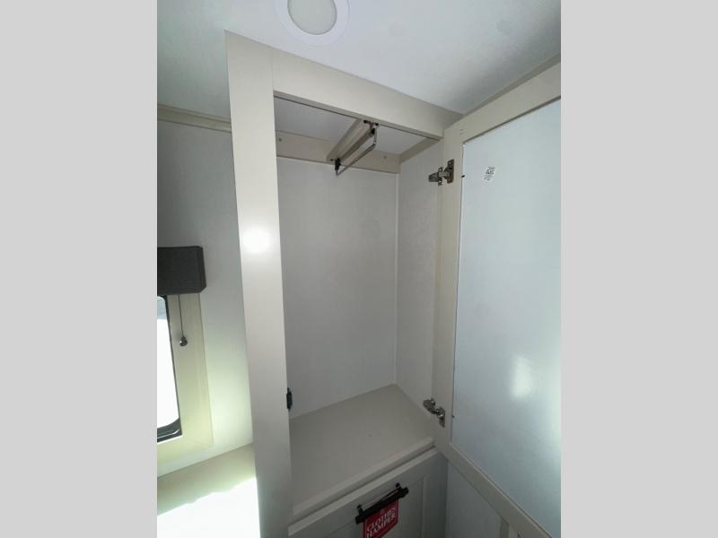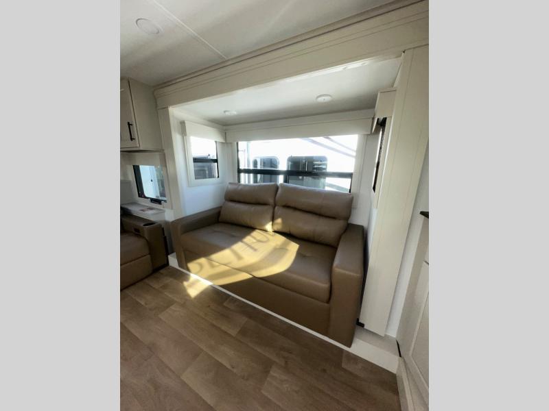 If you enjoy entertaining while camping, you will love this setup with a wet bar including a beverage cooler, a kitchen island to set snacks on, and a hutch for storing dishes. And, the gourmet kitchen appliances with a built-in oven along with a 20 cu. ft. refrigerator allow you to cook any meal for your family and friends. The separate front living room is spacious with dual opposing tri-fold sofa slides and theater seating, and a front wall with an LED telescoping TV and fireplace below plus storage for entertaining. You will have your own master bedroom with a queen bed slide, wardrobes, plus sliding doors that lead into the private master bath. Here you will find dual sinks, a shower with a seat, plus washer/dryer prep which is great for when you plan to stay awhile.