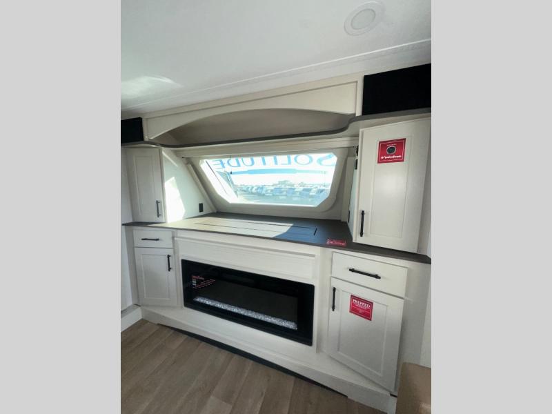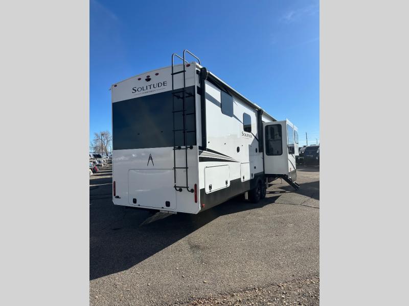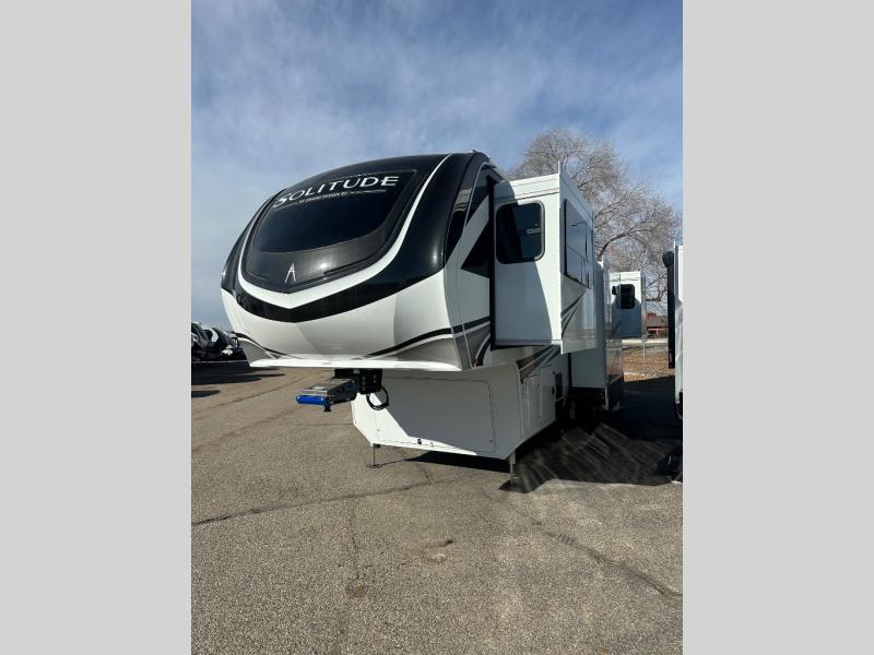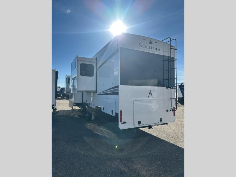 Each Solitude fifth wheel by Grand Design features a 101" wide-body construction, heavy duty 8,000 lb. axles, frameless tinted windows, and high-gloss gel coat sidewalls. You can camp year around thanks to the Weather-Tek Package that includes a 35K BTU high-capacity furnace, an all-in-one enclosed and heated utility center, and a fully enclosed underbelly with heated tanks and storage. Inside, you'll love the premium roller shades, hardwood cabinet doors, solid surface countertops, plus residential finishes throughout to make you truly feel at home. Each model also includes a MORryde CRE3000 suspension system, self adjusting brakes, and a MORryde pin box that will provide smooth towing from home to campground. Affordable luxury is possible with the Solitude fifth wheels; choose yours today!