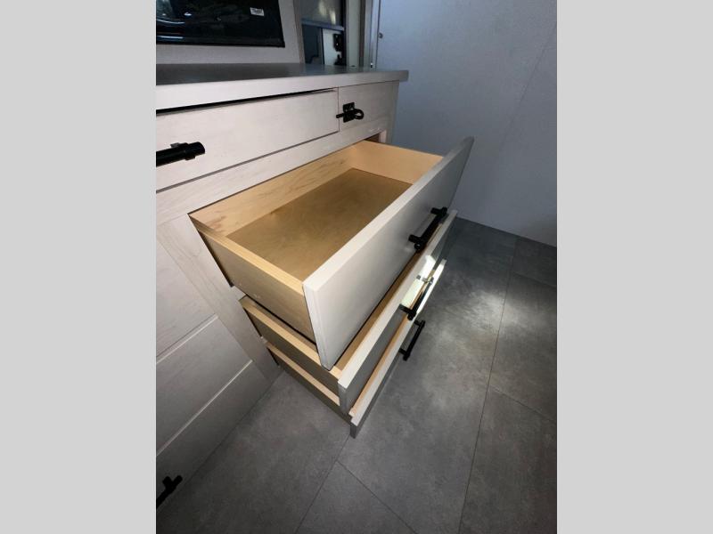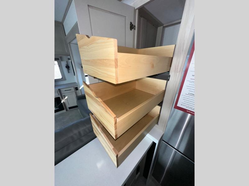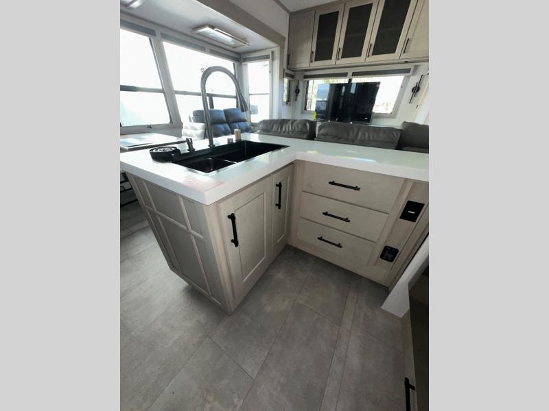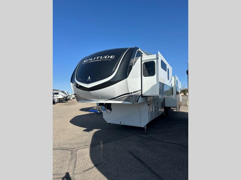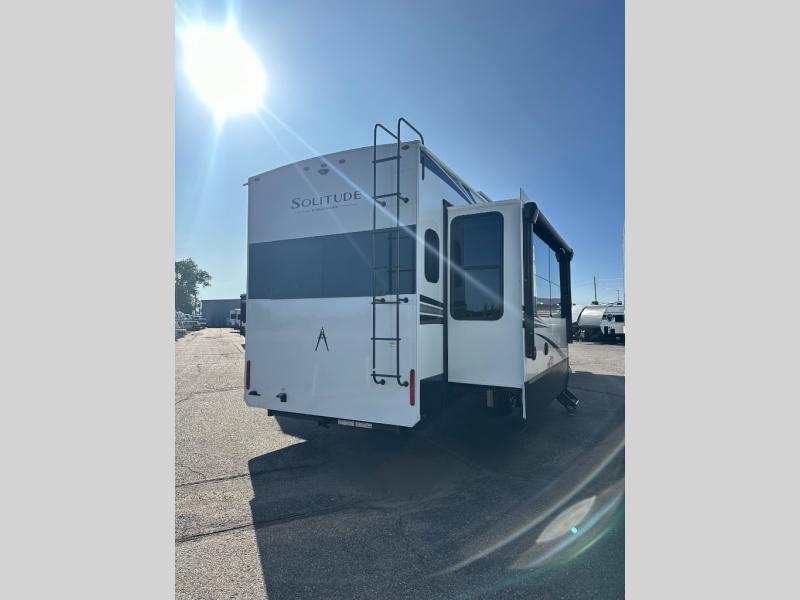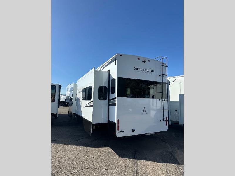 Each Solitude fifth wheel by Grand Design features a 101" wide-body construction, heavy duty 8,000 lb. axles, frameless tinted windows, and high-gloss gel coat sidewalls. You can camp year around thanks to the Weather-Tek Package that includes a 35K BTU high-capacity furnace, an all-in-one enclosed and heated utility center, and a fully enclosed underbelly with heated tanks and storage. Inside, you'll love the premium roller shades, hardwood cabinet doors, solid surface countertops, plus residential finishes throughout to make you truly feel at home. Each model also includes a MORryde CRE3000 suspension system, self adjusting brakes, and a MORryde pin box that will provide smooth towing from home to campground. Affordable luxury is possible with the Solitude fifth wheels; choose yours today!