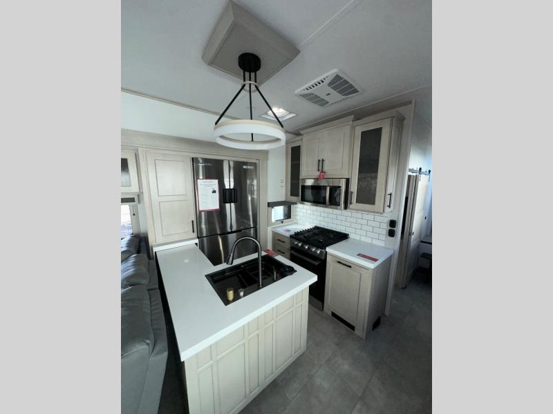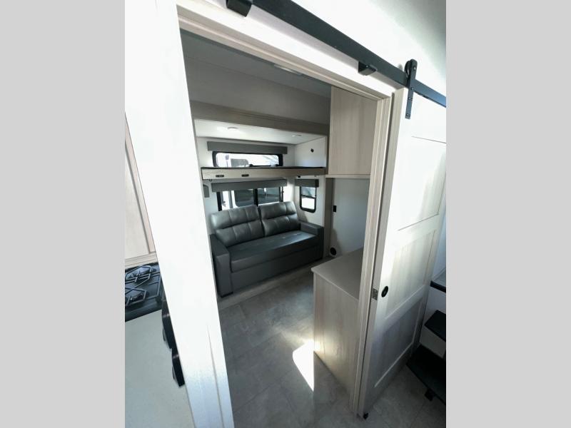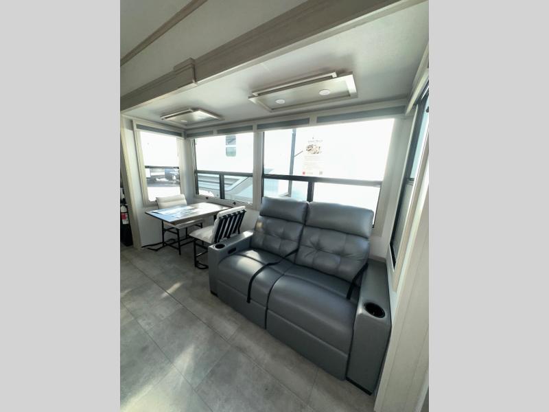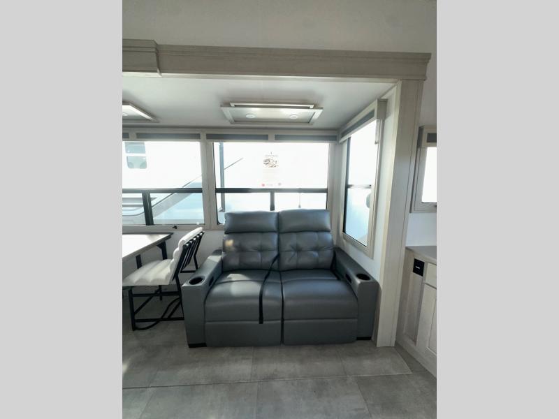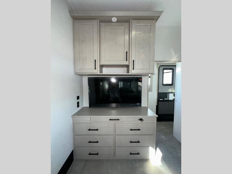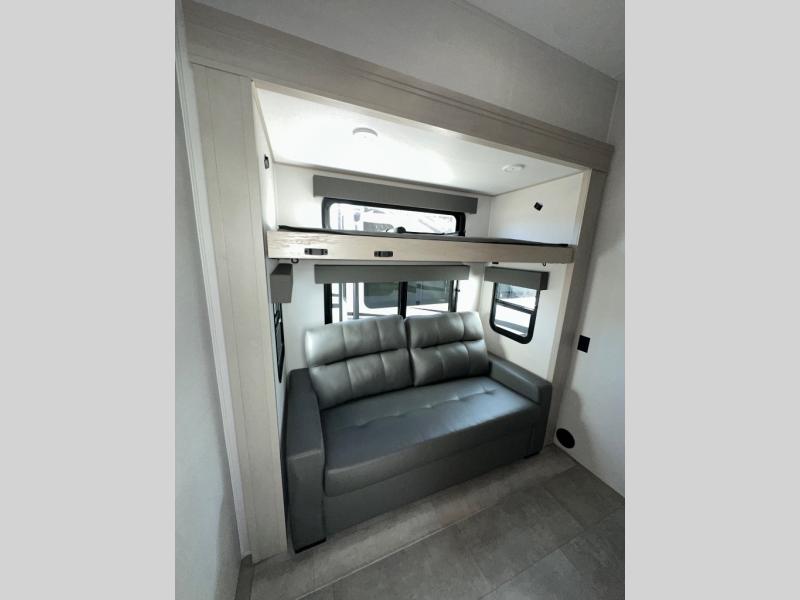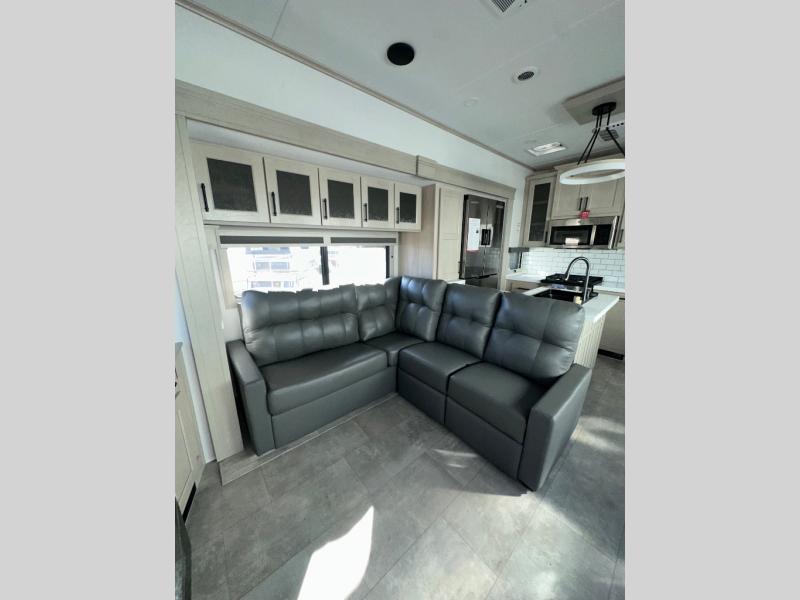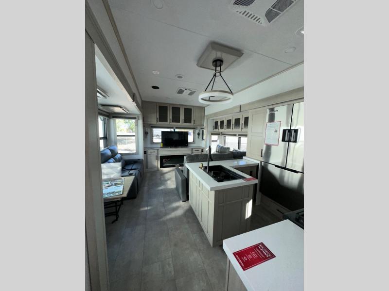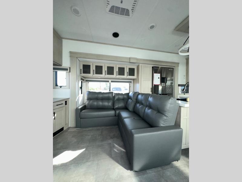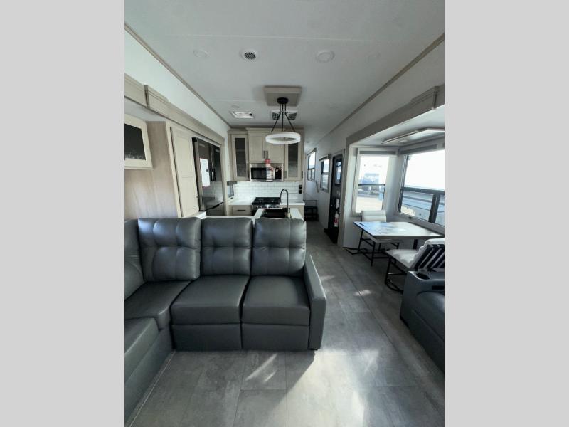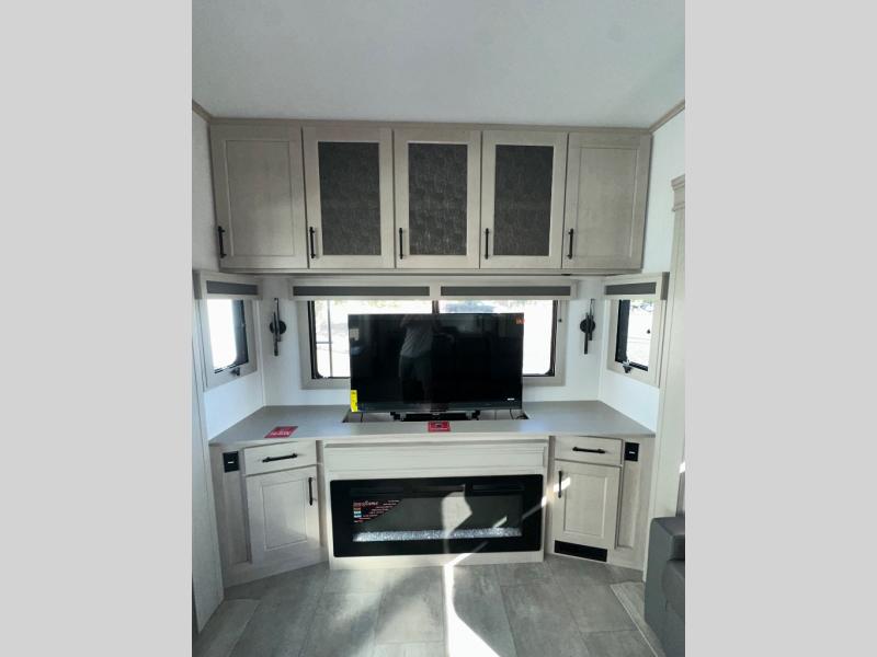 The whole gang will love camping in this spacious fifth wheel for five to six! You'll have your own bedroom up front with a queen bed slide out, a large front closet with a hamper and washer and dryer prep, plus a private entry door into the dual entry bath. Your guest can take the middle bedroom that includes a tri-fold sofa with a bunk above, a dresser/desk, plus a 50" TV for entertainment. A full kitchen includes an L-shaped counter, a 20 cu. ft. refrigerator, pull-out trash cans plus many more convenient features. And don't overlook the rear living area with its L-shaped sofa, theater seating, and free-standing dinette. There is also an entertainment center with a telescoping TV and a fireplace plus an electronics drawer to charge your phone or laptop.