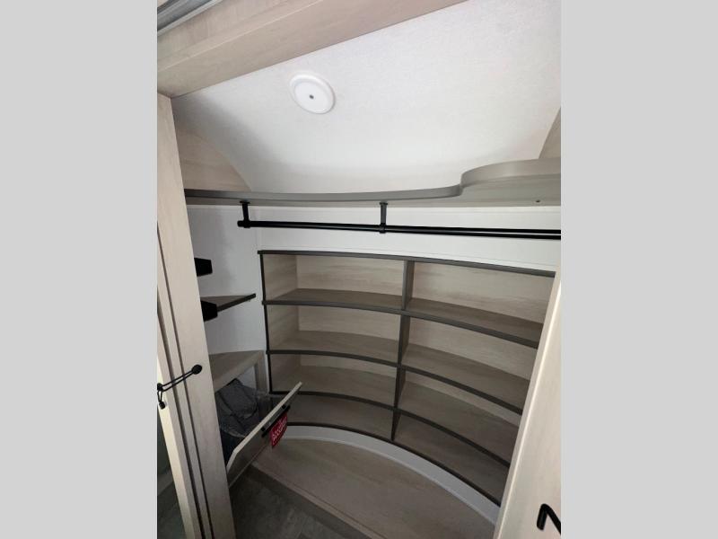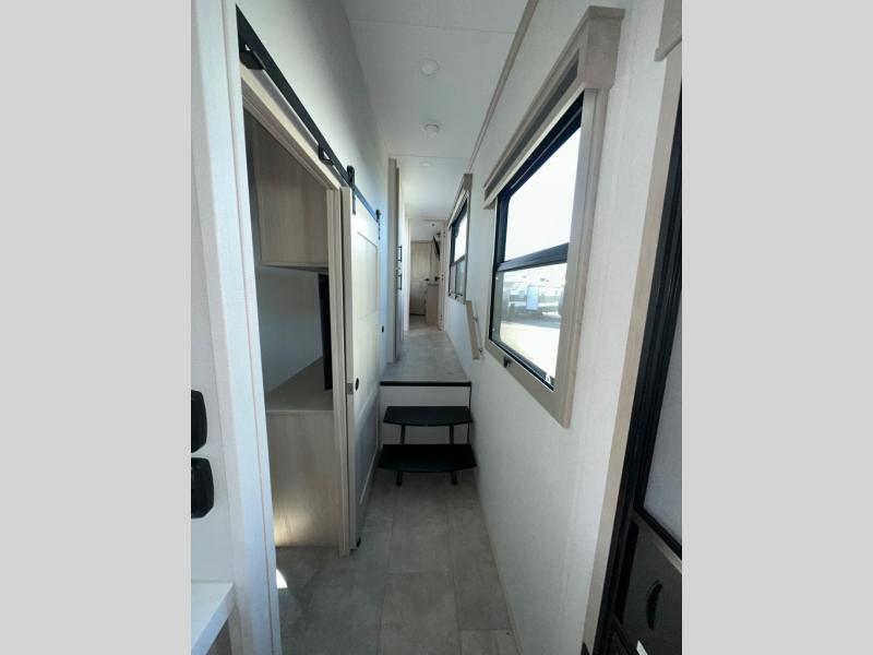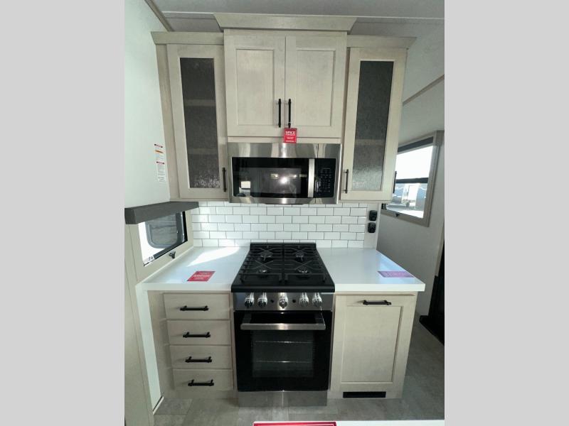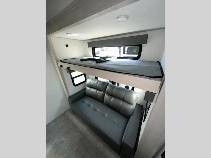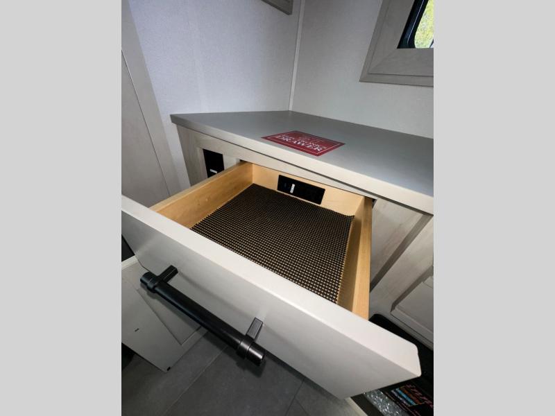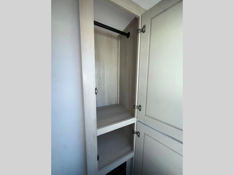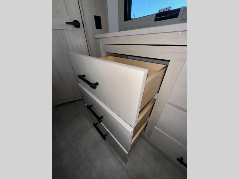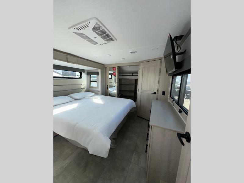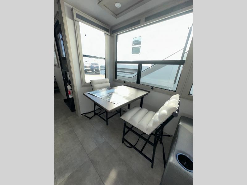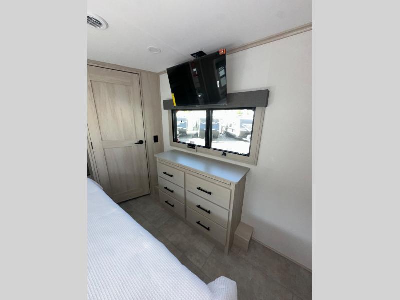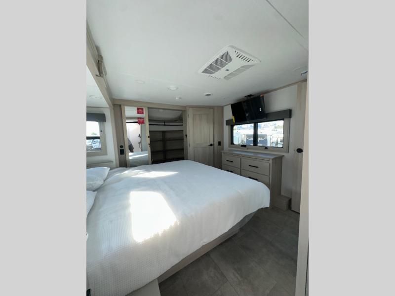 The whole gang will love camping in this spacious fifth wheel for five to six! You'll have your own bedroom up front with a queen bed slide out, a large front closet with a hamper and washer and dryer prep, plus a private entry door into the dual entry bath. Your guest can take the middle bedroom that includes a tri-fold sofa with a bunk above, a dresser/desk, plus a 50" TV for entertainment. A full kitchen includes an L-shaped counter, a 20 cu. ft. refrigerator, pull-out trash cans plus many more convenient features. And don't overlook the rear living area with its L-shaped sofa, theater seating, and free-standing dinette. There is also an entertainment center with a telescoping TV and a fireplace plus an electronics drawer to charge your phone or laptop.