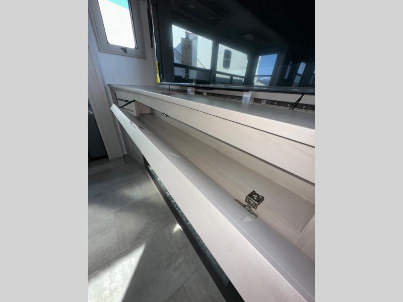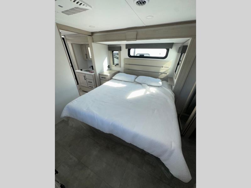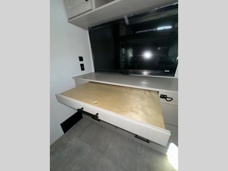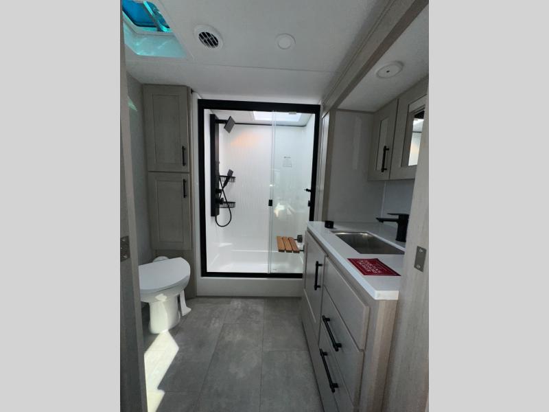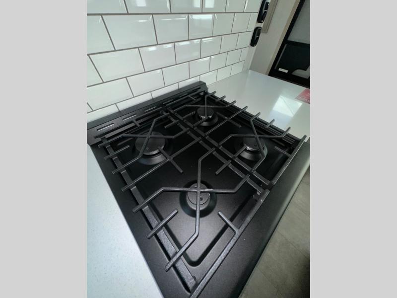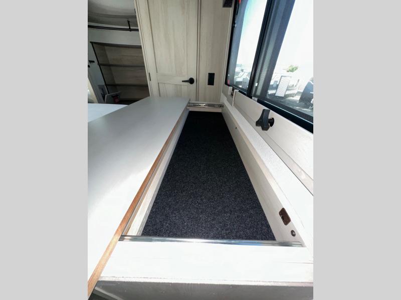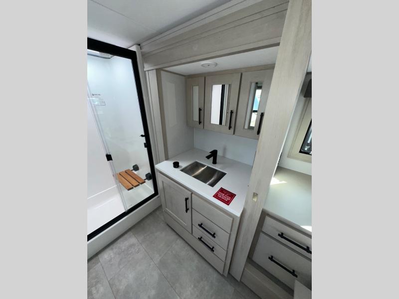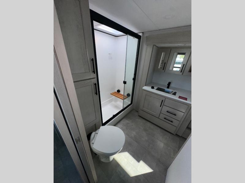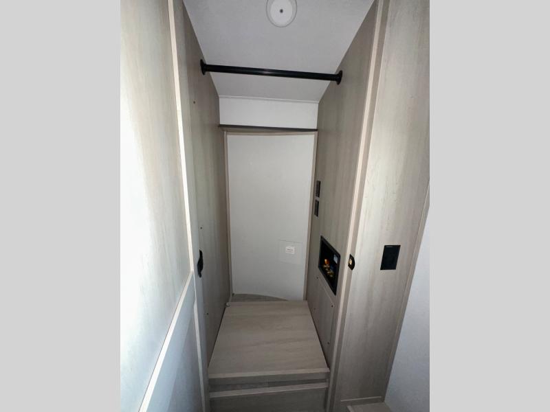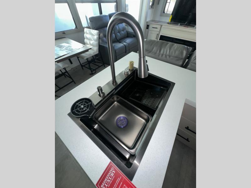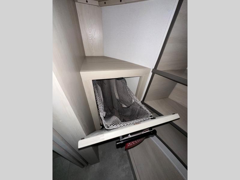 The whole gang will love camping in this spacious fifth wheel for five to six! You'll have your own bedroom up front with a queen bed slide out, a large front closet with a hamper and washer and dryer prep, plus a private entry door into the dual entry bath. Your guest can take the middle bedroom that includes a tri-fold sofa with a bunk above, a dresser/desk, plus a 50" TV for entertainment. A full kitchen includes an L-shaped counter, a 20 cu. ft. refrigerator, pull-out trash cans plus many more convenient features. And don't overlook the rear living area with its L-shaped sofa, theater seating, and free-standing dinette. There is also an entertainment center with a telescoping TV and a fireplace plus an electronics drawer to charge your phone or laptop.