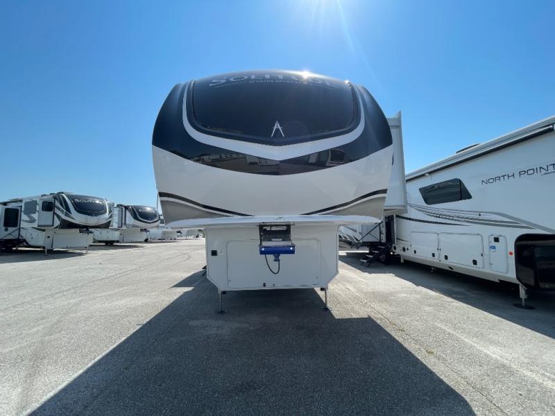 Each Solitude fifth wheel by Grand Design features a 101" wide-body construction, heavy duty 8,000 lb. axles, frameless tinted windows, and high-gloss gel coat sidewalls. You can camp year around thanks to the Weather-Tek Package that includes a 35K BTU high-capacity furnace, an all-in-one enclosed and heated utility center, and a fully enclosed underbelly with heated tanks and storage. Inside, you'll love the premium roller shades, hardwood cabinet doors, solid surface countertops, plus residential finishes throughout to make you truly feel at home. Each model also includes a MORryde CRE3000 suspension system, self adjusting brakes, and a MORryde pin box that will provide smooth towing from home to campground. Affordable luxury is possible with the Solitude fifth wheels; choose yours today!