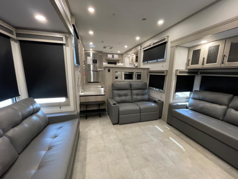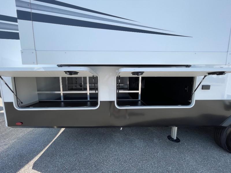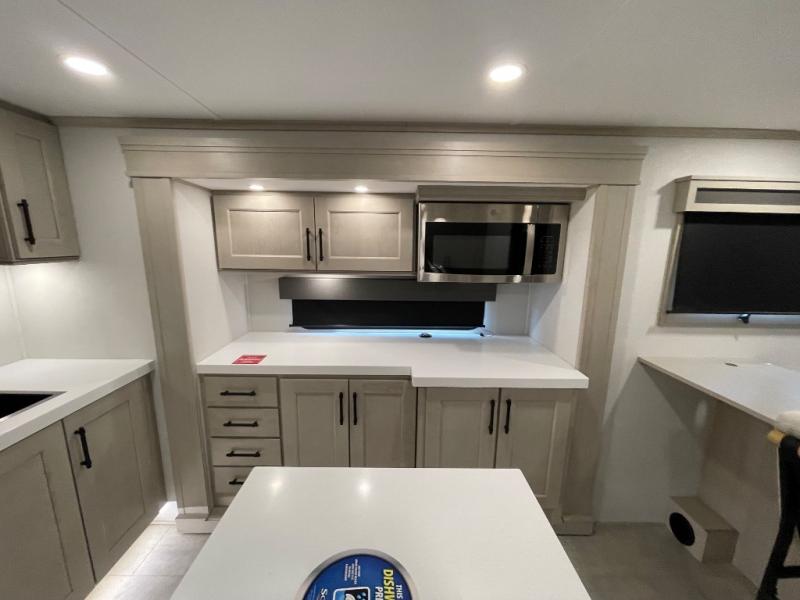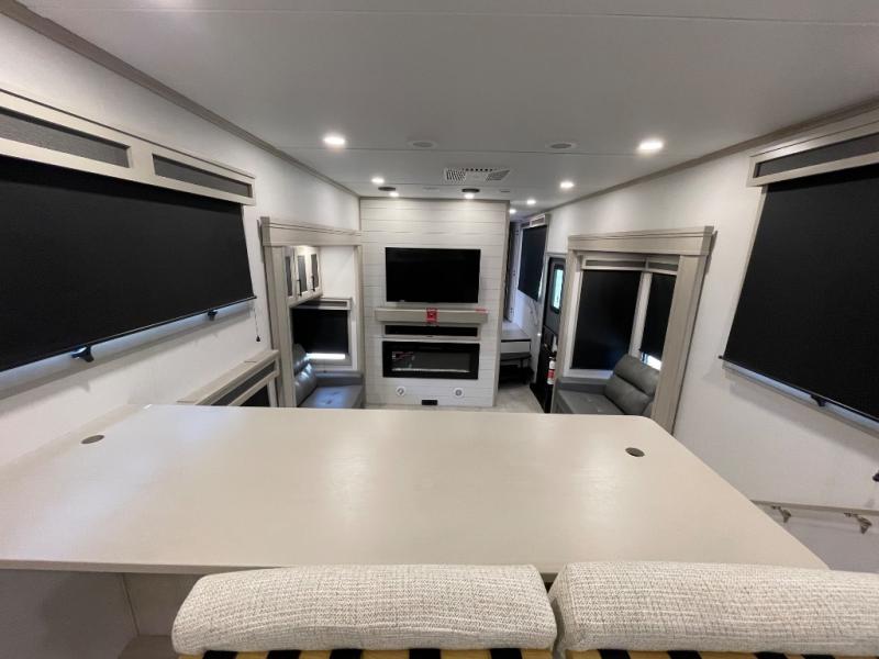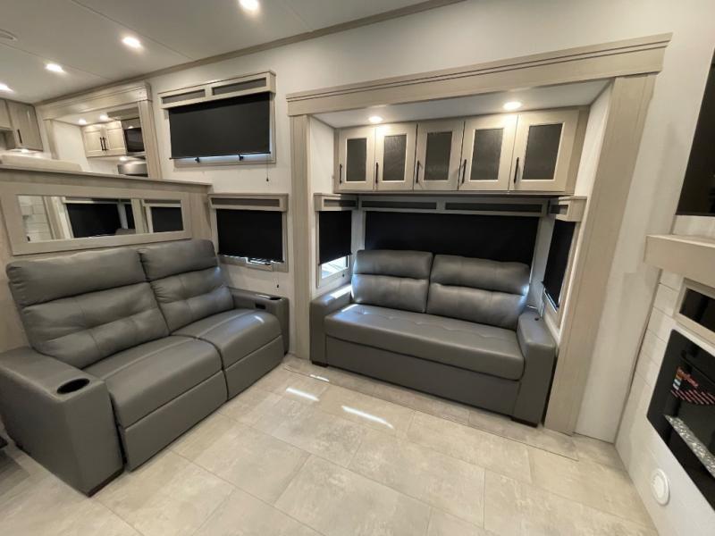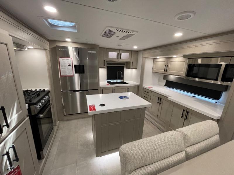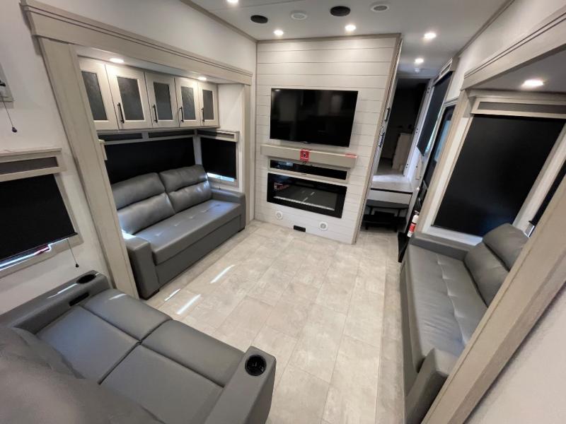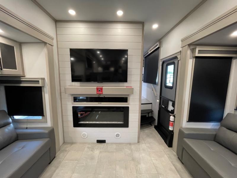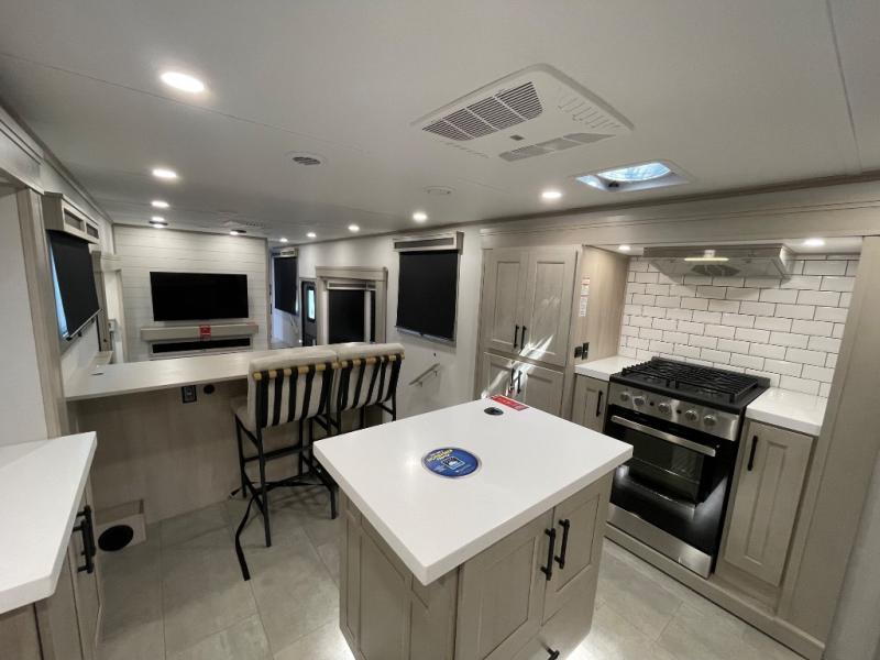 Enjoy each and every vacation, month-long trips, or even extended stays at an RV park in this spacious fifth wheel! The raised rear kitchen gives the cook plenty of room to whip up any type of meal using the stainless steel appliances including a built-in oven, an oversized pantry, and the raised bar top will provide you even more counter space on top of dining with two chairs that overlook the middle living area. Relaxing is made easy thanks to two tri-fold sofas and theatre seating while watching the big game on the LED Smart TV and enjoying the fireplace below. At night, retire to your own queen bed which slides out to provide more floor space, and you can store your clothes in the slide top dresser and front closet with washer and dryer prep.