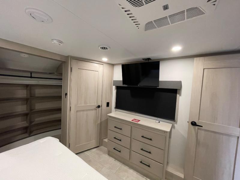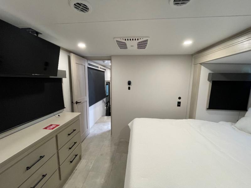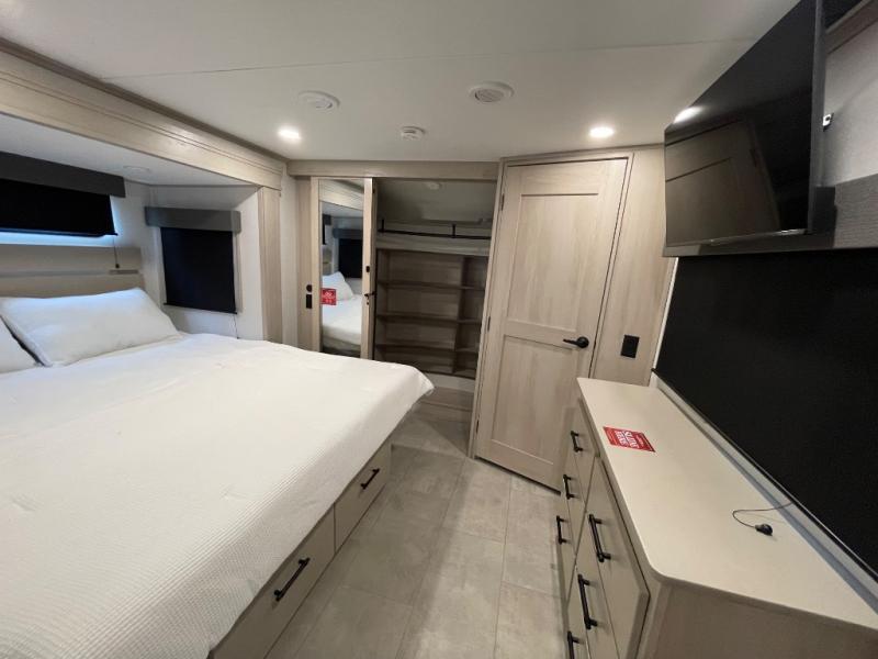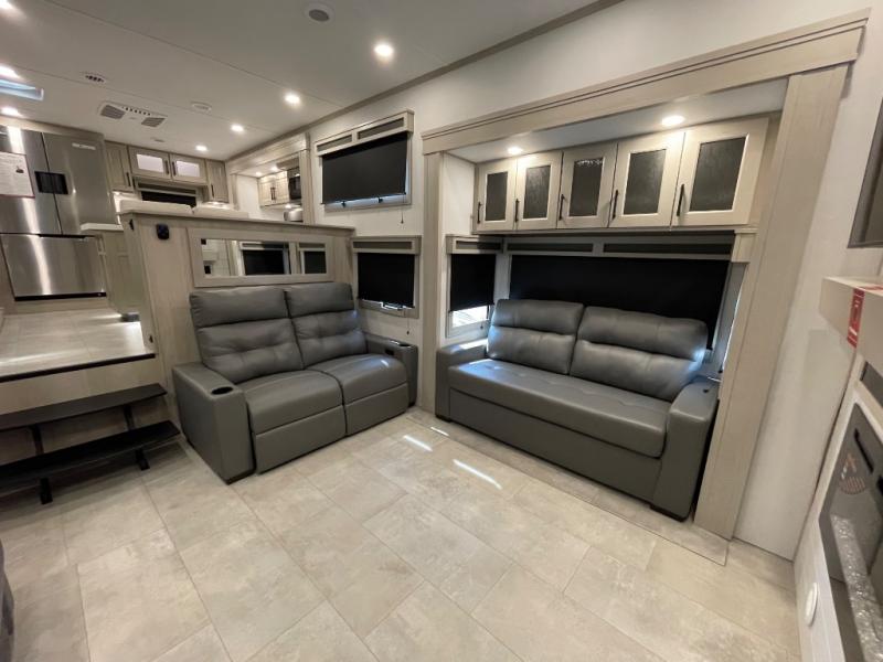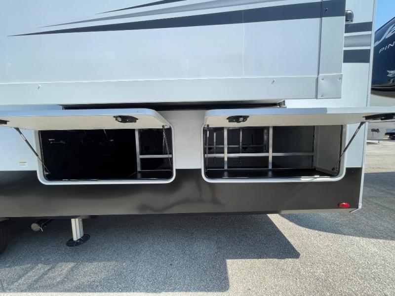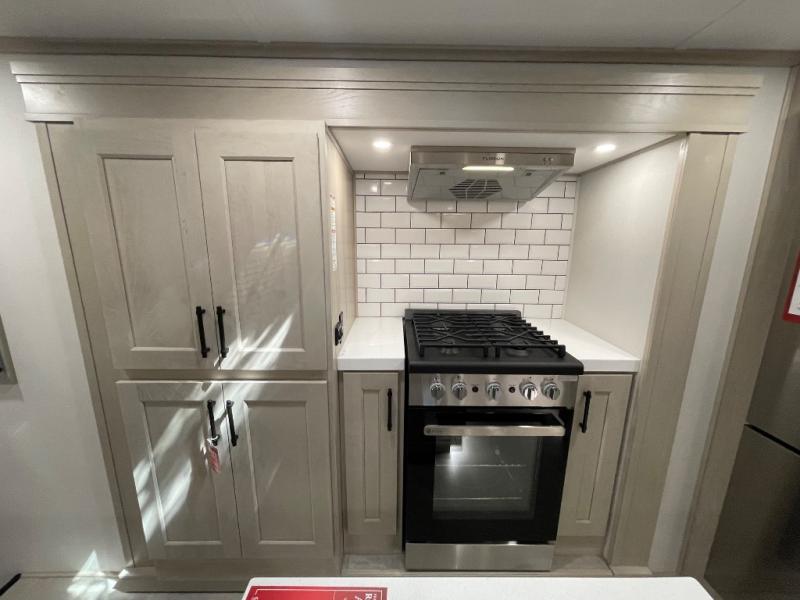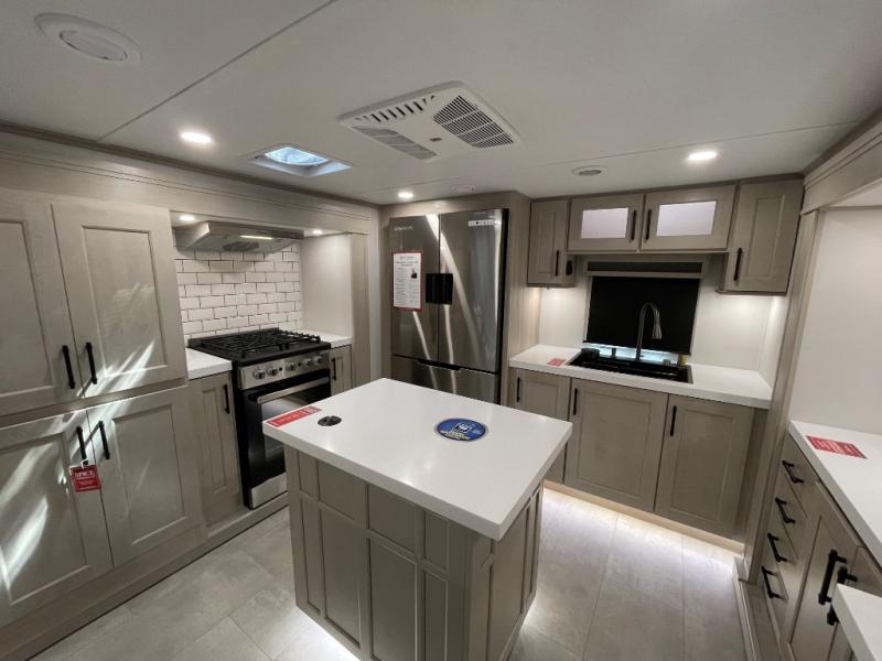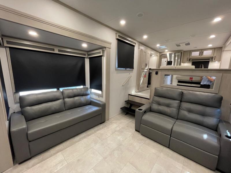 Enjoy each and every vacation, month-long trips, or even extended stays at an RV park in this spacious fifth wheel! The raised rear kitchen gives the cook plenty of room to whip up any type of meal using the stainless steel appliances including a built-in oven, an oversized pantry, and the raised bar top will provide you even more counter space on top of dining with two chairs that overlook the middle living area. Relaxing is made easy thanks to two tri-fold sofas and theatre seating while watching the big game on the LED Smart TV and enjoying the fireplace below. At night, retire to your own queen bed which slides out to provide more floor space, and you can store your clothes in the slide top dresser and front closet with washer and dryer prep.