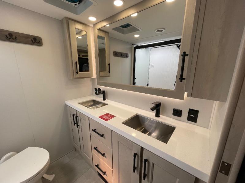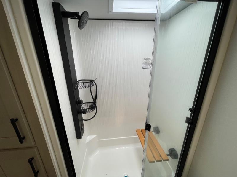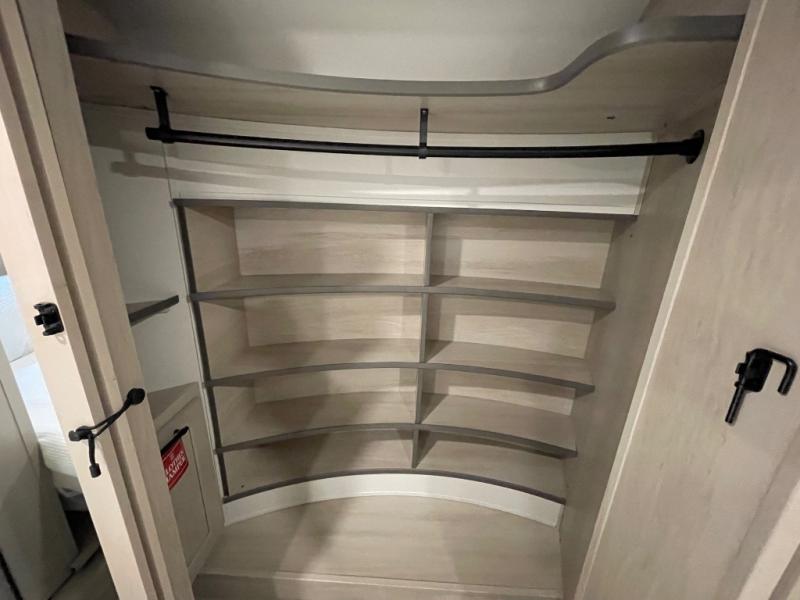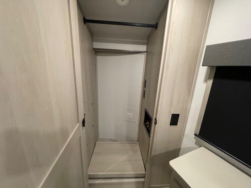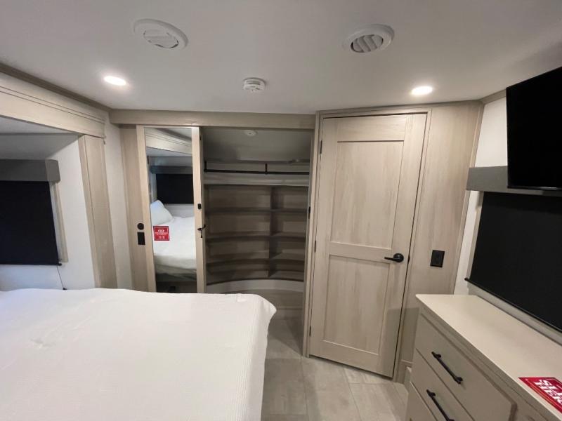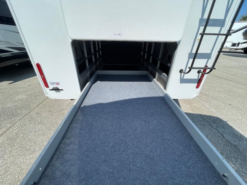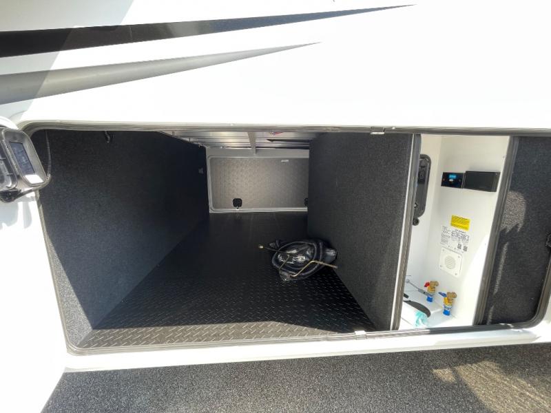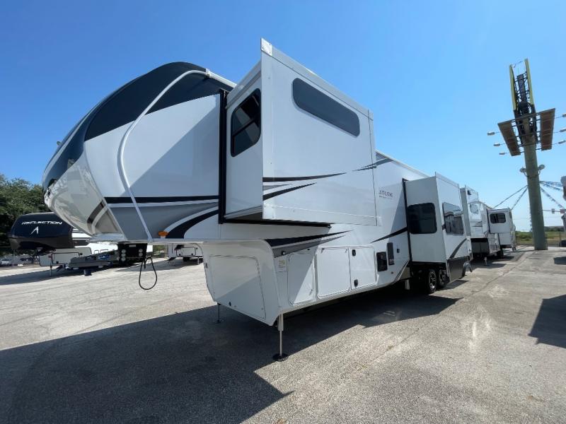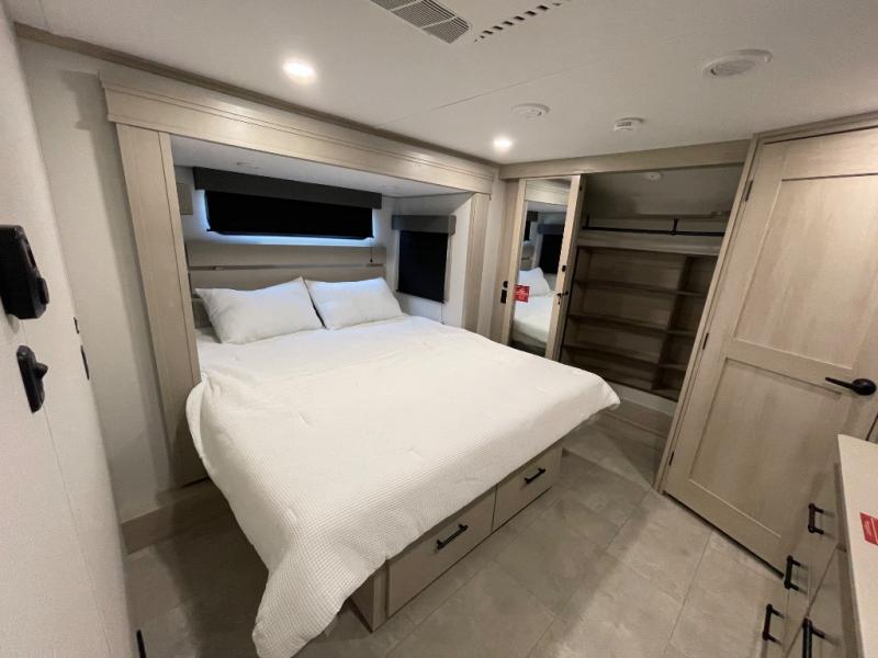 Enjoy each and every vacation, month-long trips, or even extended stays at an RV park in this spacious fifth wheel! The raised rear kitchen gives the cook plenty of room to whip up any type of meal using the stainless steel appliances including a built-in oven, an oversized pantry, and the raised bar top will provide you even more counter space on top of dining with two chairs that overlook the middle living area. Relaxing is made easy thanks to two tri-fold sofas and theatre seating while watching the big game on the LED Smart TV and enjoying the fireplace below. At night, retire to your own queen bed which slides out to provide more floor space, and you can store your clothes in the slide top dresser and front closet with washer and dryer prep.