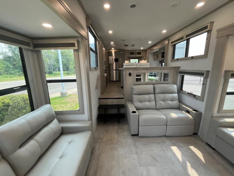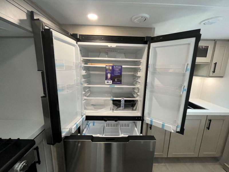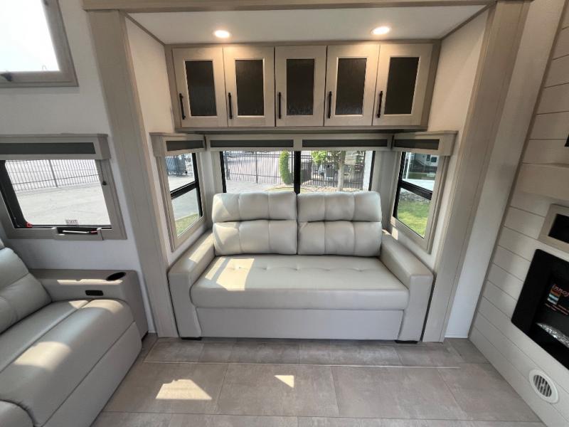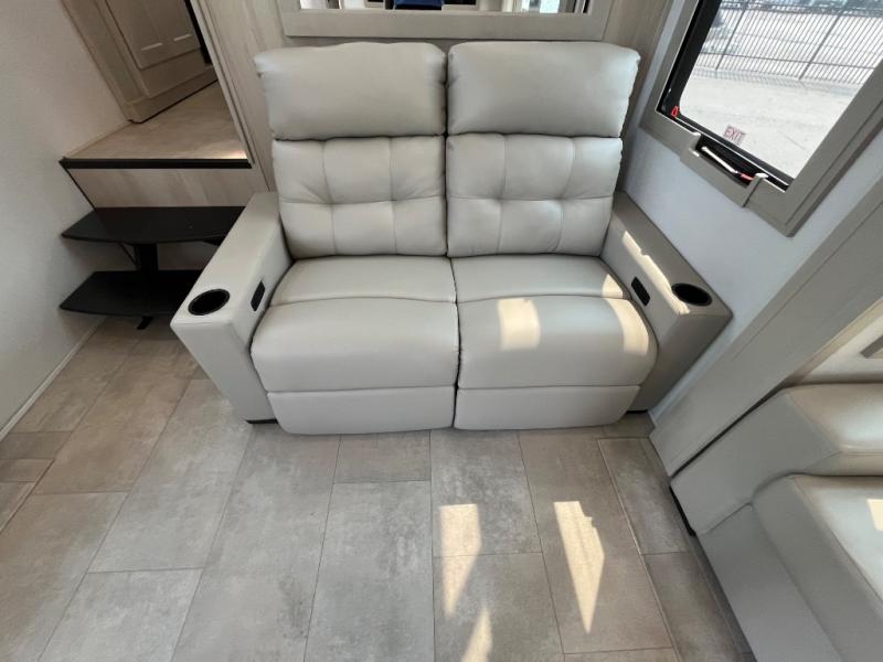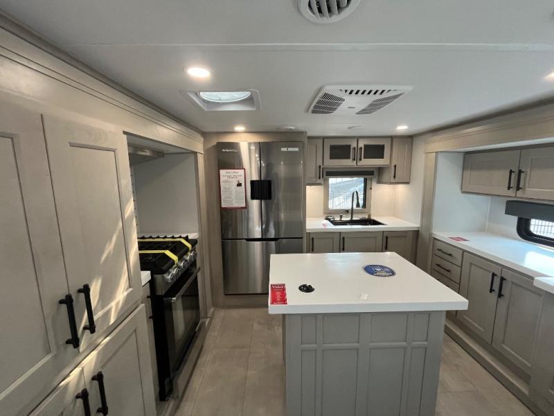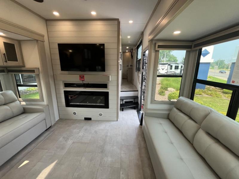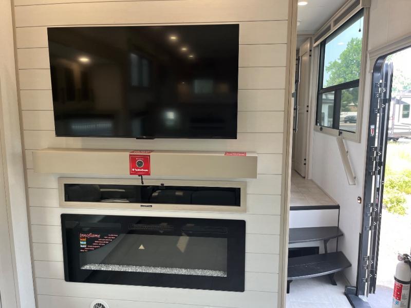 Enjoy each and every vacation, month-long trips, or even extended stays at an RV park in this spacious fifth wheel! The raised rear kitchen gives the cook plenty of room to whip up any type of meal using the stainless steel appliances including a built-in oven, an oversized pantry, and the raised bar top will provide you even more counter space on top of dining with two chairs that overlook the middle living area. Relaxing is made easy thanks to two tri-fold sofas and theatre seating while watching the big game on the LED Smart TV and enjoying the fireplace below. At night, retire to your own queen bed which slides out to provide more floor space, and you can store your clothes in the slide top dresser and front closet with washer and dryer prep.