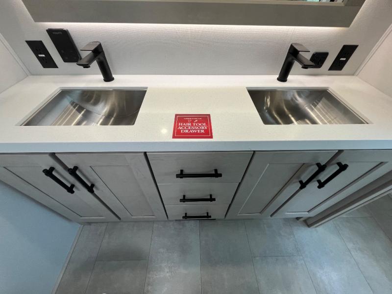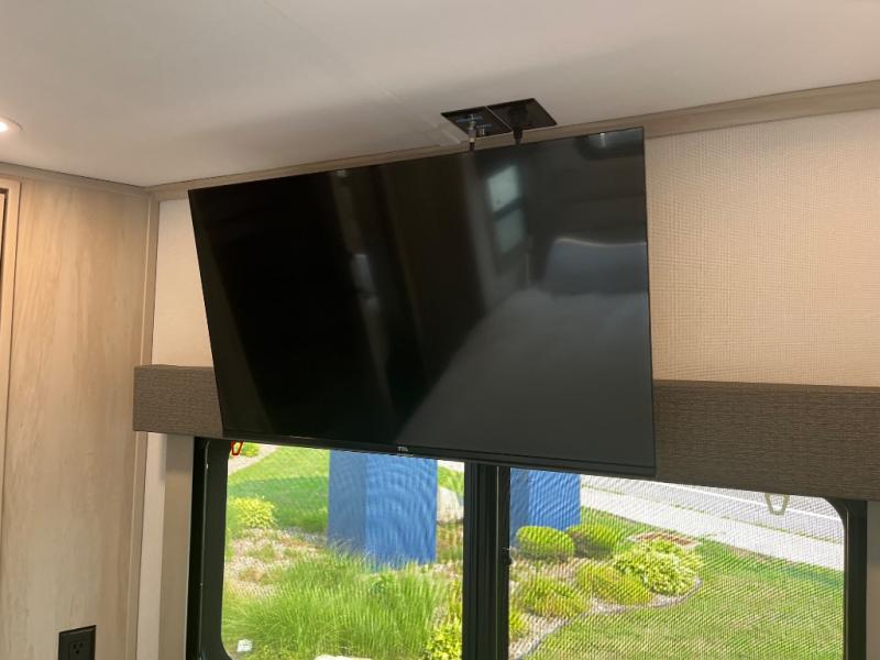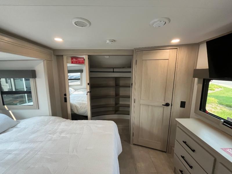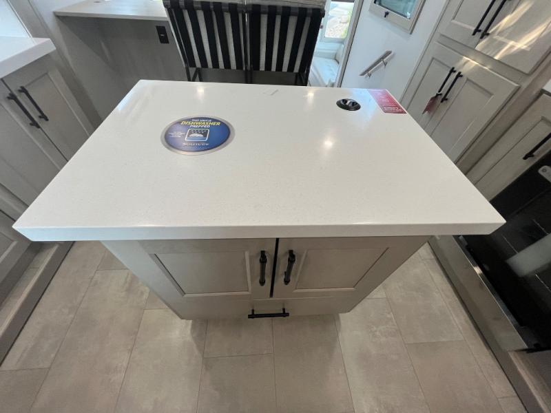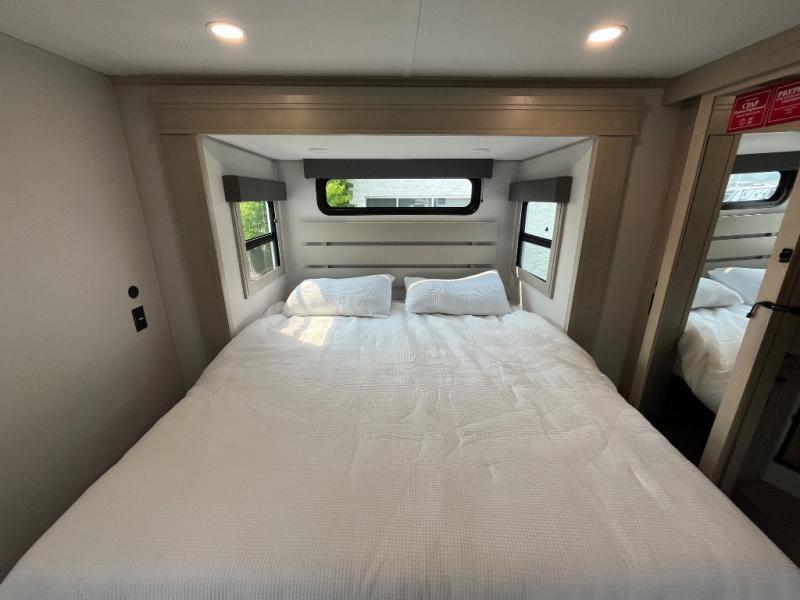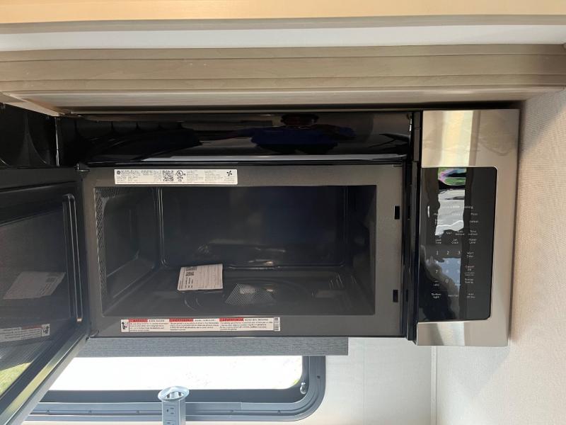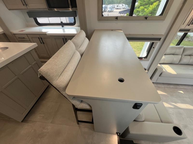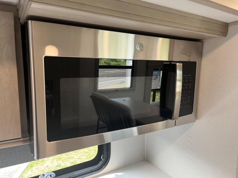 Enjoy each and every vacation, month-long trips, or even extended stays at an RV park in this spacious fifth wheel! The raised rear kitchen gives the cook plenty of room to whip up any type of meal using the stainless steel appliances including a built-in oven, an oversized pantry, and the raised bar top will provide you even more counter space on top of dining with two chairs that overlook the middle living area. Relaxing is made easy thanks to two tri-fold sofas and theatre seating while watching the big game on the LED Smart TV and enjoying the fireplace below. At night, retire to your own queen bed which slides out to provide more floor space, and you can store your clothes in the slide top dresser and front closet with washer and dryer prep.