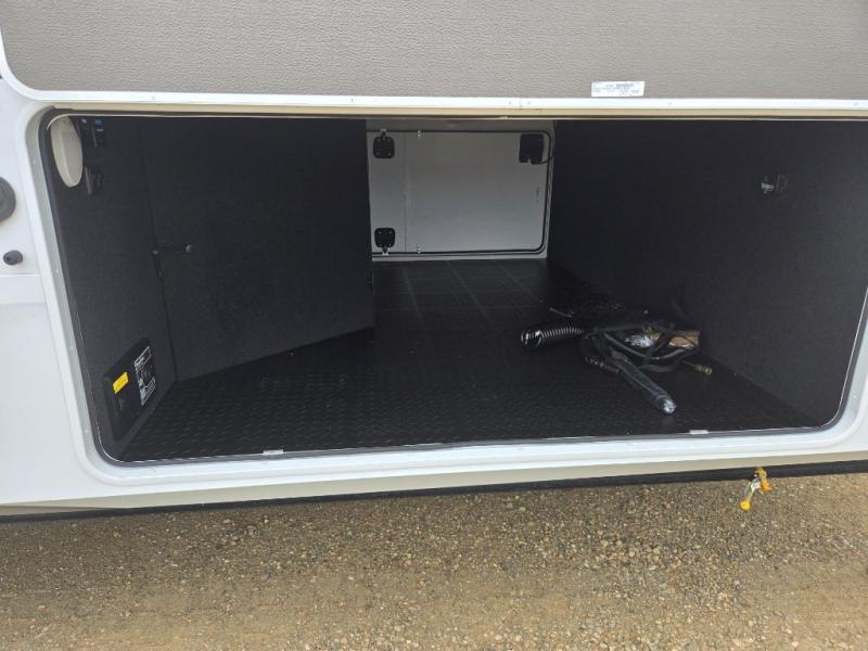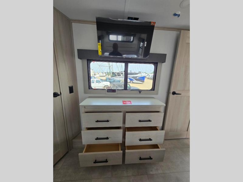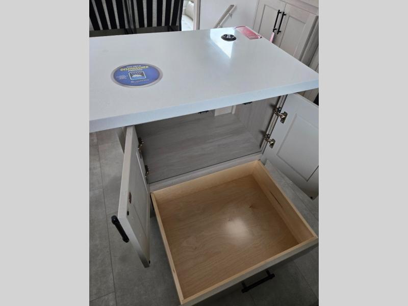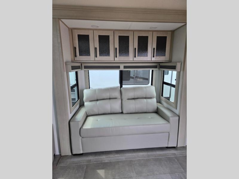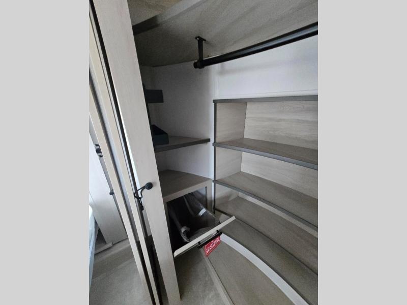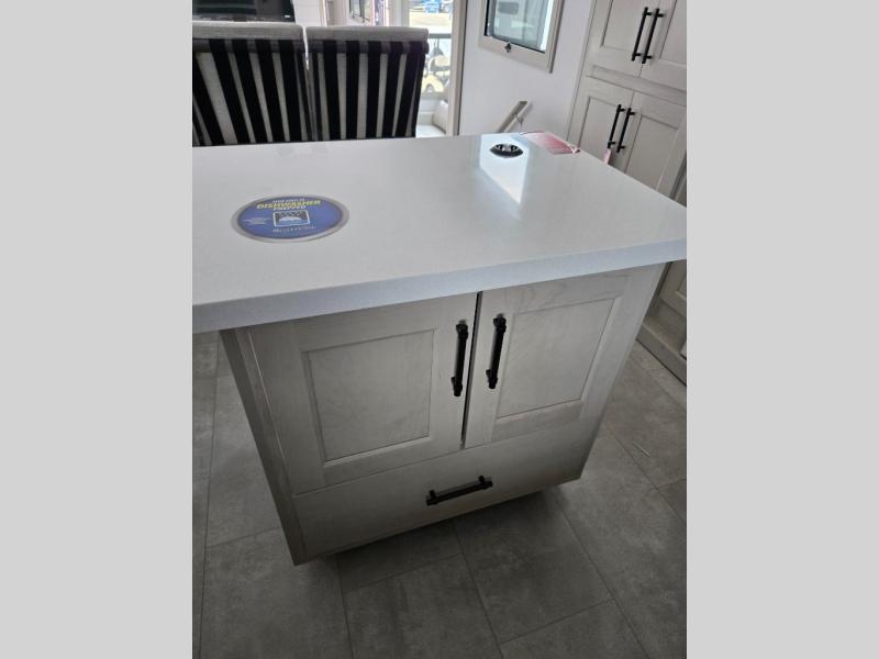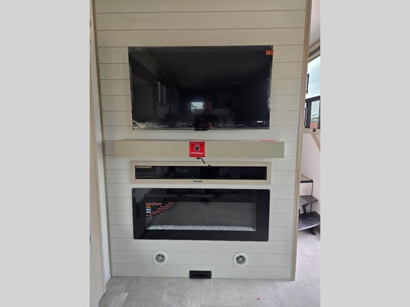 Enjoy each and every vacation, month-long trips, or even extended stays at an RV park in this spacious fifth wheel! The raised rear kitchen gives the cook plenty of room to whip up any type of meal using the stainless steel appliances including a built-in oven, an oversized pantry, and the raised bar top will provide you even more counter space on top of dining with two chairs that overlook the middle living area. Relaxing is made easy thanks to two tri-fold sofas and theatre seating while watching the big game on the LED Smart TV and enjoying the fireplace below. At night, retire to your own queen bed which slides out to provide more floor space, and you can store your clothes in the slide top dresser and front closet with washer and dryer prep.