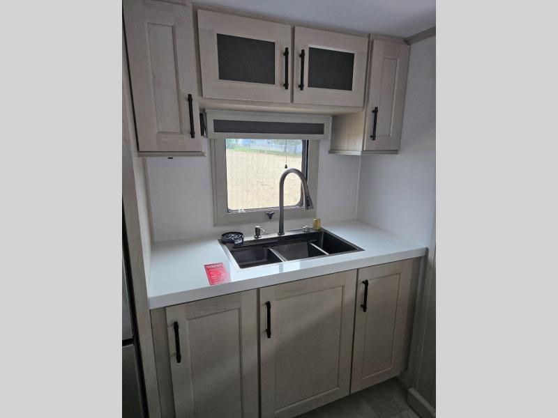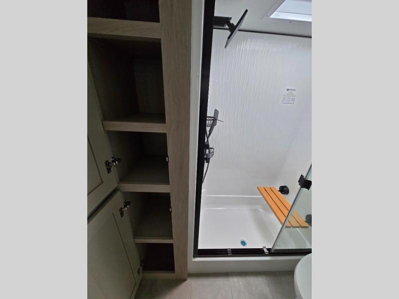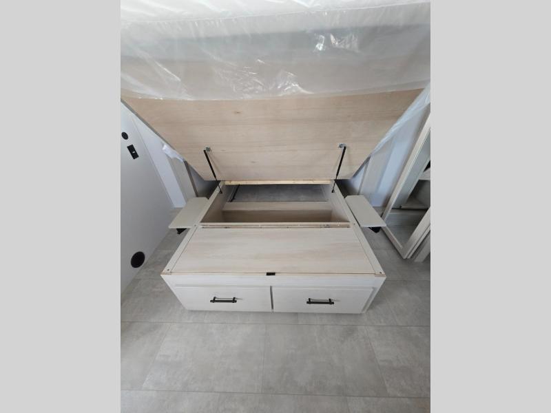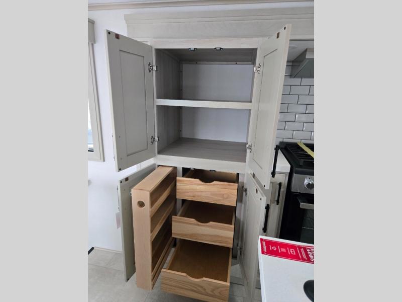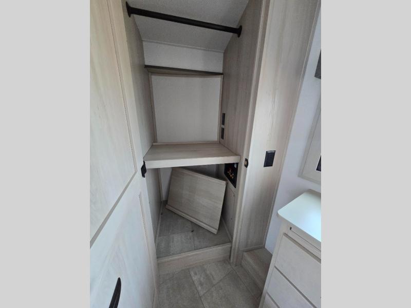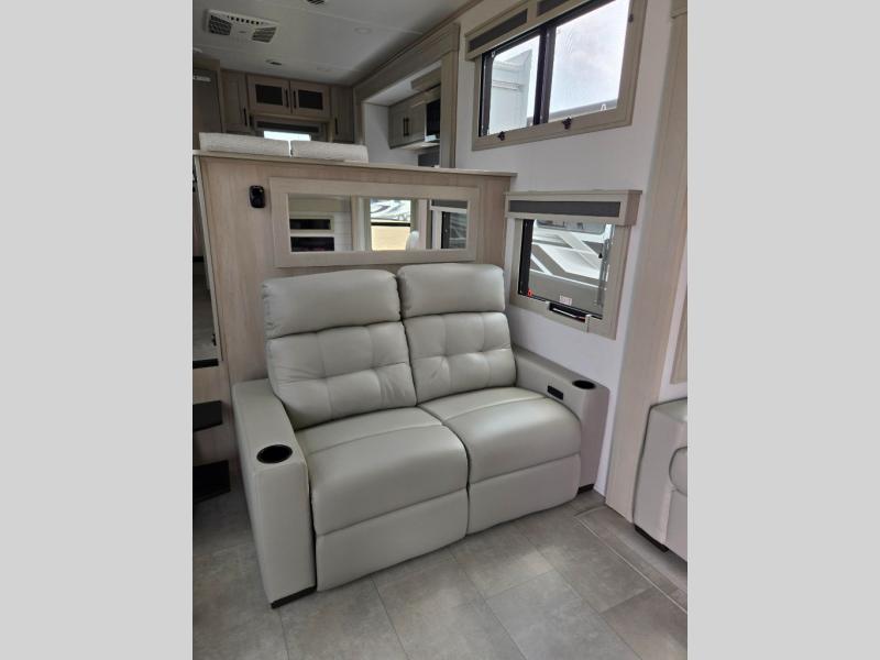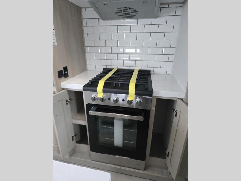 Enjoy each and every vacation, month-long trips, or even extended stays at an RV park in this spacious fifth wheel! The raised rear kitchen gives the cook plenty of room to whip up any type of meal using the stainless steel appliances including a built-in oven, an oversized pantry, and the raised bar top will provide you even more counter space on top of dining with two chairs that overlook the middle living area. Relaxing is made easy thanks to two tri-fold sofas and theatre seating while watching the big game on the LED Smart TV and enjoying the fireplace below. At night, retire to your own queen bed which slides out to provide more floor space, and you can store your clothes in the slide top dresser and front closet with washer and dryer prep.