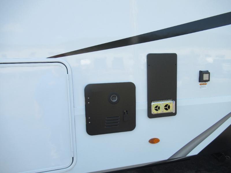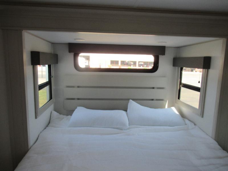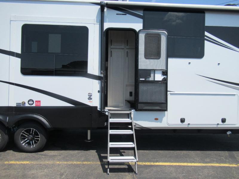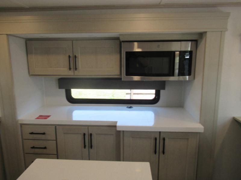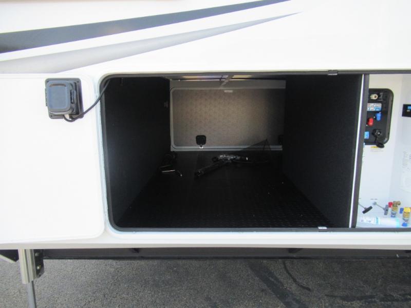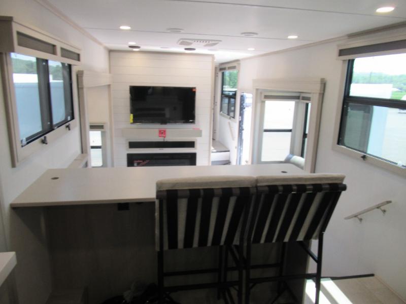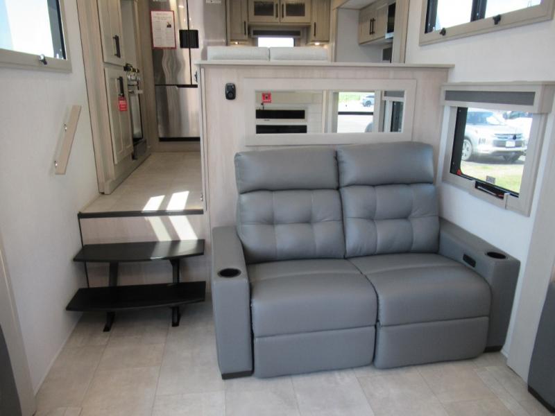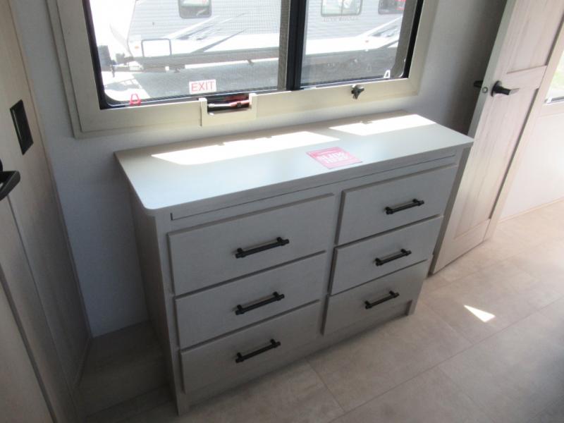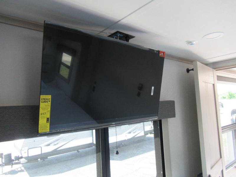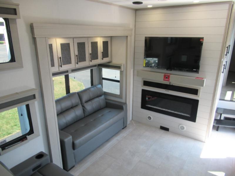 Enjoy each and every vacation, month-long trips, or even extended stays at an RV park in this spacious fifth wheel! The raised rear kitchen gives the cook plenty of room to whip up any type of meal using the stainless steel appliances including a built-in oven, an oversized pantry, and the raised bar top will provide you even more counter space on top of dining with two chairs that overlook the middle living area. Relaxing is made easy thanks to two tri-fold sofas and theatre seating while watching the big game on the LED Smart TV and enjoying the fireplace below. At night, retire to your own queen bed which slides out to provide more floor space, and you can store your clothes in the slide top dresser and front closet with washer and dryer prep.