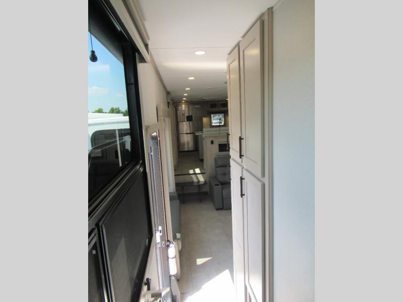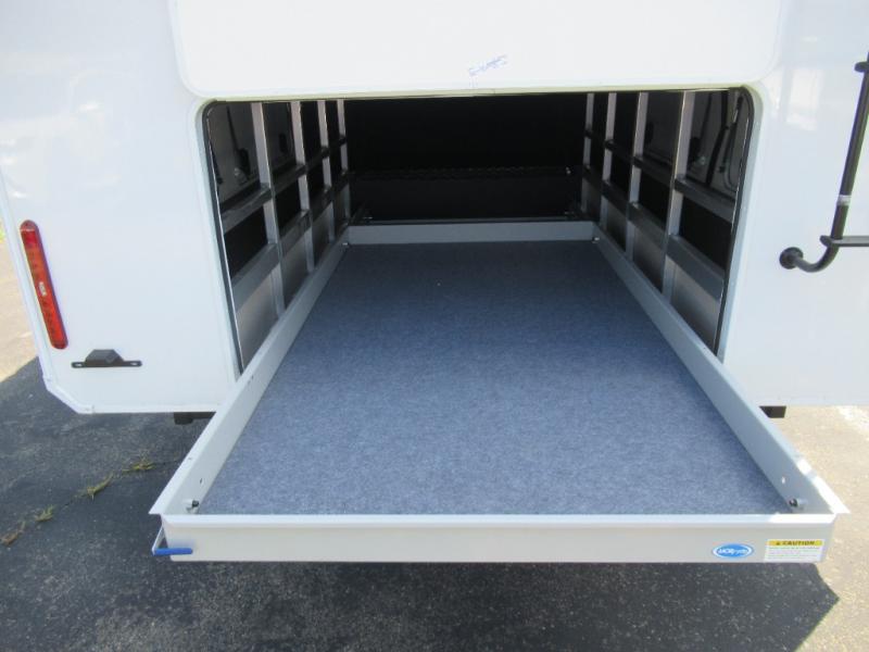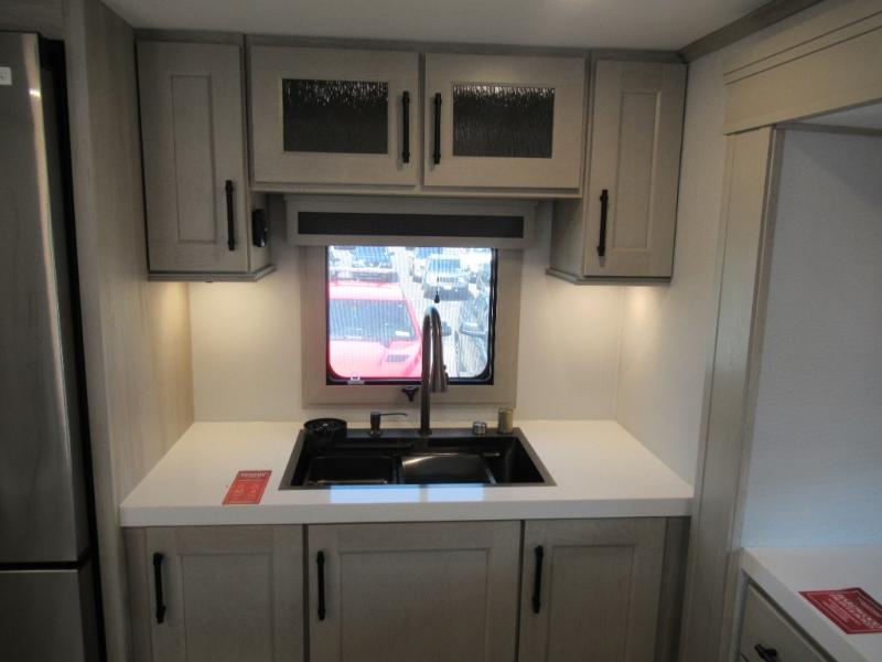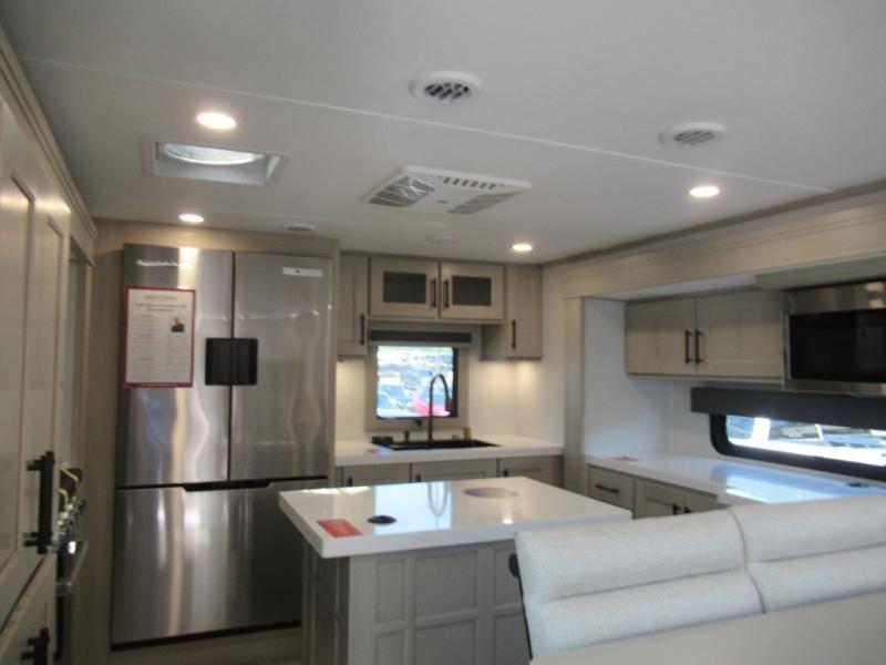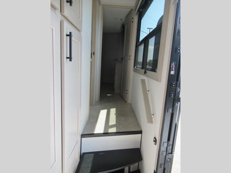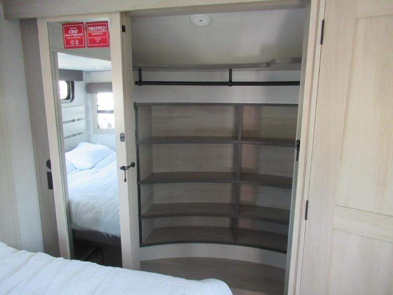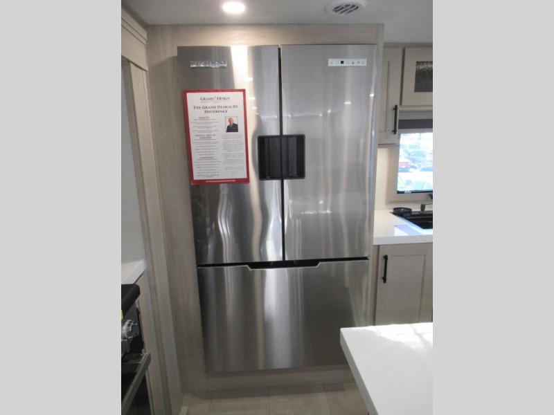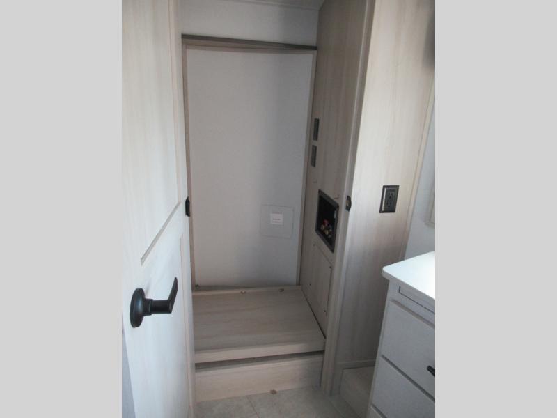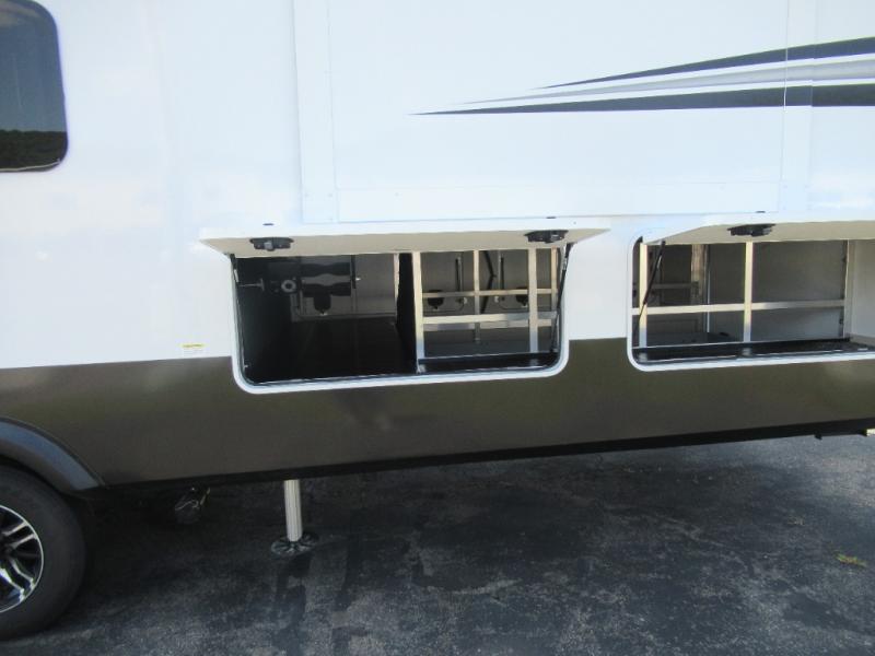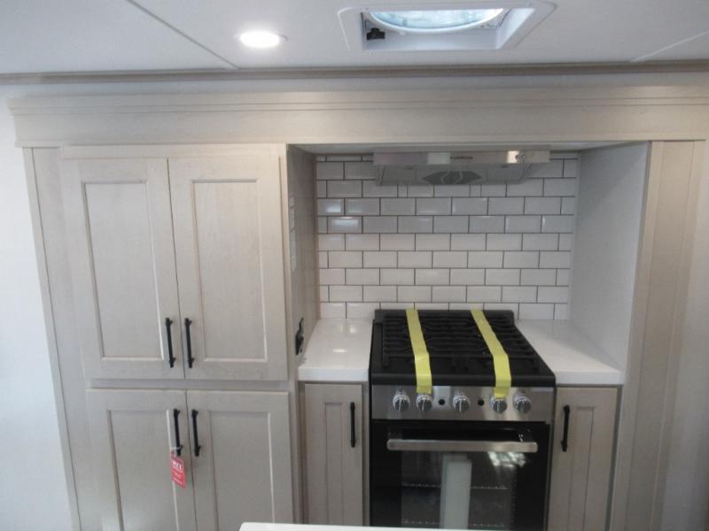 Enjoy each and every vacation, month-long trips, or even extended stays at an RV park in this spacious fifth wheel! The raised rear kitchen gives the cook plenty of room to whip up any type of meal using the stainless steel appliances including a built-in oven, an oversized pantry, and the raised bar top will provide you even more counter space on top of dining with two chairs that overlook the middle living area. Relaxing is made easy thanks to two tri-fold sofas and theatre seating while watching the big game on the LED Smart TV and enjoying the fireplace below. At night, retire to your own queen bed which slides out to provide more floor space, and you can store your clothes in the slide top dresser and front closet with washer and dryer prep.