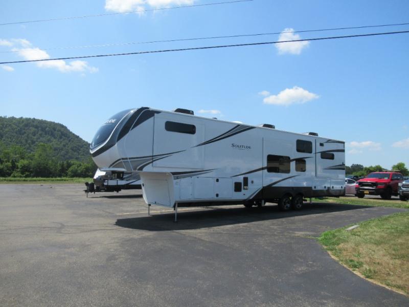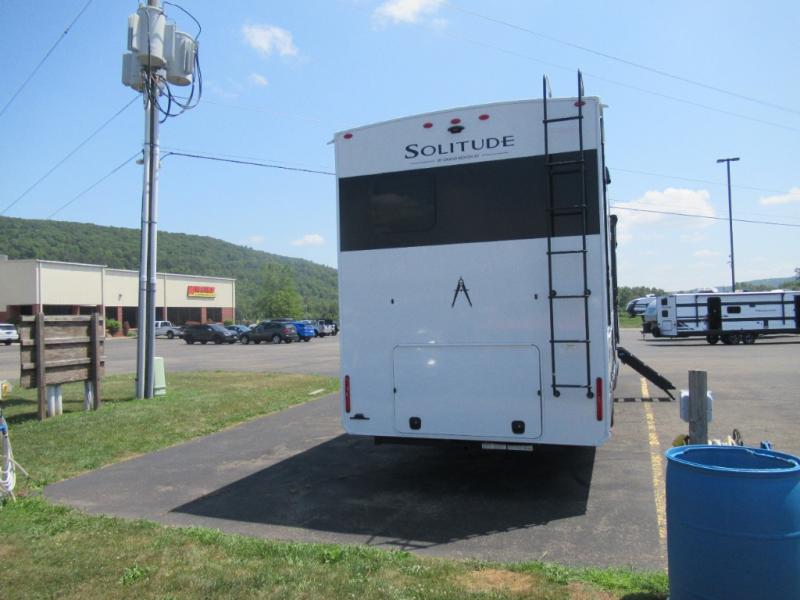 Each Solitude fifth wheel by Grand Design features a 101" wide-body construction, heavy duty 8,000 lb. axles, frameless tinted windows, and high-gloss gel coat sidewalls. You can camp year around thanks to the Weather-Tek Package that includes a 35K BTU high-capacity furnace, an all-in-one enclosed and heated utility center, and a fully enclosed underbelly with heated tanks and storage. Inside, you'll love the premium roller shades, hardwood cabinet doors, solid surface countertops, plus residential finishes throughout to make you truly feel at home. Each model also includes a MORryde CRE3000 suspension system, self adjusting brakes, and a MORryde pin box that will provide smooth towing from home to campground. Affordable luxury is possible with the Solitude fifth wheels; choose yours today!