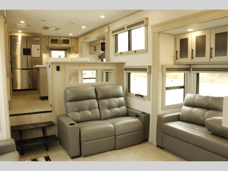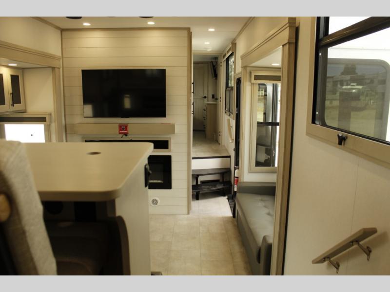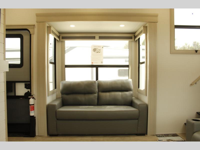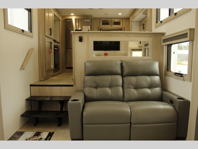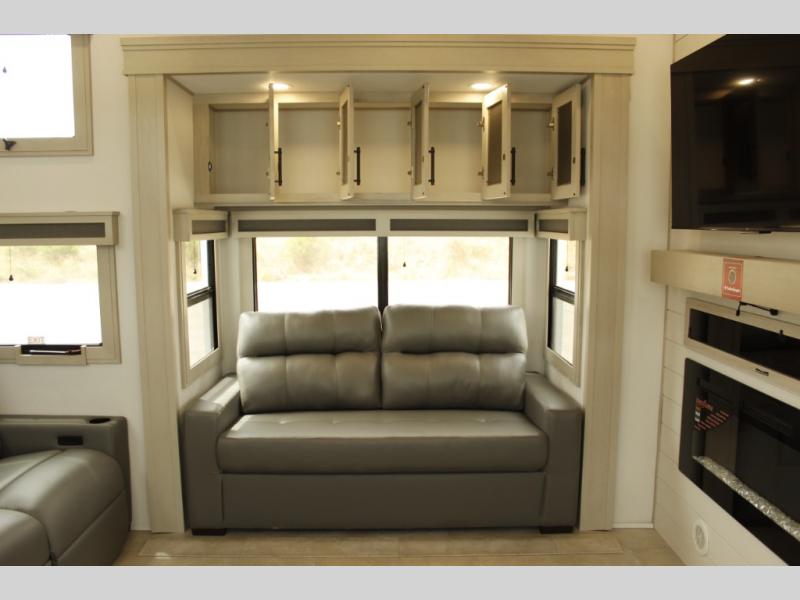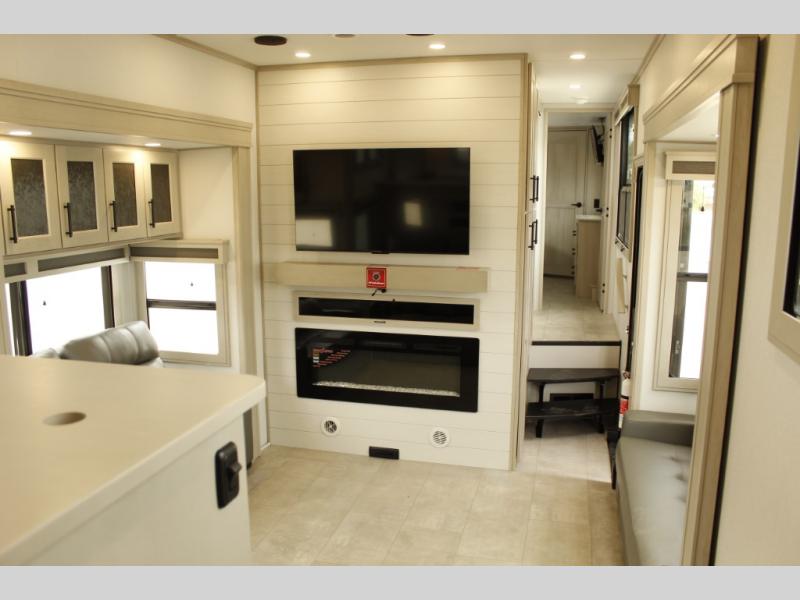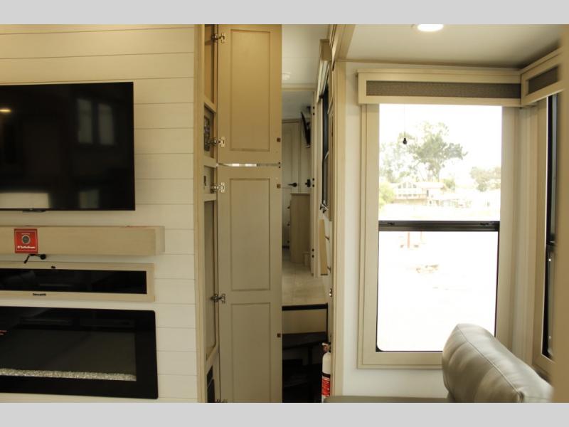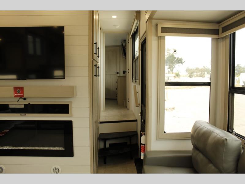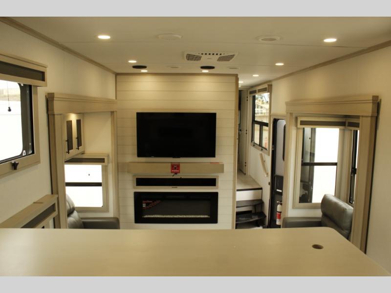 Enjoy each and every vacation, month-long trips, or even extended stays at an RV park in this spacious fifth wheel! The raised rear kitchen gives the cook plenty of room to whip up any type of meal using the stainless steel appliances including a built-in oven, an oversized pantry, and the raised bar top will provide you even more counter space on top of dining with two chairs that overlook the middle living area. Relaxing is made easy thanks to two tri-fold sofas and theatre seating while watching the big game on the LED Smart TV and enjoying the fireplace below. At night, retire to your own queen bed which slides out to provide more floor space, and you can store your clothes in the slide top dresser and front closet with washer and dryer prep.