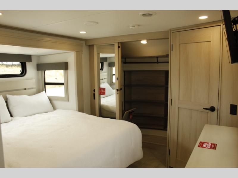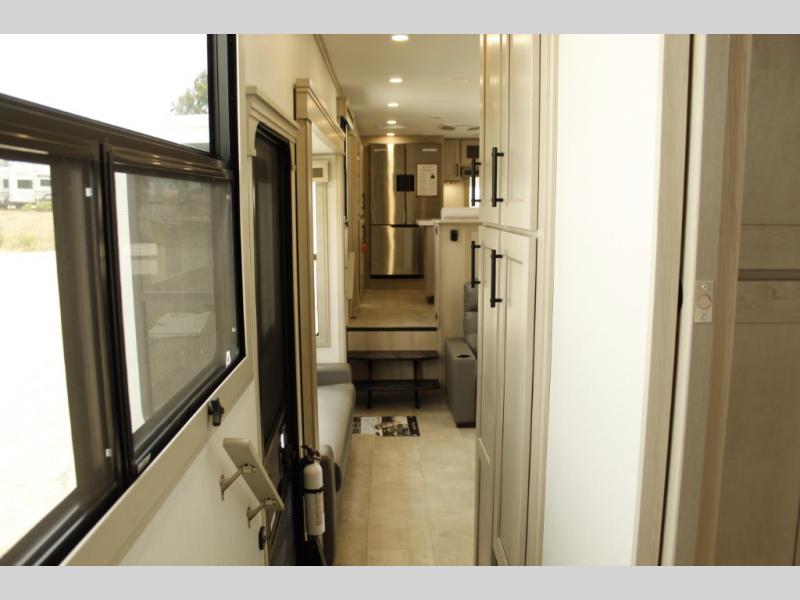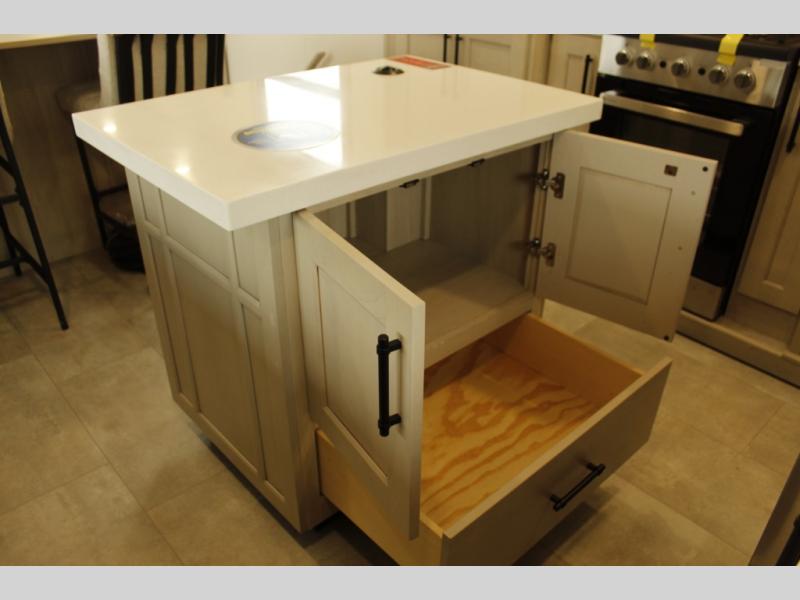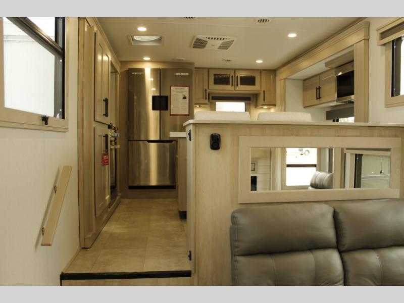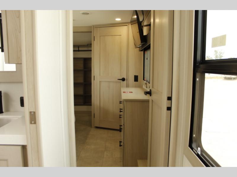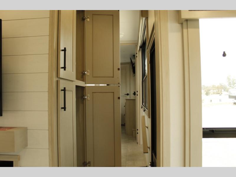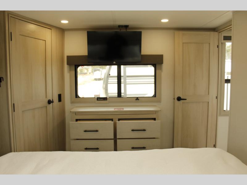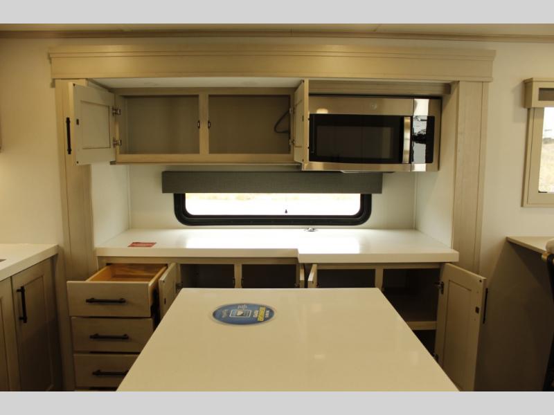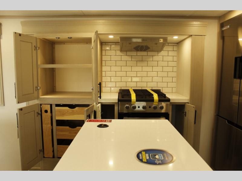 Enjoy each and every vacation, month-long trips, or even extended stays at an RV park in this spacious fifth wheel! The raised rear kitchen gives the cook plenty of room to whip up any type of meal using the stainless steel appliances including a built-in oven, an oversized pantry, and the raised bar top will provide you even more counter space on top of dining with two chairs that overlook the middle living area. Relaxing is made easy thanks to two tri-fold sofas and theatre seating while watching the big game on the LED Smart TV and enjoying the fireplace below. At night, retire to your own queen bed which slides out to provide more floor space, and you can store your clothes in the slide top dresser and front closet with washer and dryer prep.