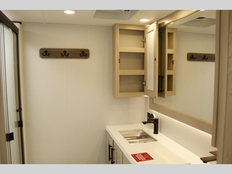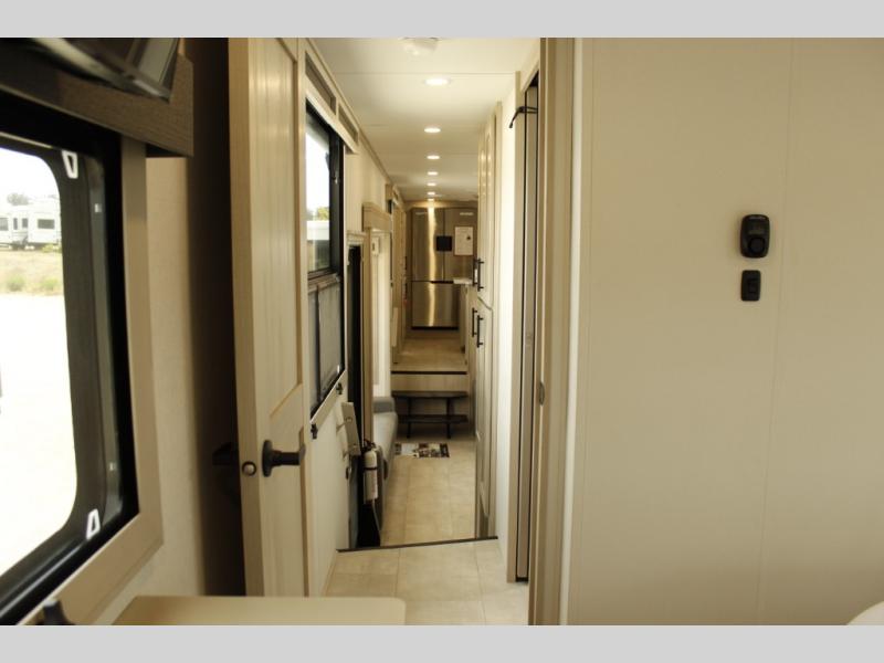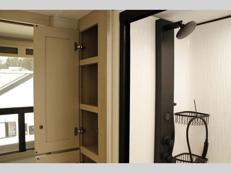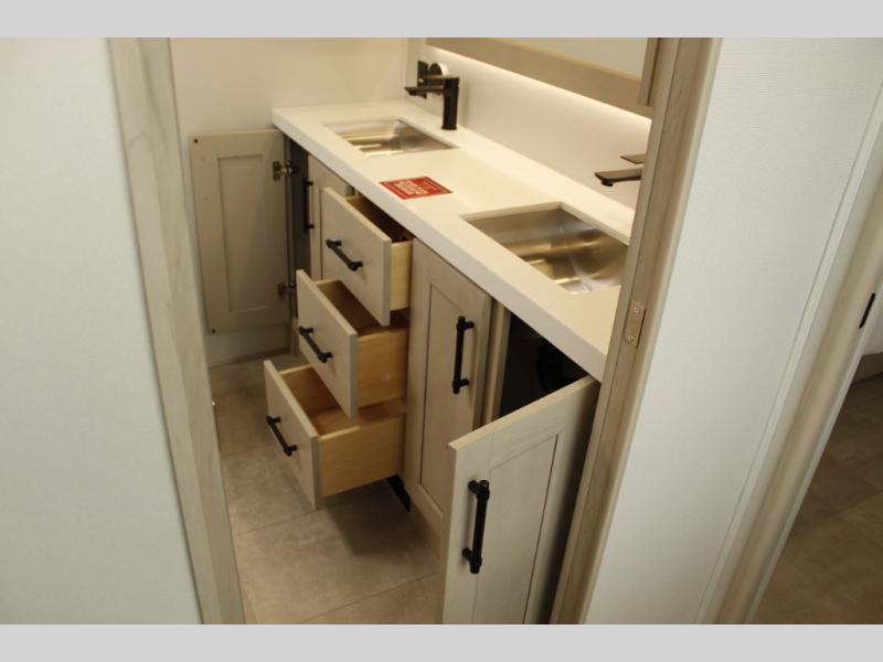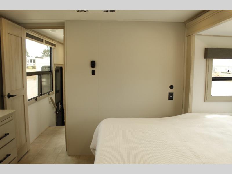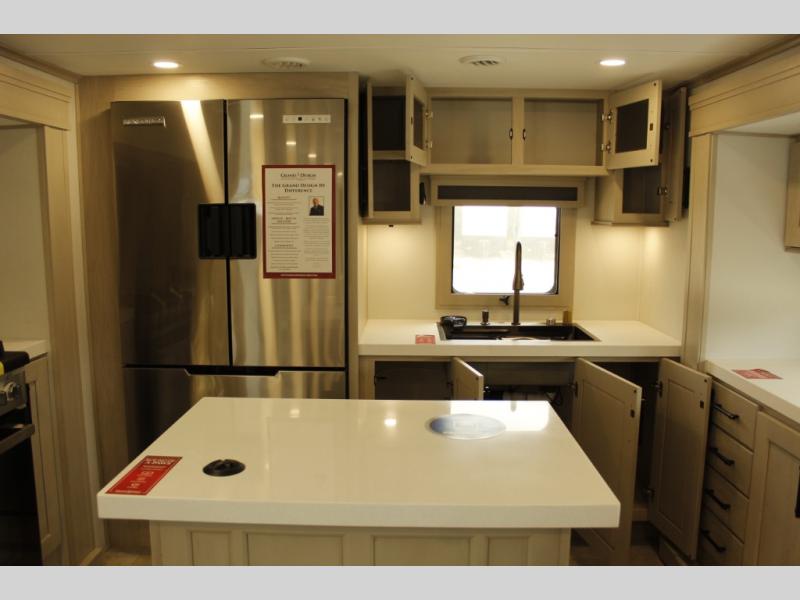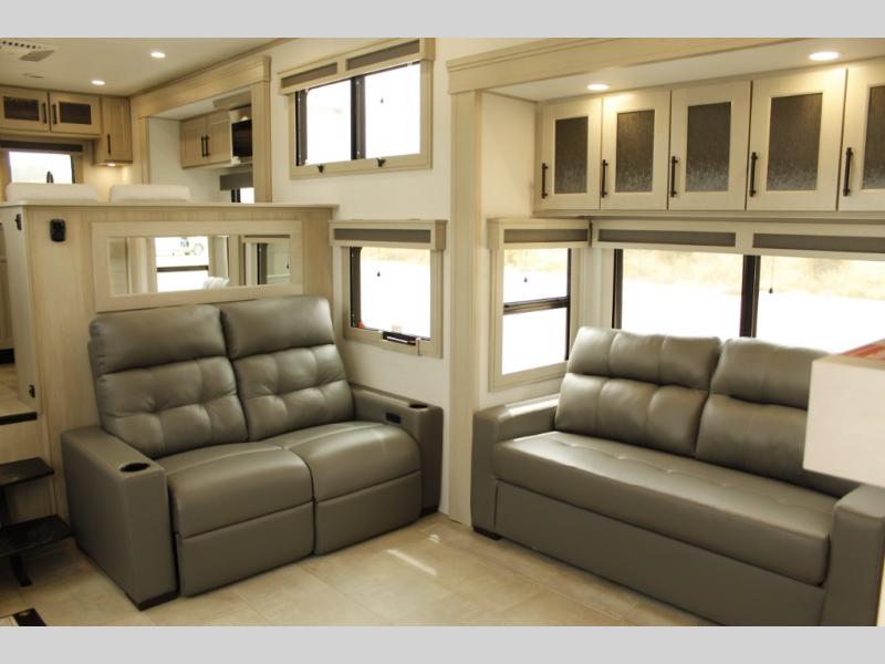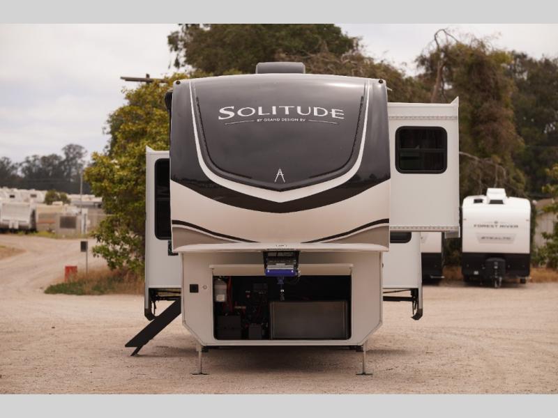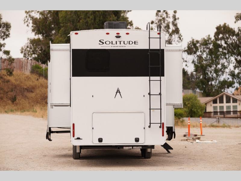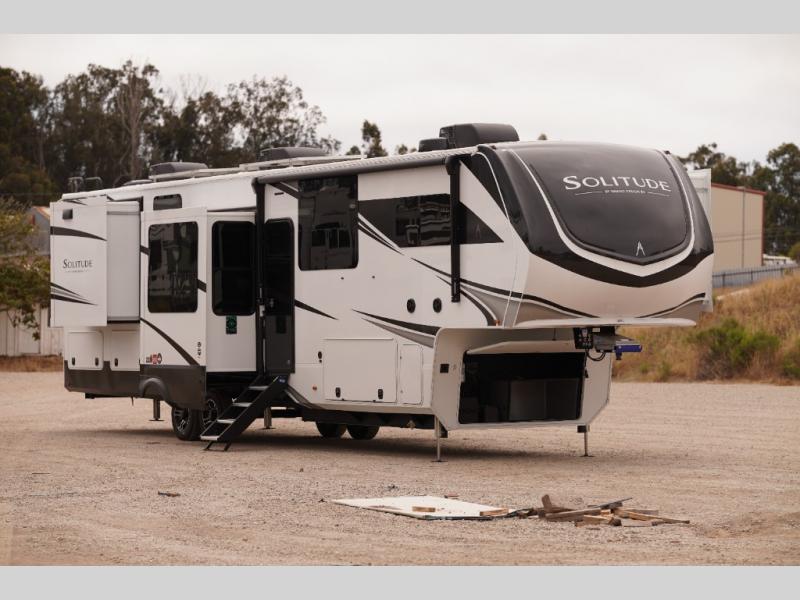 Each Solitude fifth wheel by Grand Design features a 101" wide-body construction, heavy duty 8,000 lb. axles, frameless tinted windows, and high-gloss gel coat sidewalls. You can camp year around thanks to the Weather-Tek Package that includes a 35K BTU high-capacity furnace, an all-in-one enclosed and heated utility center, and a fully enclosed underbelly with heated tanks and storage. Inside, you'll love the premium roller shades, hardwood cabinet doors, solid surface countertops, plus residential finishes throughout to make you truly feel at home. Each model also includes a MORryde CRE3000 suspension system, self adjusting brakes, and a MORryde pin box that will provide smooth towing from home to campground. Affordable luxury is possible with the Solitude fifth wheels; choose yours today!