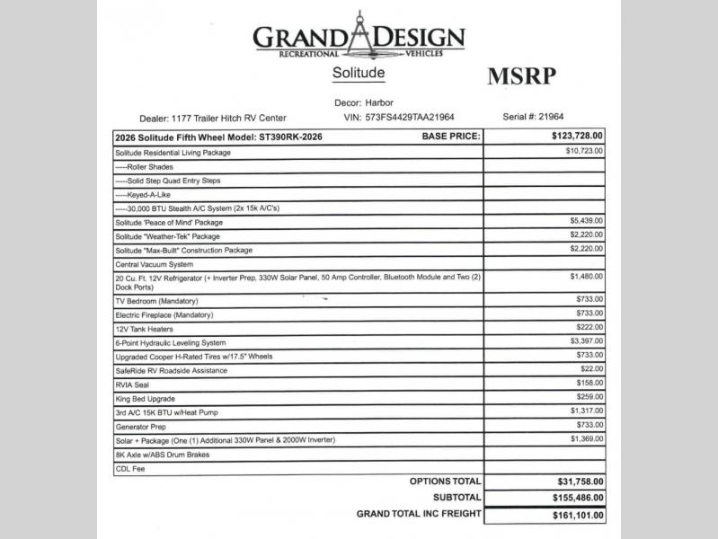 SALE PRICE INCLUDES UPGRADED 1,360W SOLAR WITH 2 LITHIUM BATTERIES OR 6 VOLTS, FIFTH WHEEL HITCH + INSTALL, DELUXE AWNING TOPPERS ON ALL SLIDES. PLUS THE MEGA PLATINUM RV STARTER KIT! NO HIDDEN FEES!