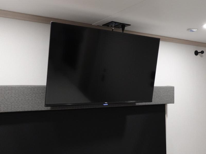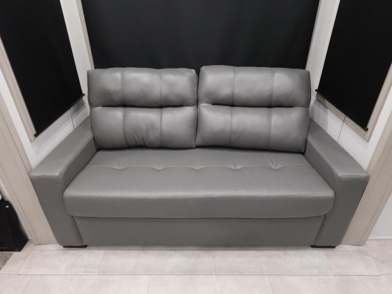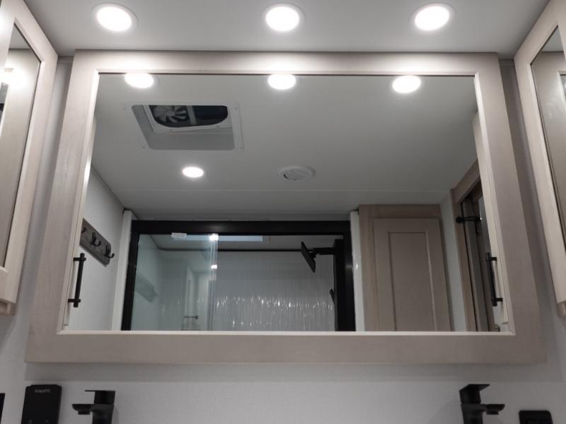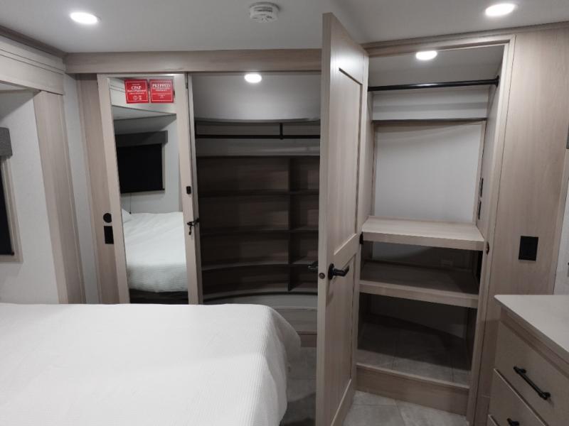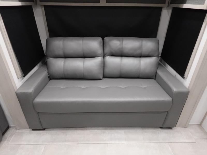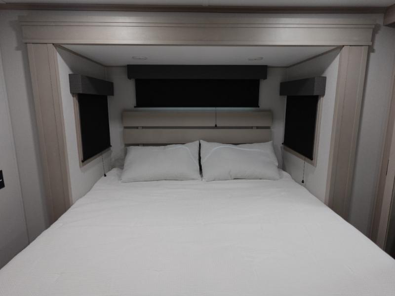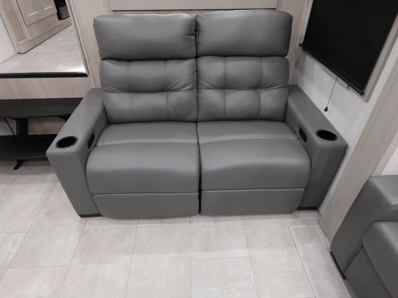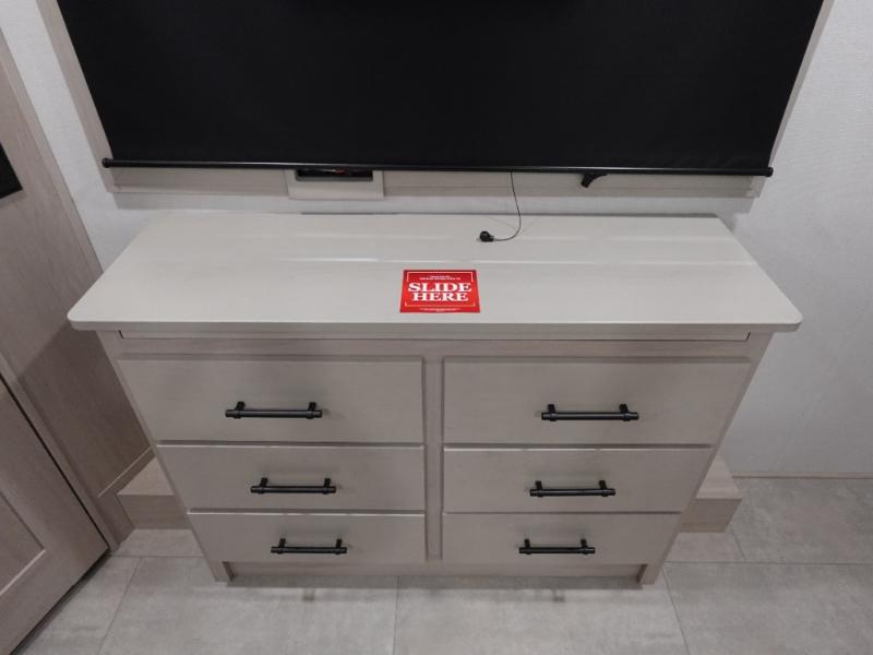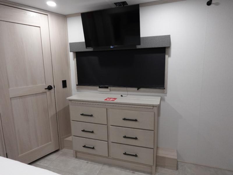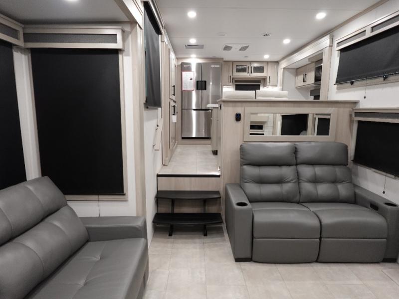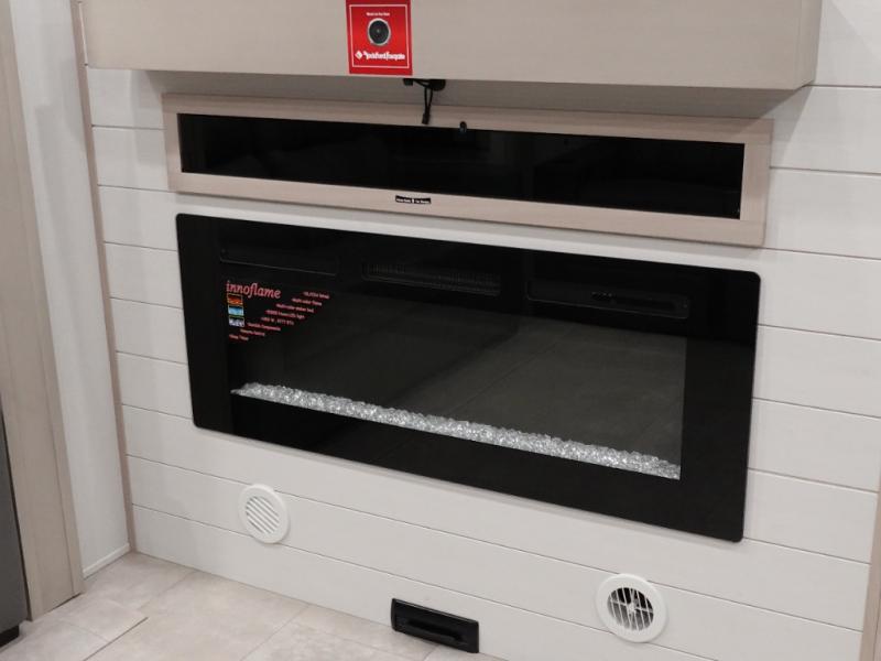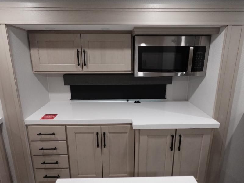 Enjoy each and every vacation, month-long trips, or even extended stays at an RV park in this spacious fifth wheel! The raised rear kitchen gives the cook plenty of room to whip up any type of meal using the stainless steel appliances including a built-in oven, an oversized pantry, and the raised bar top will provide you even more counter space on top of dining with two chairs that overlook the middle living area. Relaxing is made easy thanks to two tri-fold sofas and theatre seating while watching the big game on the LED Smart TV and enjoying the fireplace below. At night, retire to your own King bed which slides out to provide more floor space, and you can store your clothes in the slide top dresser and front closet.