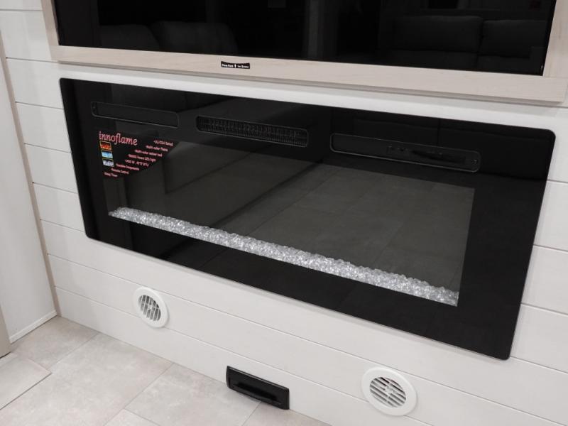 Enjoy each and every vacation, month-long trips, or even extended stays at an RV park in this spacious fifth wheel! The raised rear kitchen gives the cook plenty of room to whip up any type of meal using the stainless steel appliances including a built-in oven, an oversized pantry, and the raised bar top will provide you even more counter space on top of dining with two chairs that overlook the middle living area. Relaxing is made easy thanks to two tri-fold sofas and theatre seating while watching the big game on the LED Smart TV and enjoying the fireplace below. At night, retire to your own queen bed which slides out to provide more floor space, and you can store your clothes in the slide top dresser and front closet with washer and dryer prep.