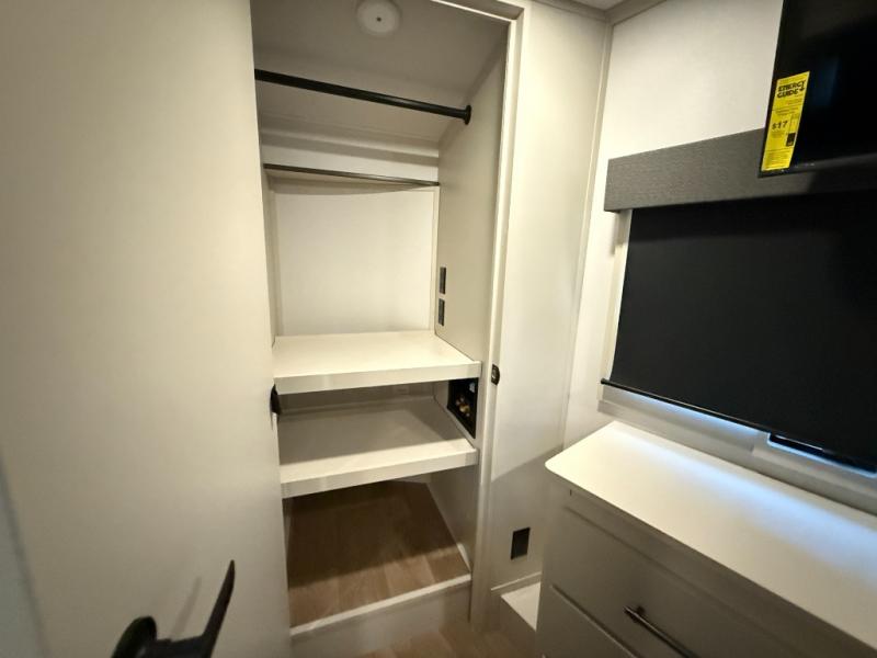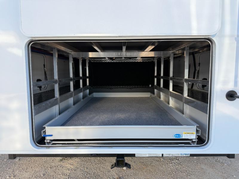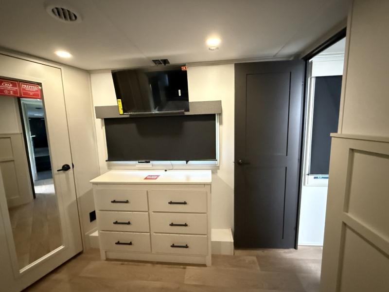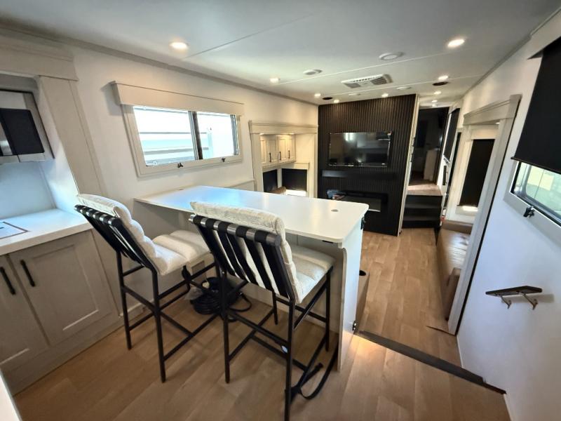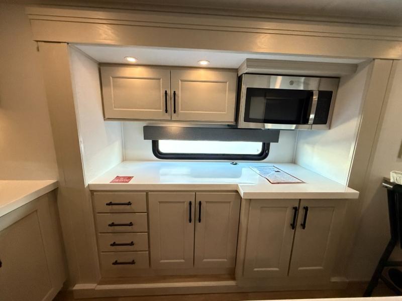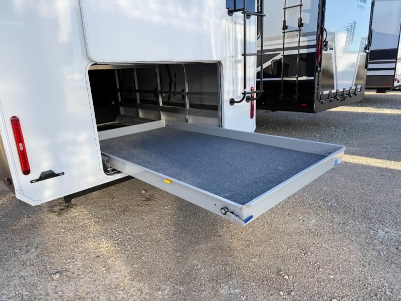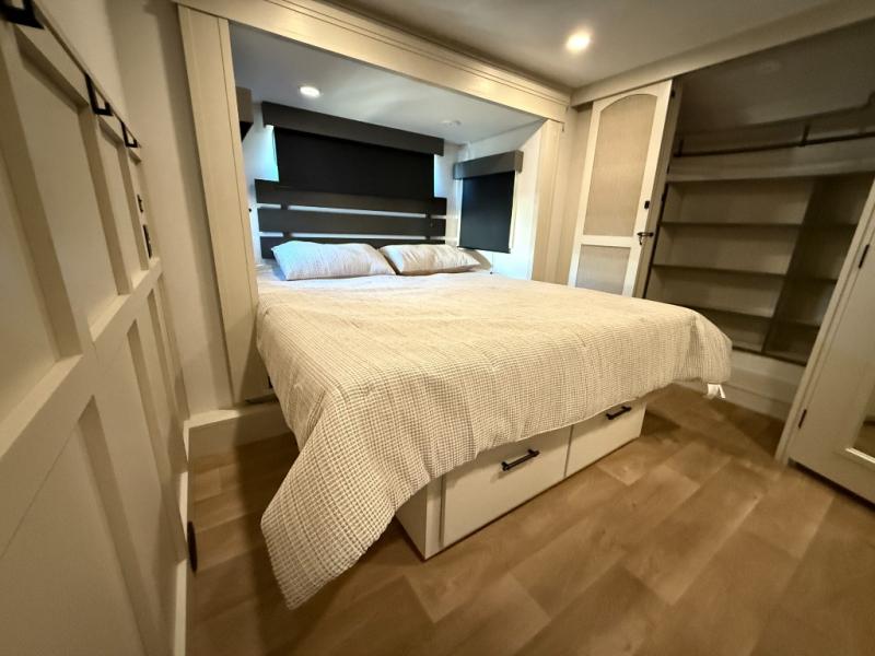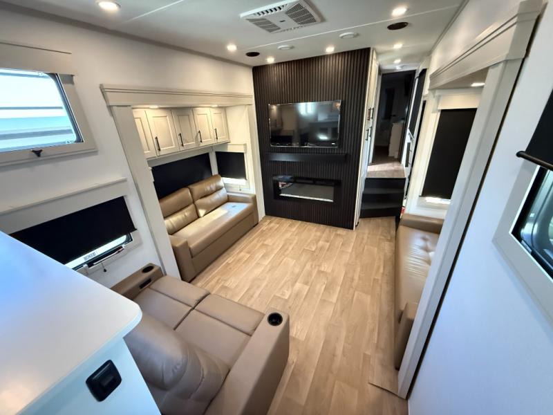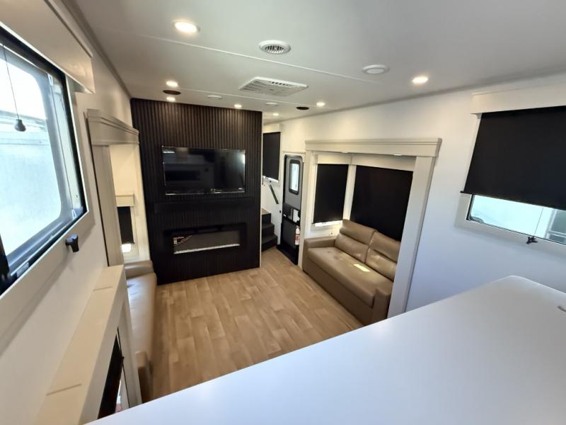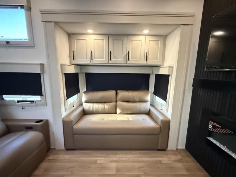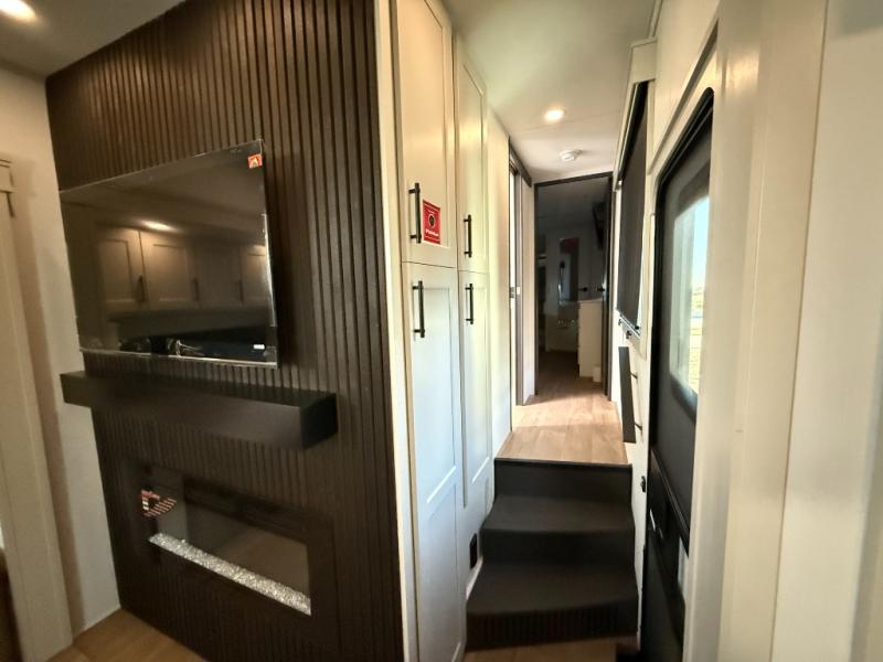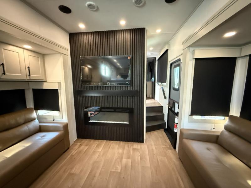 Enjoy each and every vacation, month-long trips, or even extended stays at an RV park in this spacious fifth wheel! The raised rear kitchen gives the cook plenty of room to whip up any type of meal using the stainless steel appliances including a built-in oven, an oversized pantry, and the raised bar top will provide you even more counter space on top of dining with two chairs that overlook the middle living area. Relaxing is made easy thanks to two tri-fold sofas and theatre seating while watching the big game on the LED Smart TV and enjoying the fireplace below. At night, retire to your own queen bed which slides out to provide more floor space, and you can store your clothes in the slide top dresser and front closet with washer and dryer prep.