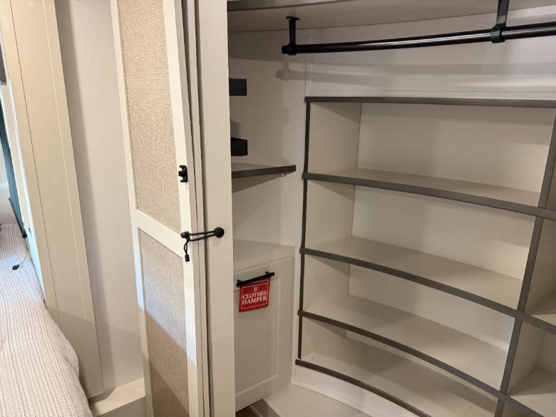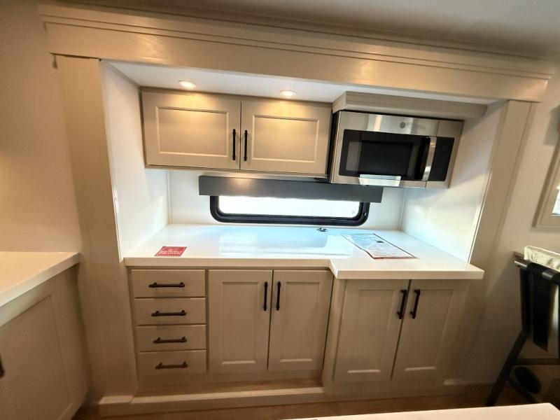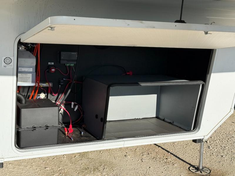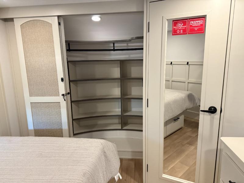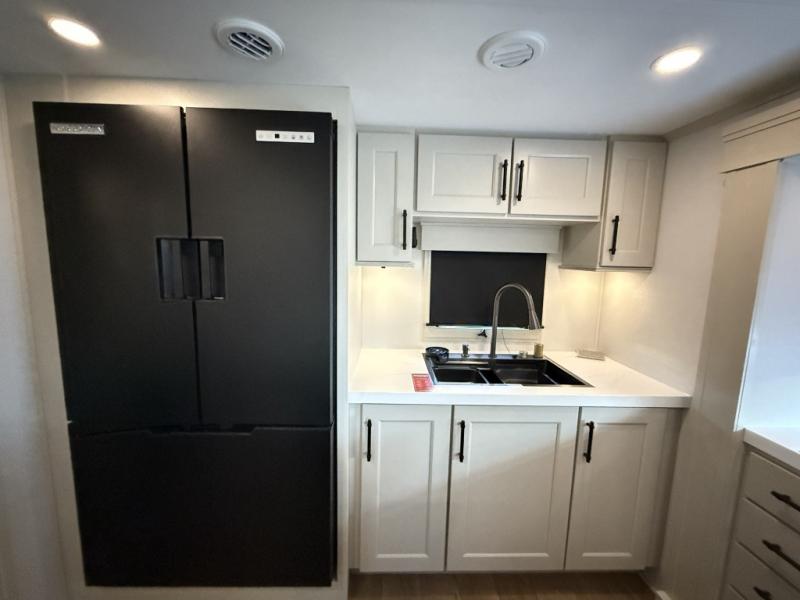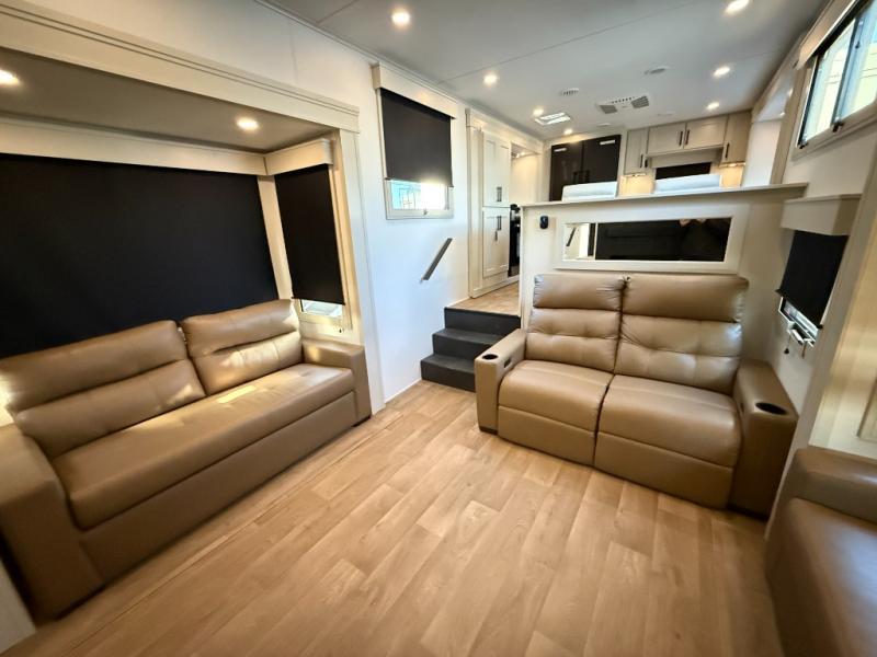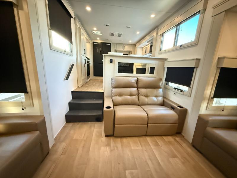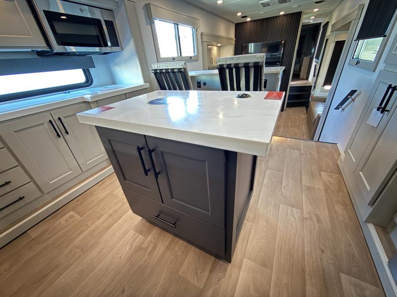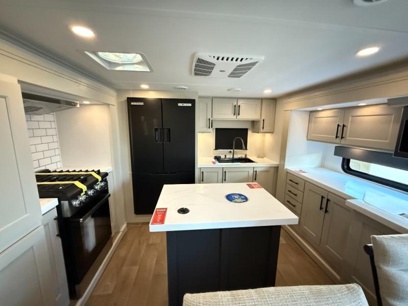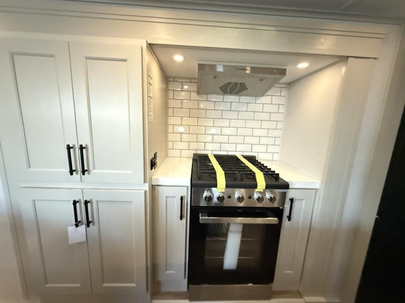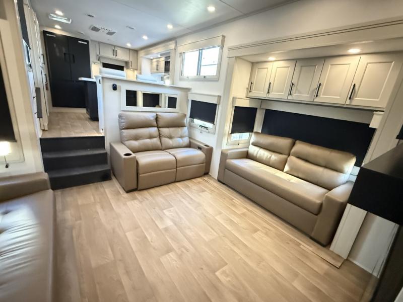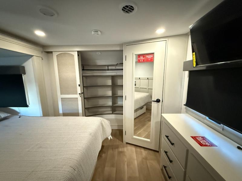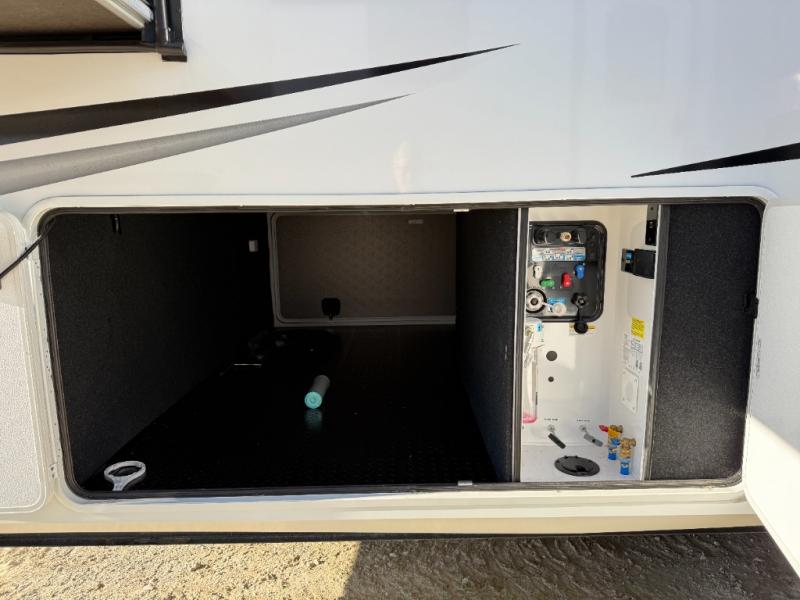 Enjoy each and every vacation, month-long trips, or even extended stays at an RV park in this spacious fifth wheel! The raised rear kitchen gives the cook plenty of room to whip up any type of meal using the stainless steel appliances including a built-in oven, an oversized pantry, and the raised bar top will provide you even more counter space on top of dining with two chairs that overlook the middle living area. Relaxing is made easy thanks to two tri-fold sofas and theatre seating while watching the big game on the LED Smart TV and enjoying the fireplace below. At night, retire to your own queen bed which slides out to provide more floor space, and you can store your clothes in the slide top dresser and front closet with washer and dryer prep.