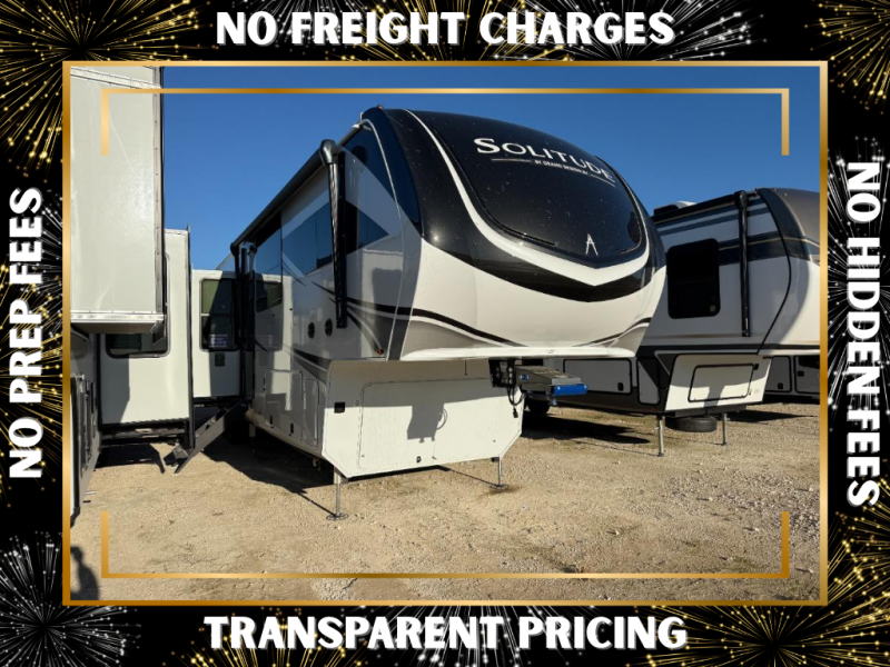 Each Solitude fifth wheel by Grand Design features a 101" wide-body construction, heavy duty 8,000 lb. axles, frameless tinted windows, and high-gloss gel coat sidewalls. You can camp year around thanks to the Weather-Tek Package that includes a 35K BTU high-capacity furnace, an all-in-one enclosed and heated utility center, and a fully enclosed underbelly with heated tanks and storage. Inside, you'll love the premium roller shades, hardwood cabinet doors, solid surface countertops, plus residential finishes throughout to make you truly feel at home. Each model also includes a MORryde CRE3000 suspension system, self adjusting brakes, and a MORryde pin box that will provide smooth towing from home to campground. Affordable luxury is possible with the Solitude fifth wheels; choose yours today!