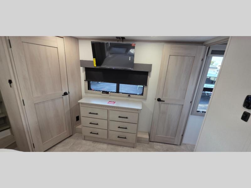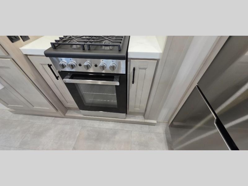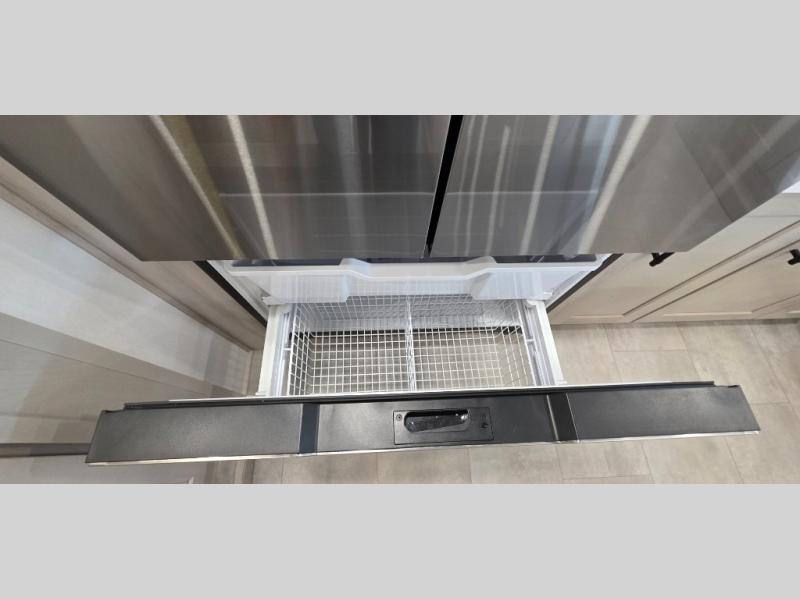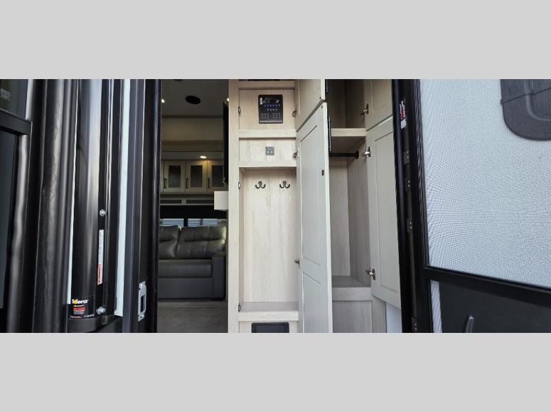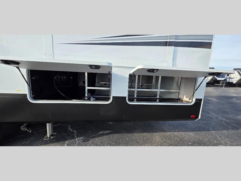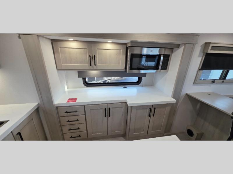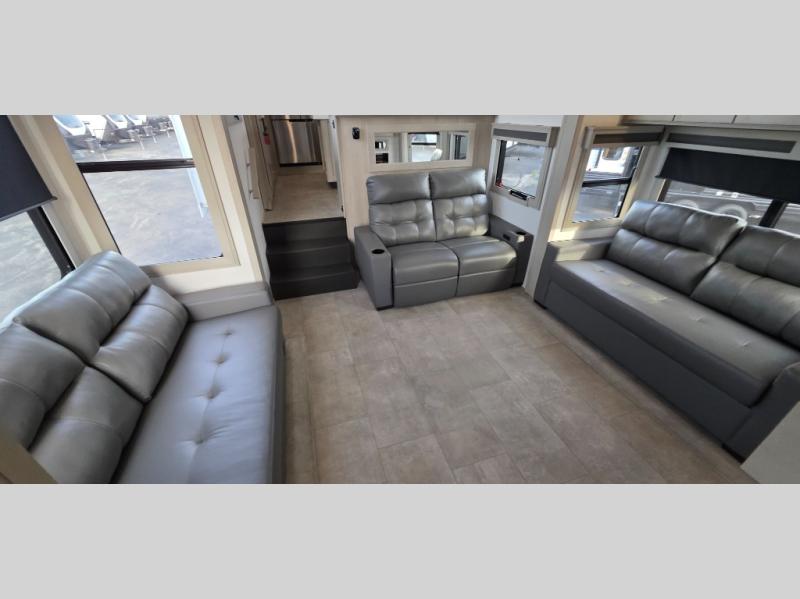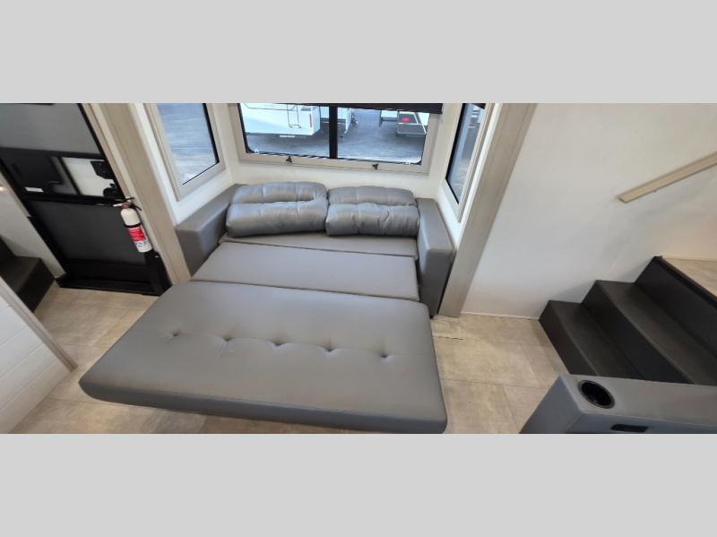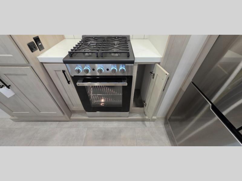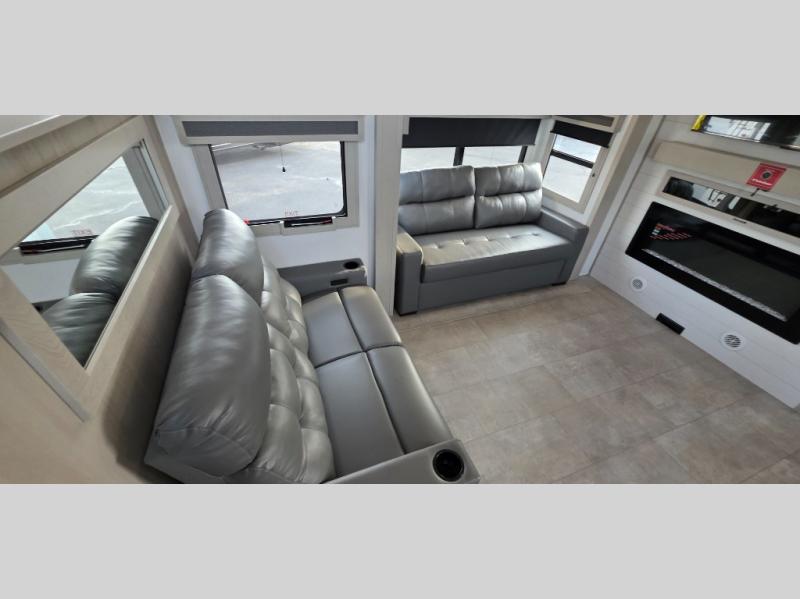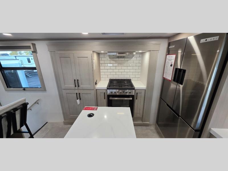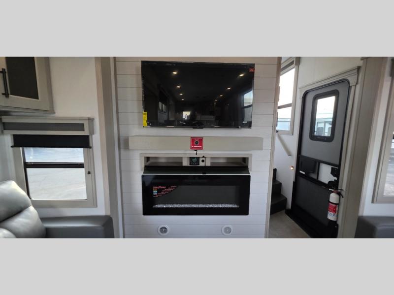Enjoy each and every vacation, month-long trips, or even extended stays at an RV park in this spacious fifth wheel! The raised rear kitchen gives the cook plenty of room to whip up any type of meal using the stainless steel appliances including a built-in oven, an oversized pantry, and the raised bar top will provide you even more counter space on top of dining with two chairs that overlook the middle living area. Relaxing is made easy thanks to two tri-fold sofas and theatre seating while watching the big game on the LED Smart TV and enjoying the fireplace below. At night, retire to your own queen bed which slides out to provide more floor space, and you can store your clothes in the slide top dresser and front closet with washer and dryer prep.