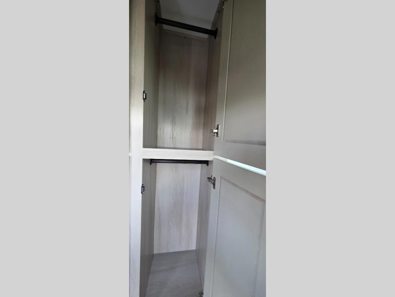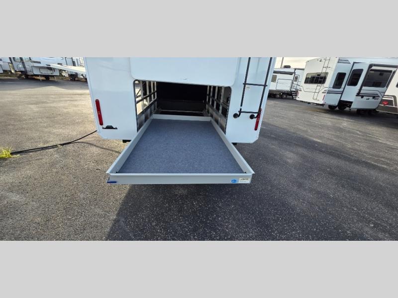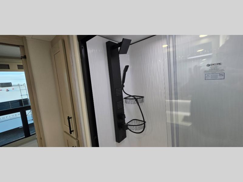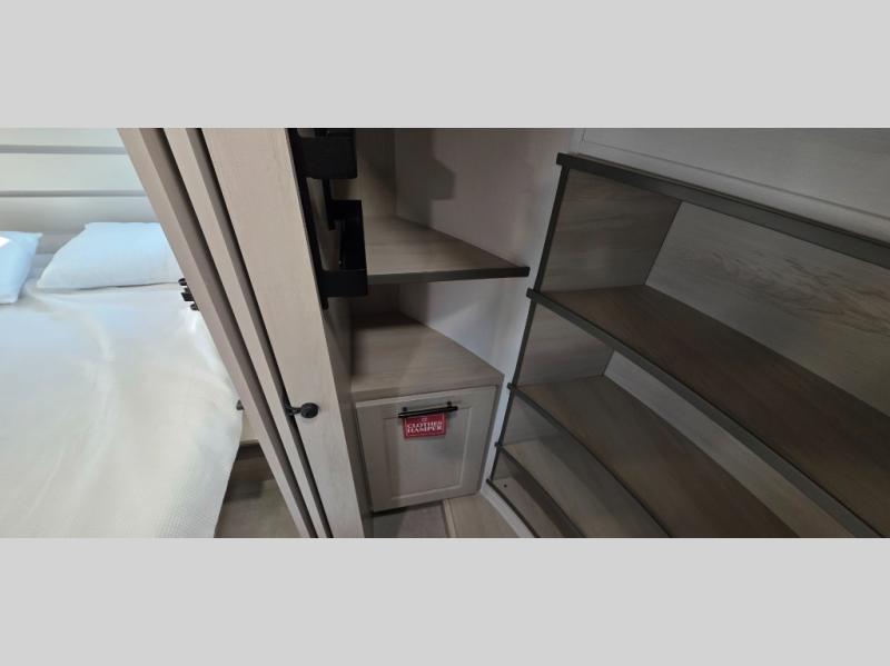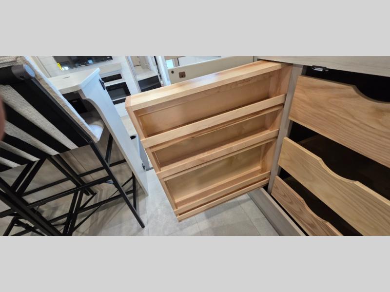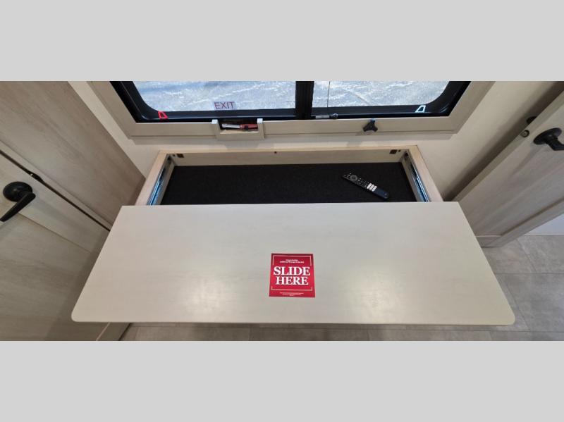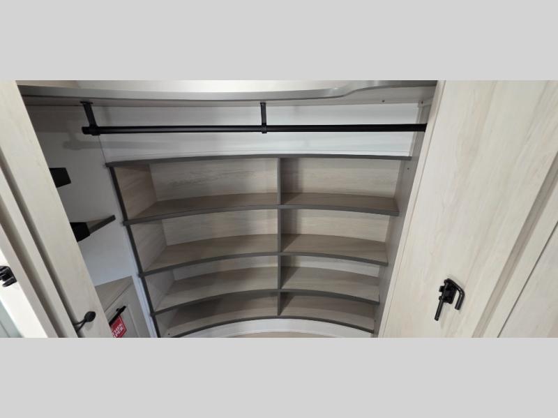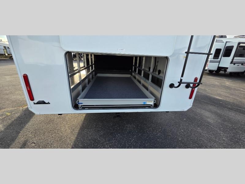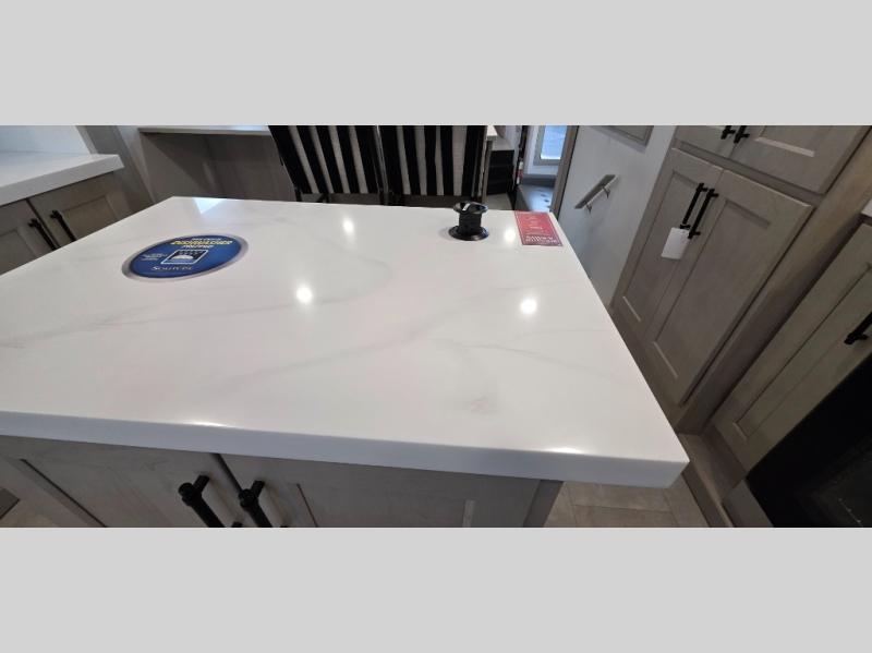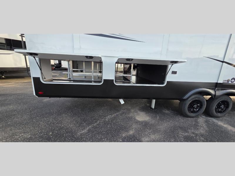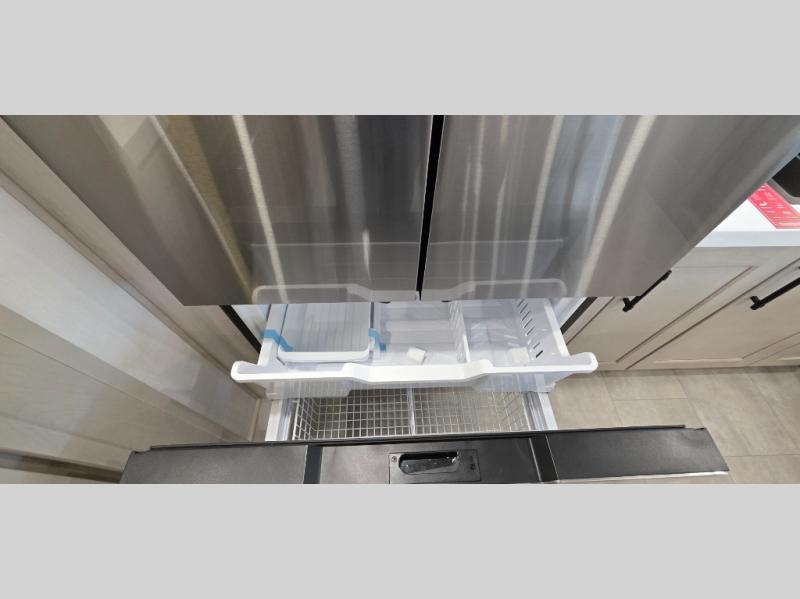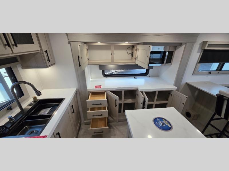 Enjoy each and every vacation, month-long trips, or even extended stays at an RV park in this spacious fifth wheel! The raised rear kitchen gives the cook plenty of room to whip up any type of meal using the stainless steel appliances including a built-in oven, an oversized pantry, and the raised bar top will provide you even more counter space on top of dining with two chairs that overlook the middle living area. Relaxing is made easy thanks to two tri-fold sofas and theatre seating while watching the big game on the LED Smart TV and enjoying the fireplace below. At night, retire to your own queen bed which slides out to provide more floor space, and you can store your clothes in the slide top dresser and front closet with washer and dryer prep.